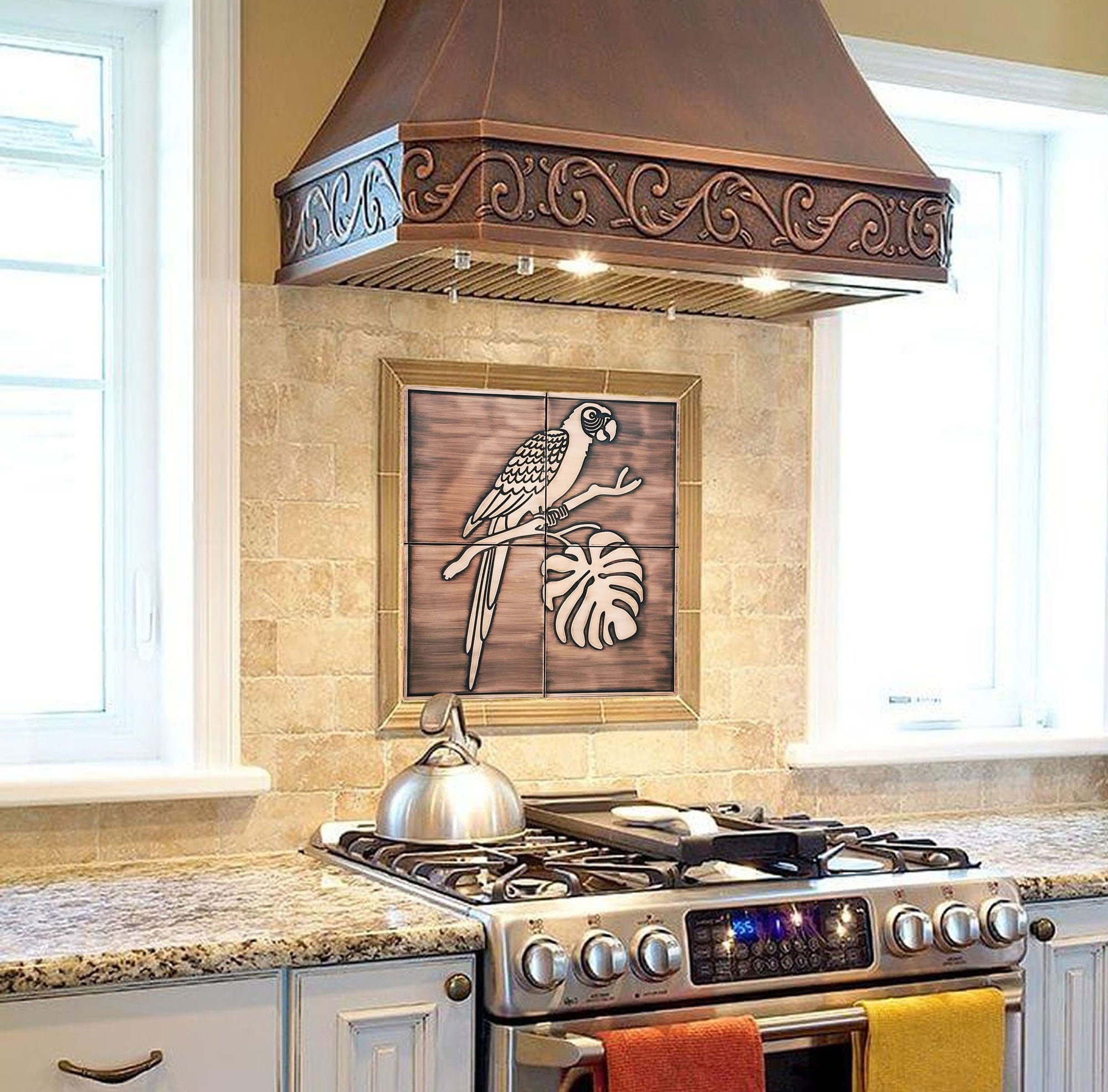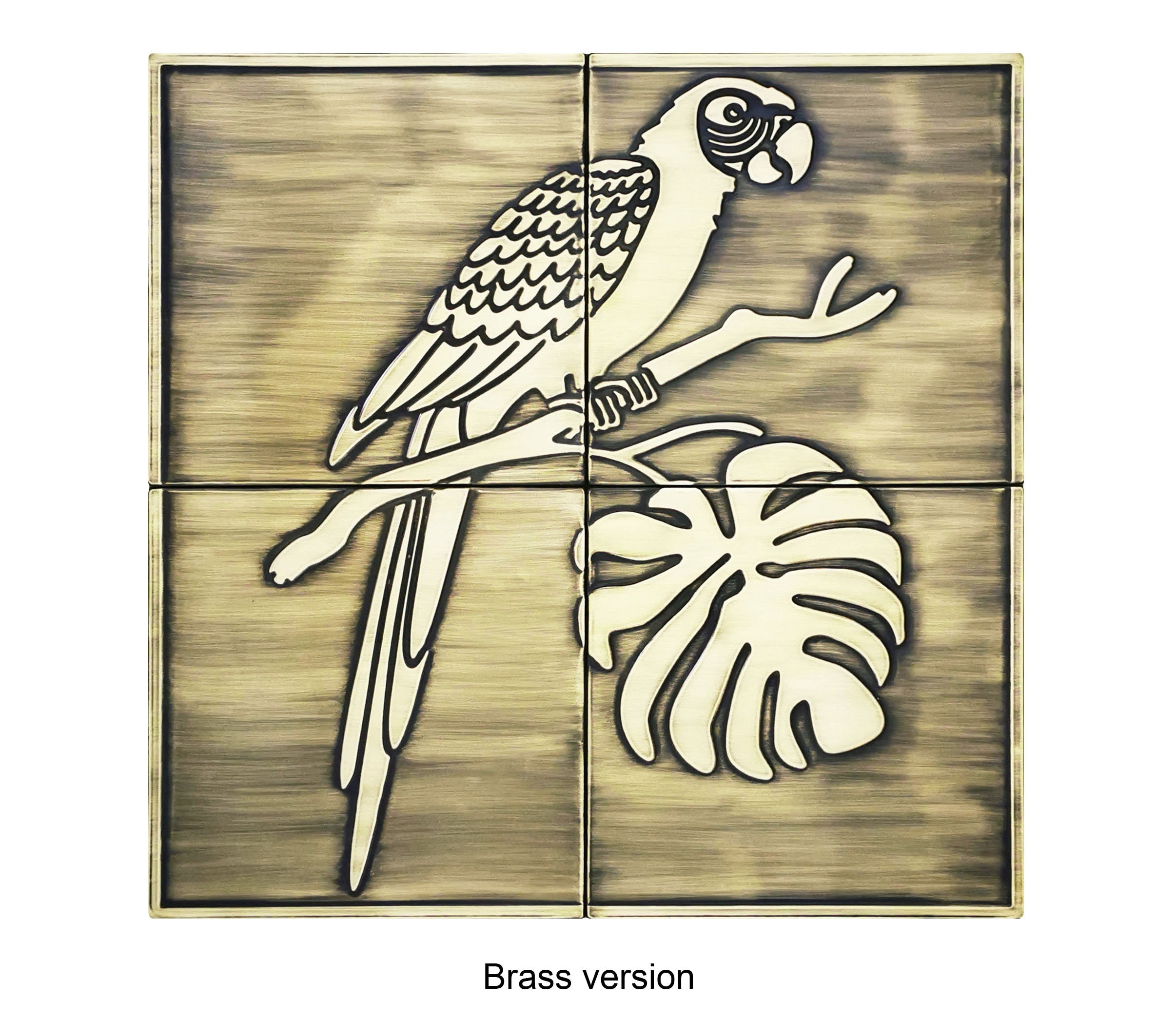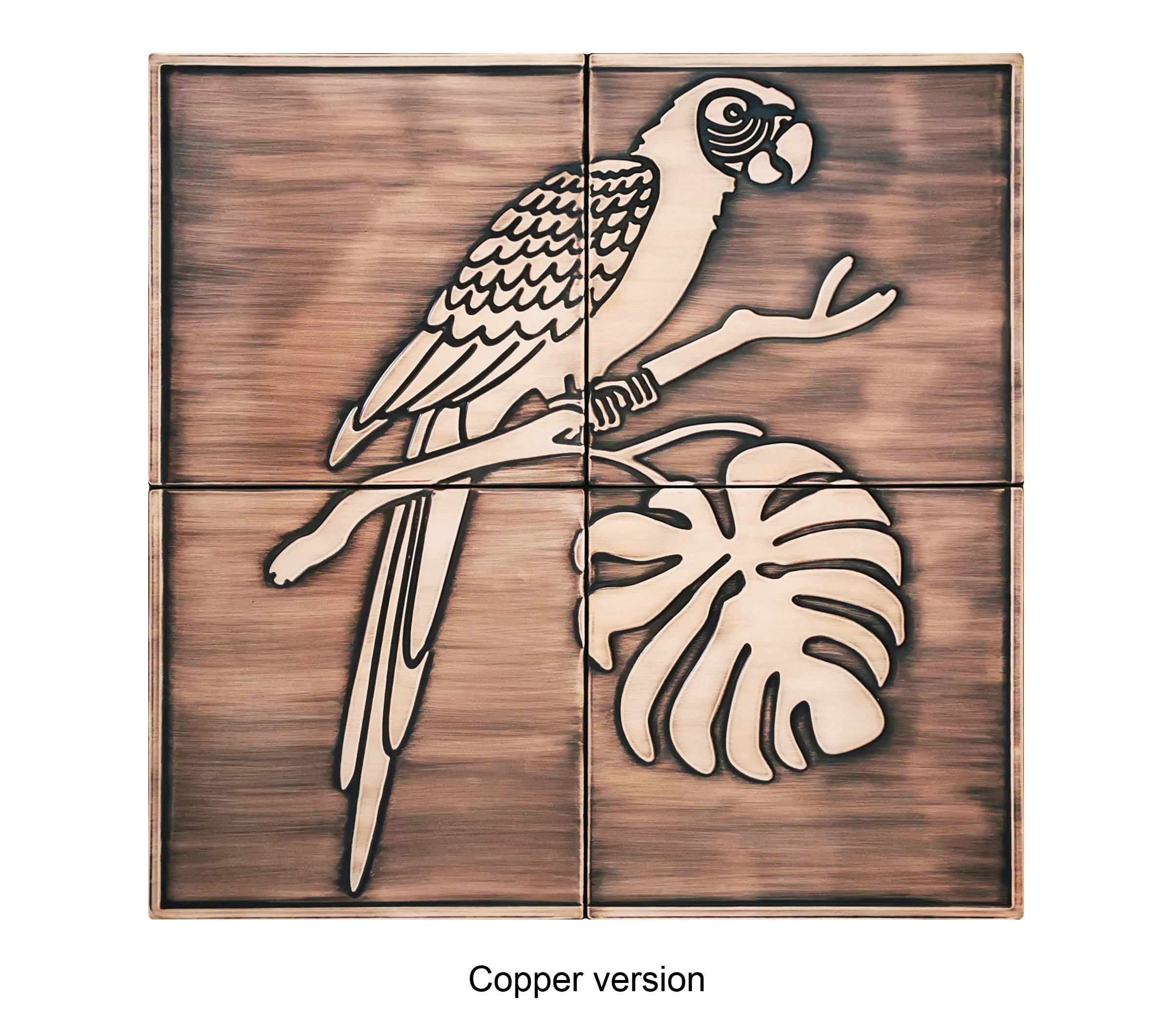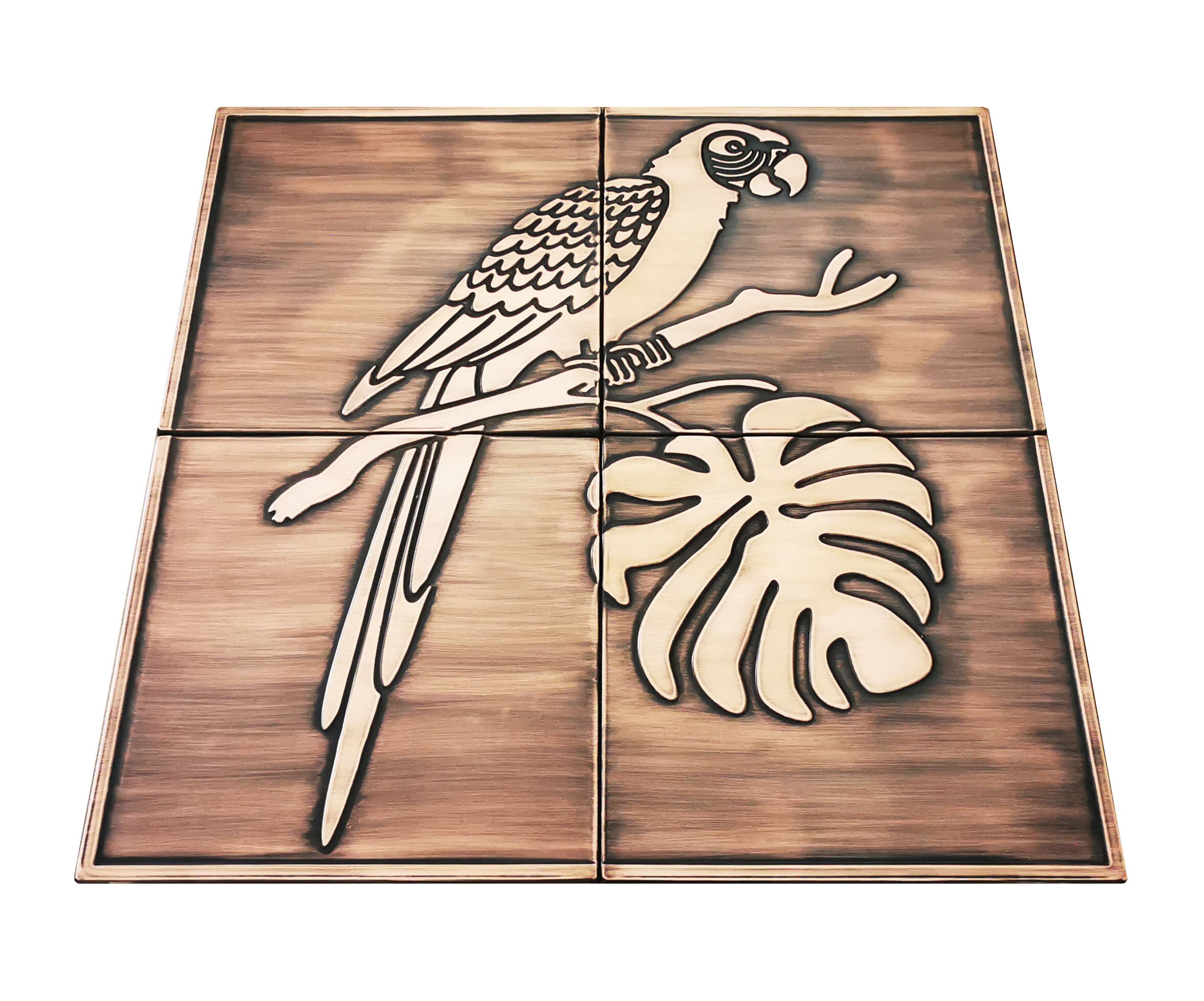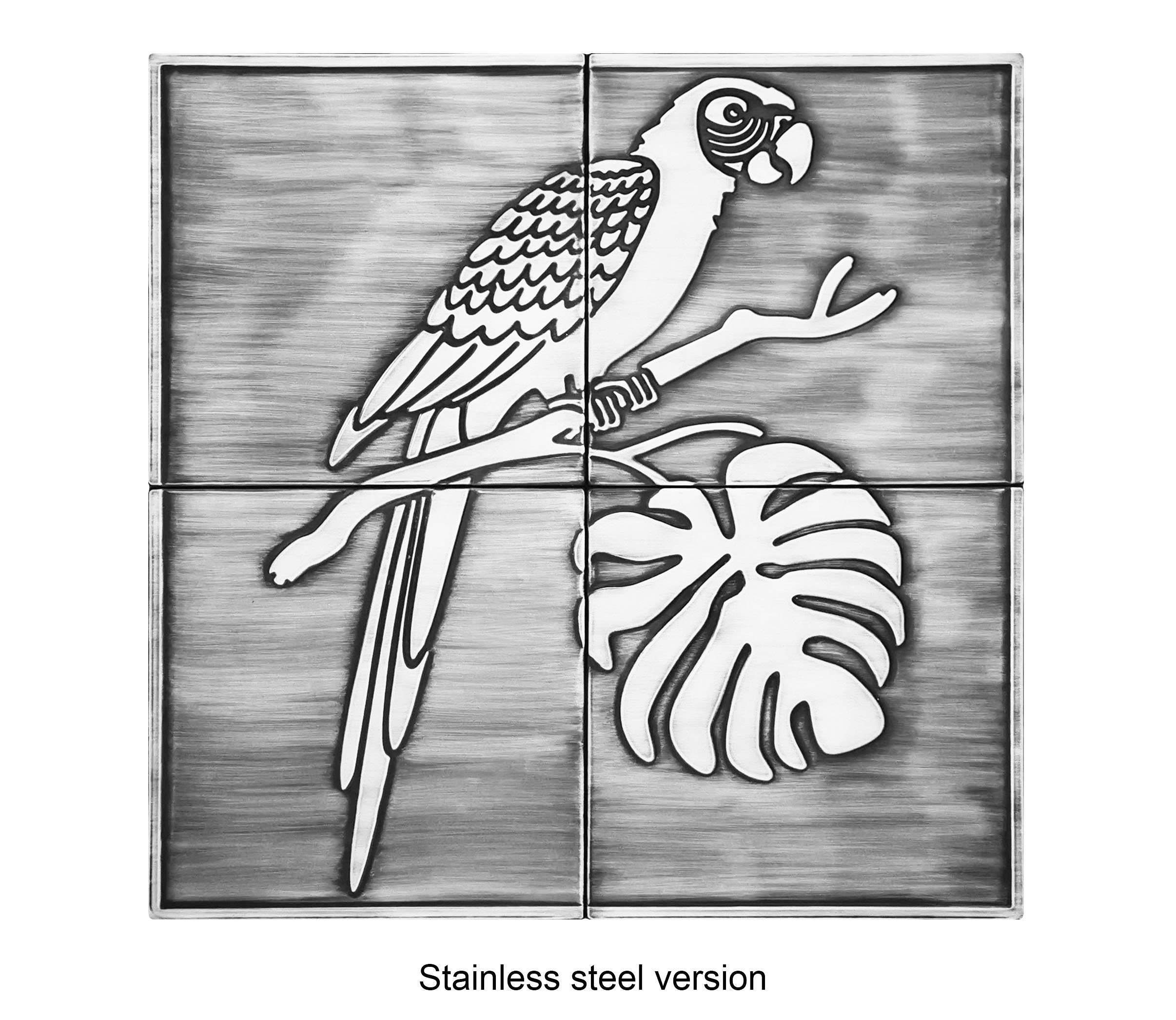 Cute parrot on a branch - Set of 4 Handmade tiles - 100% Brass, Copper or Stainless Steel. The perfect backsplash for birds lovers.