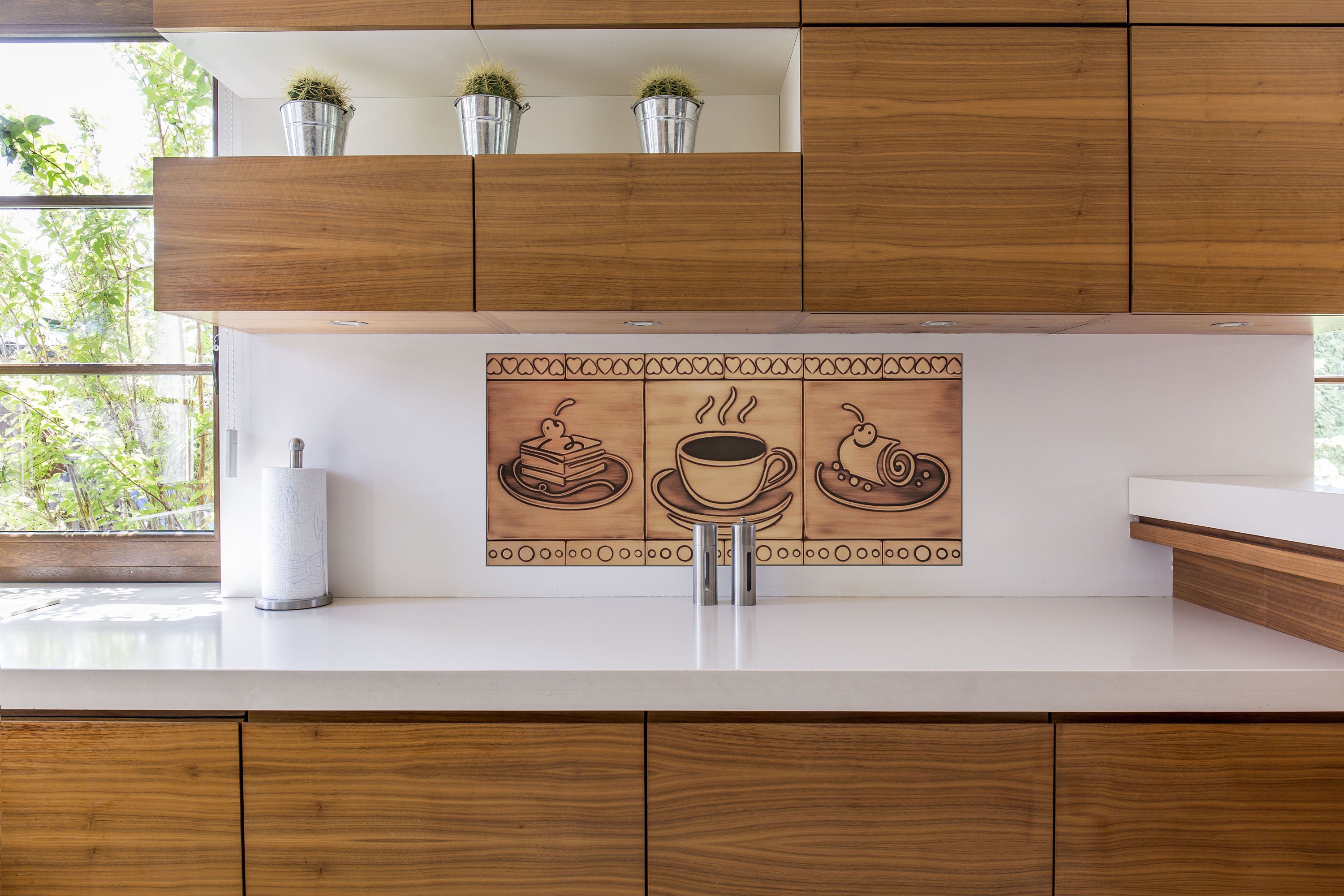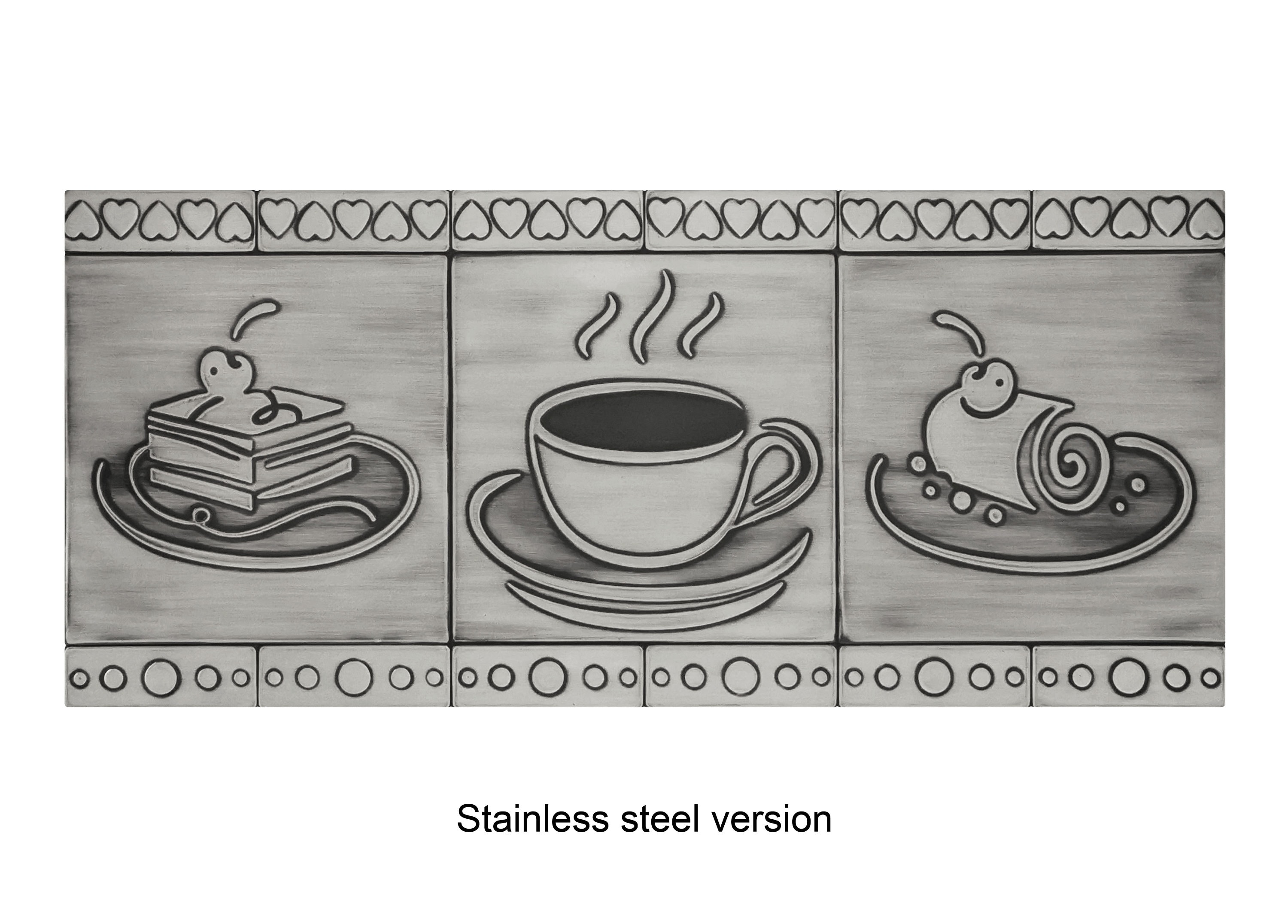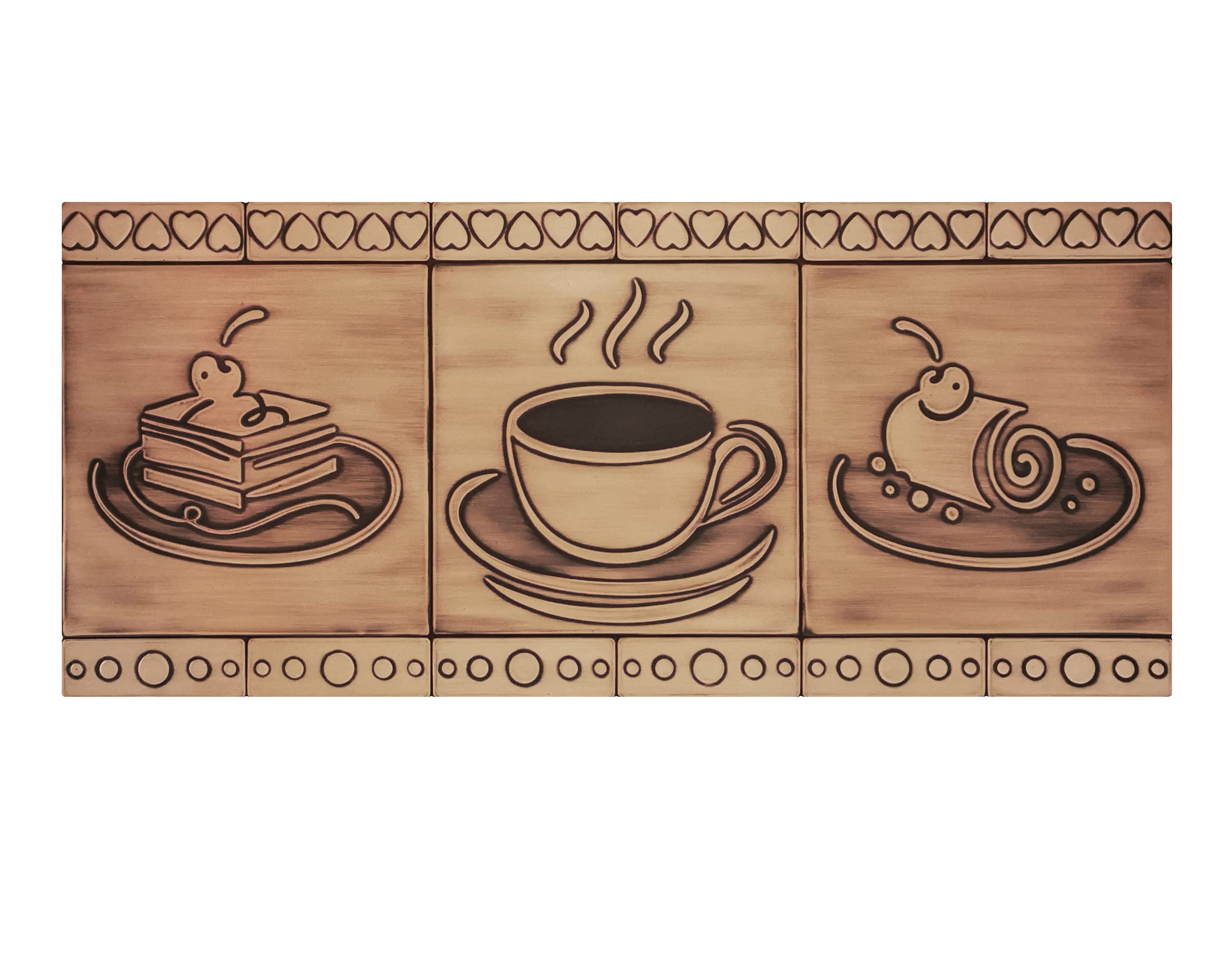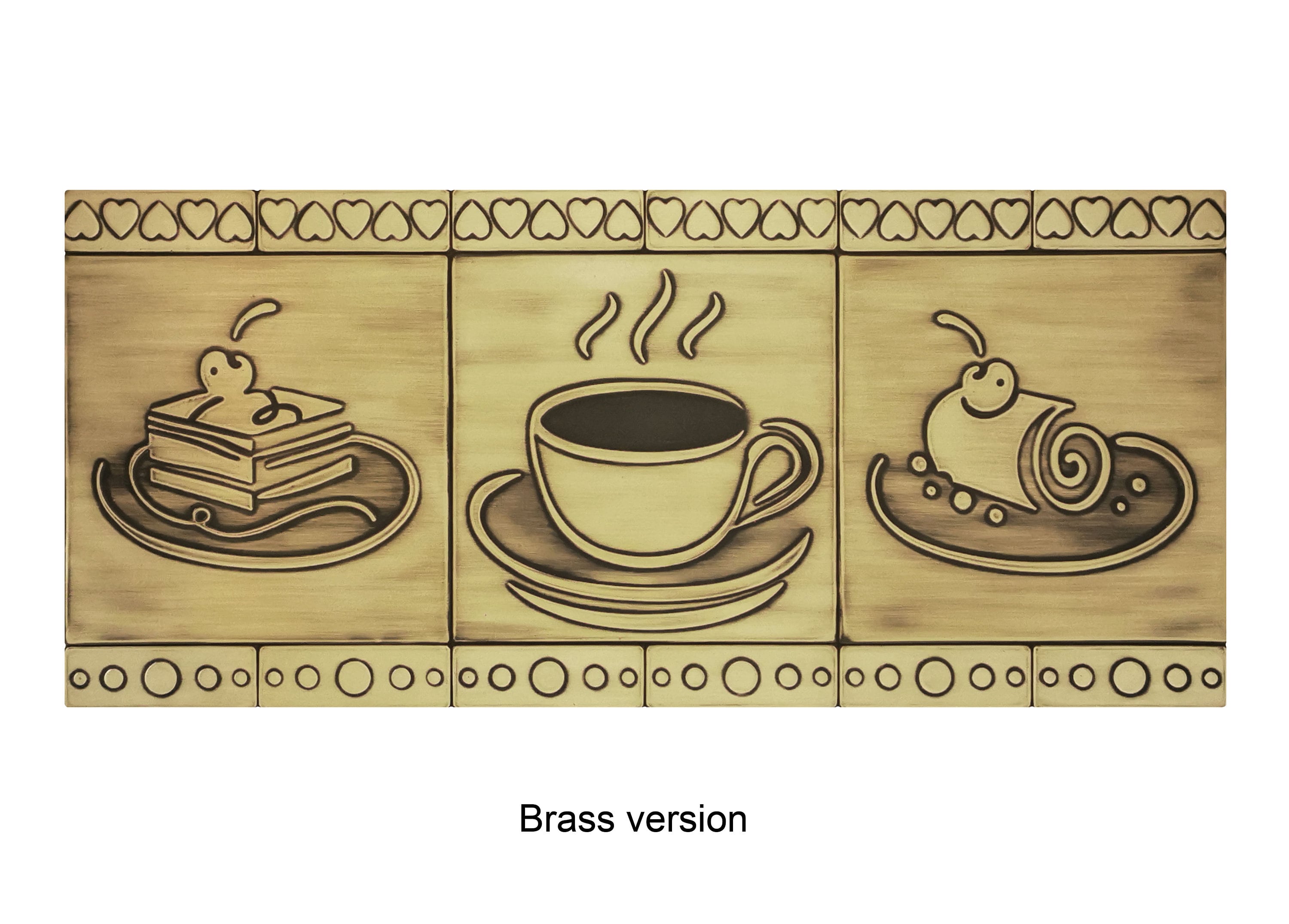 Cakes and coffee. A beautiful set of 15 handmade tiles. 100% Brass, Copper or Stainless Steel.
