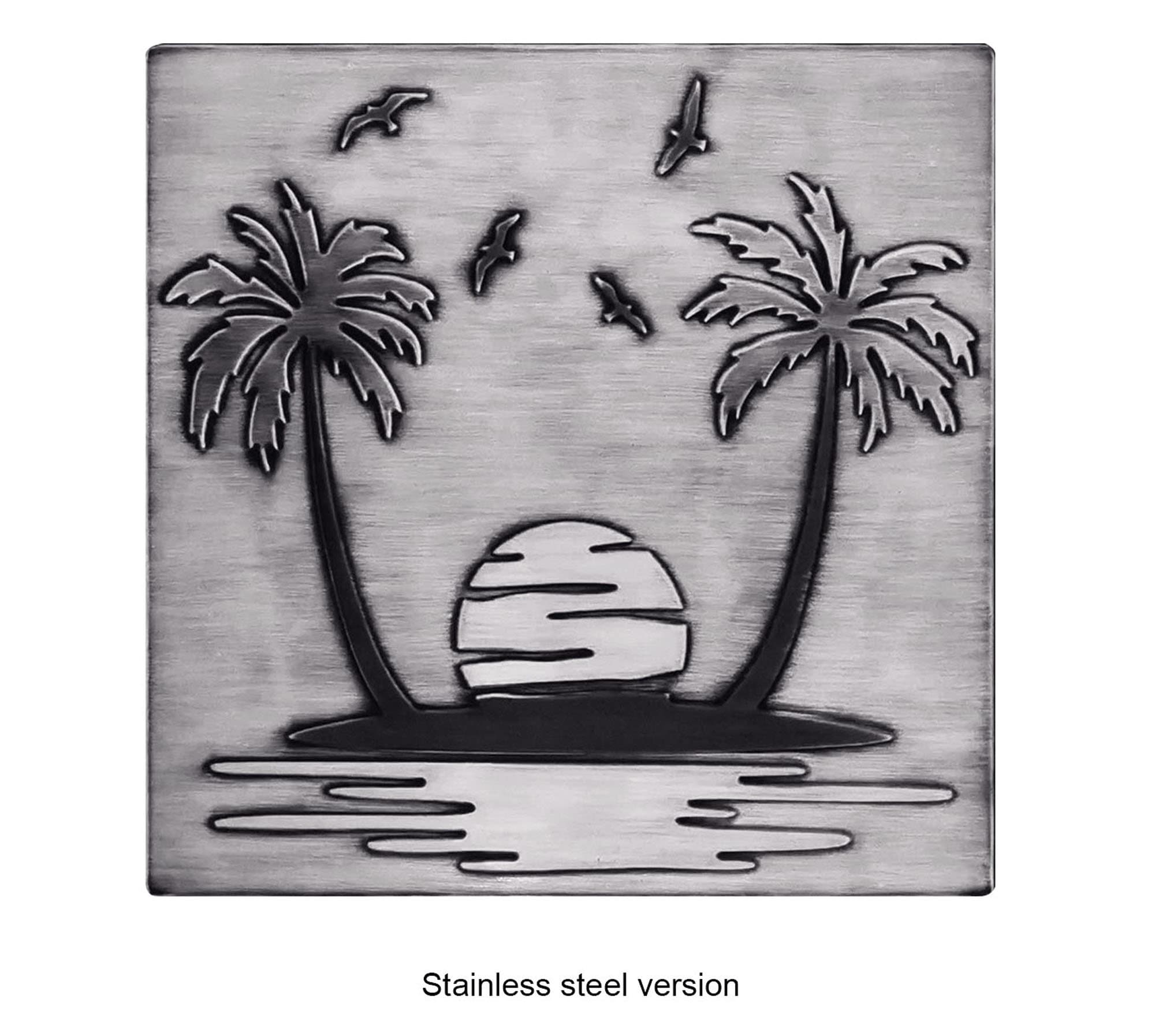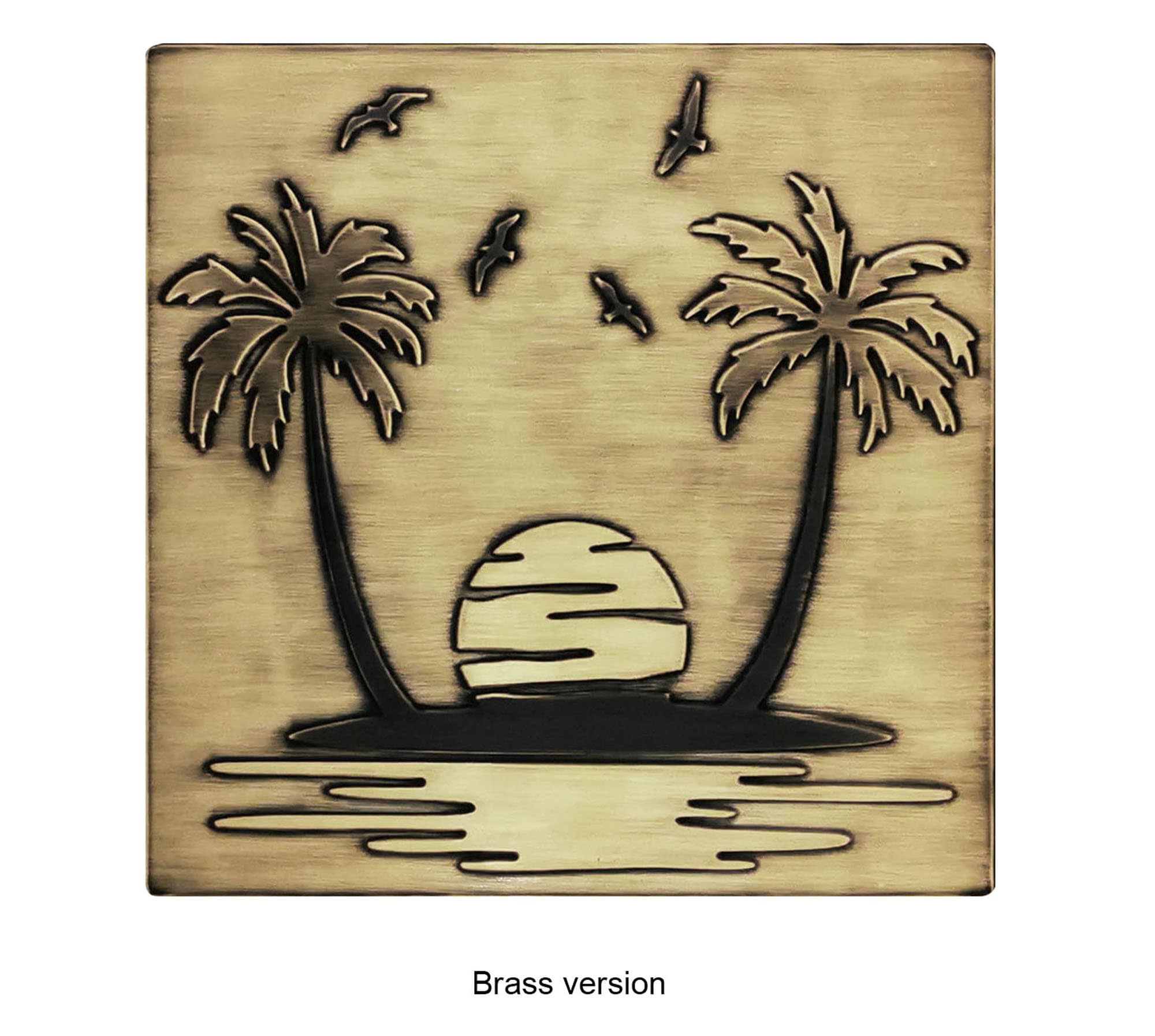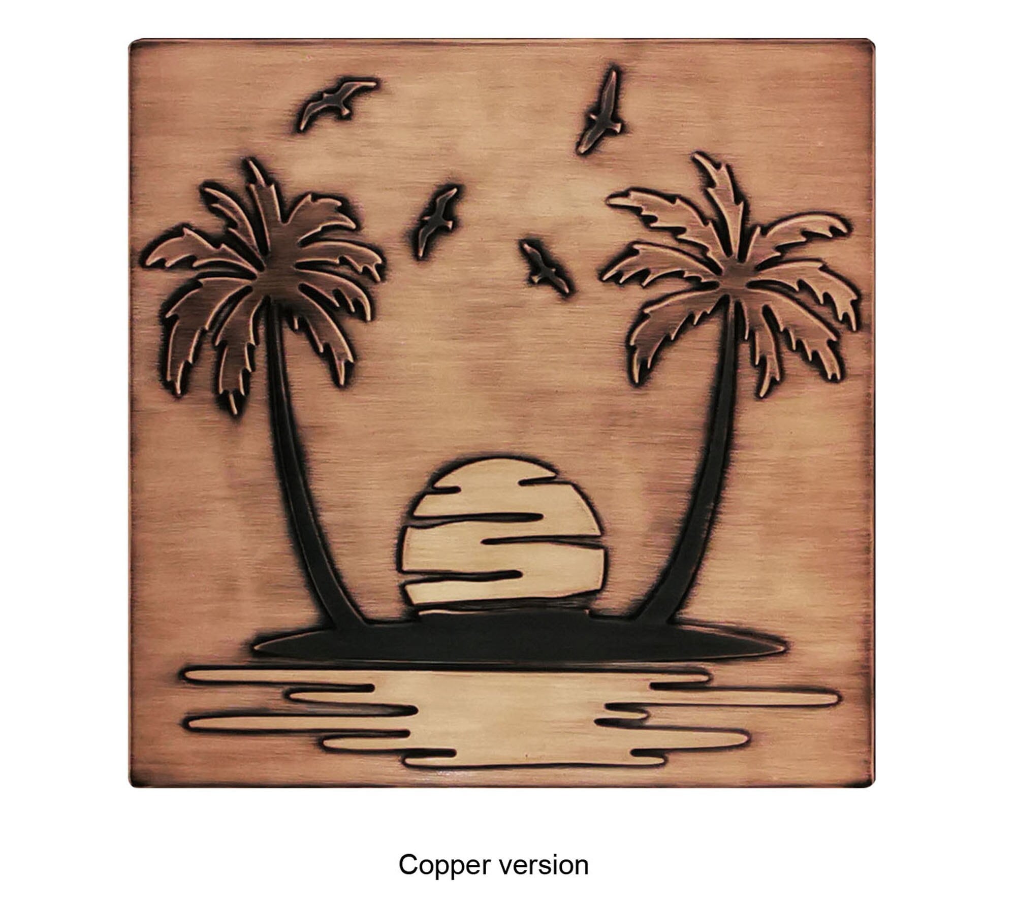 Paradise island - sand, palm trees, seagulls - Handmade Tile. 100% Copper, Stainless Steel or Brass
