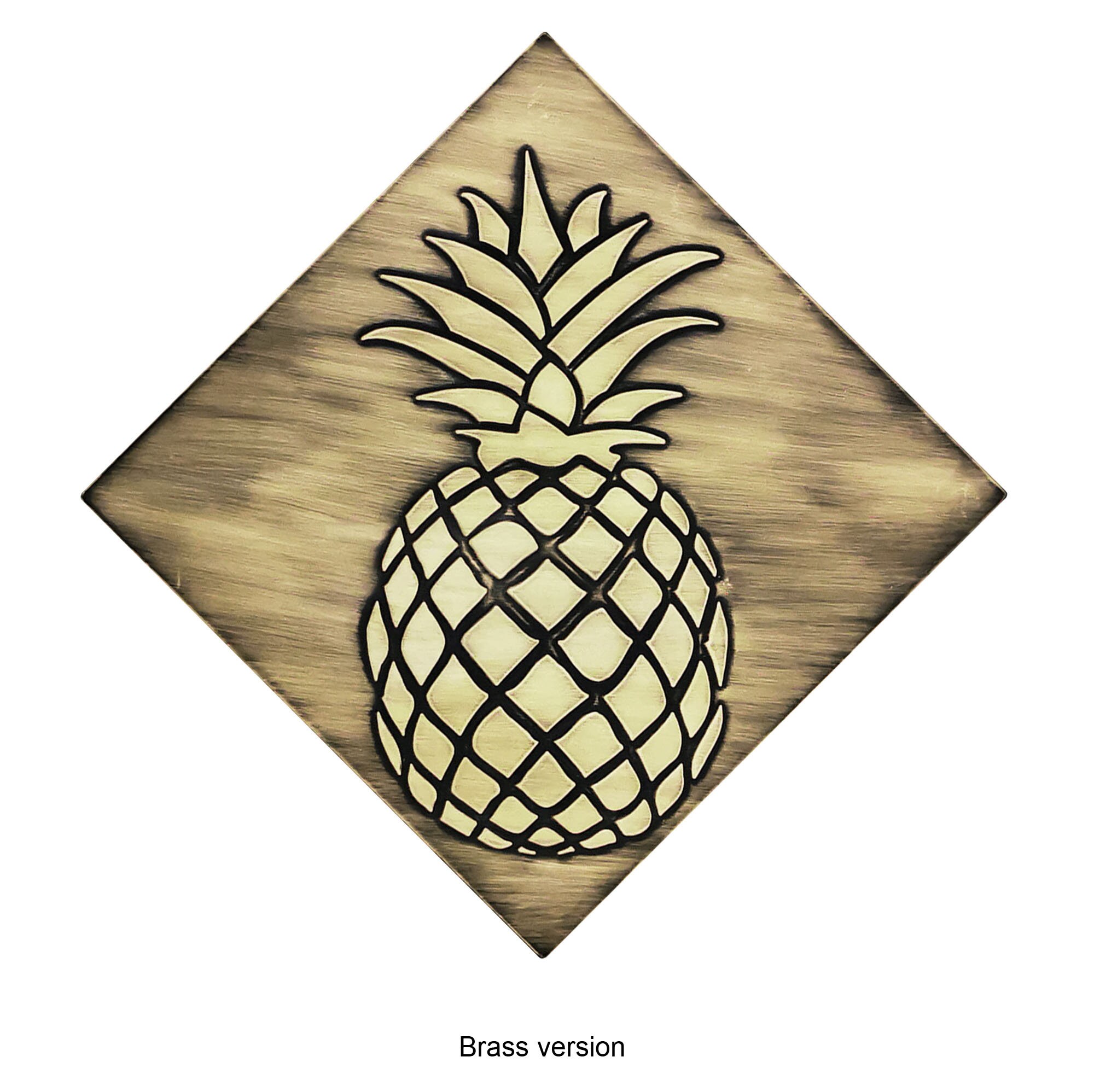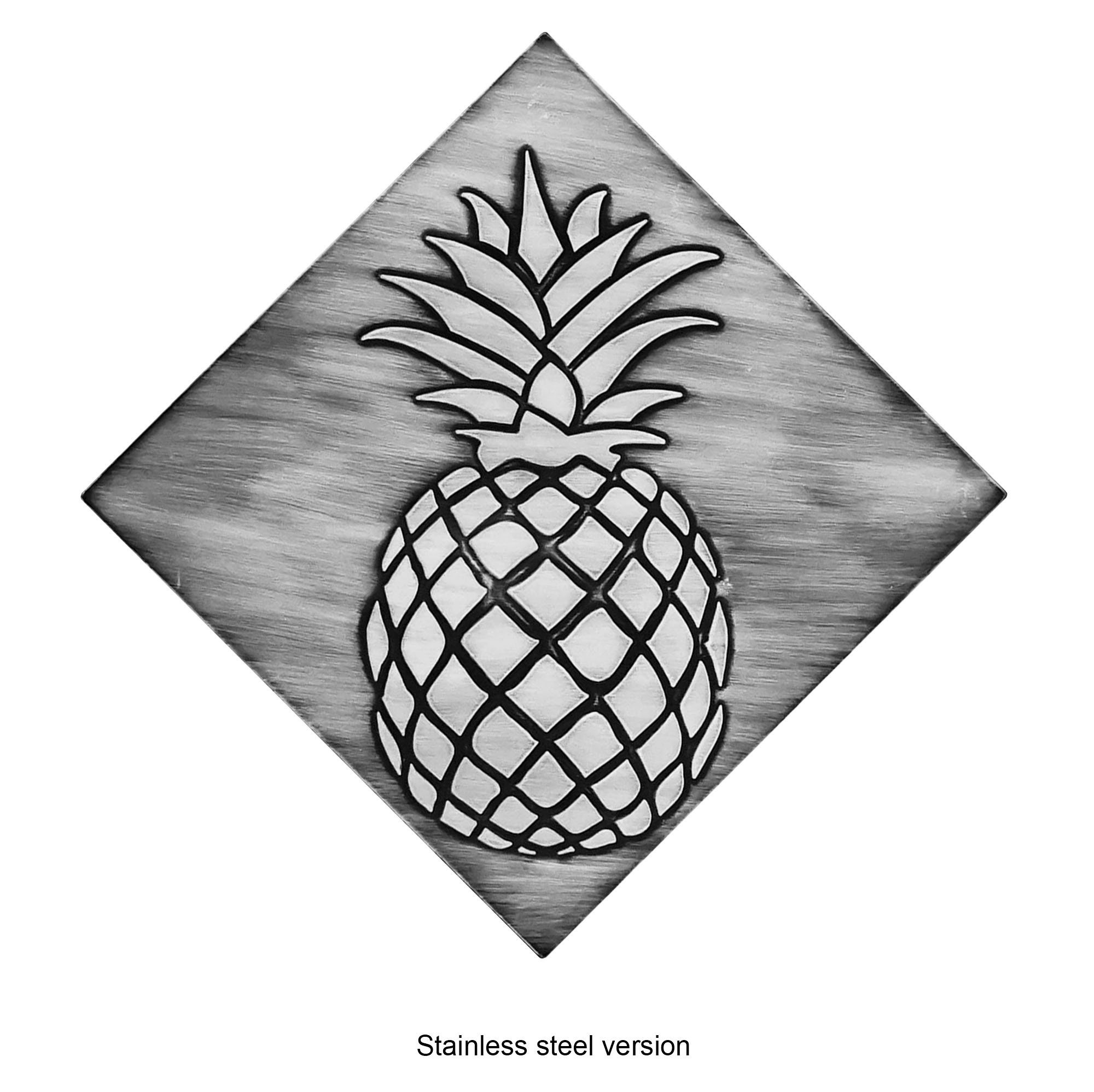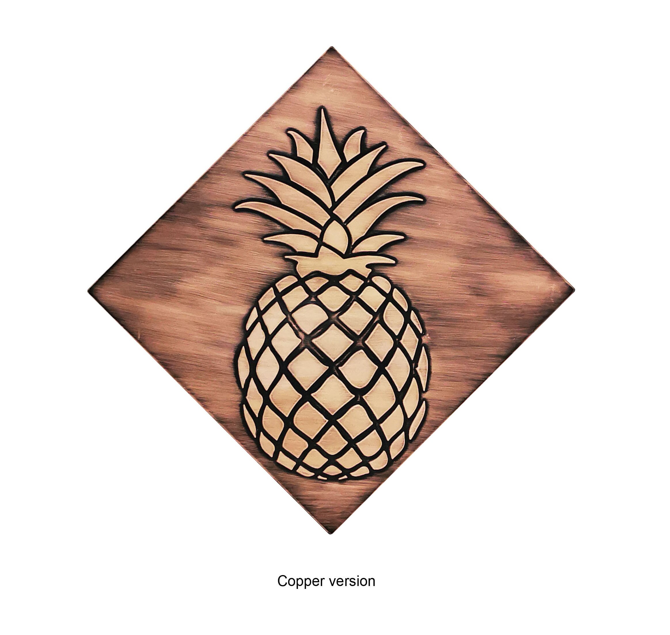 Leon's commitment to artistry and quality shines through in each tile. Whether forged in copper's warm hues, stainless steel's modern sheen, or brass's timeless allure, the tile undergoes a meticulous handcrafting process. A touch of patina highlights the pineapple's intricate details, and a protective layer of special wax seals and enhances its beauty, making it an enduring piece of art.