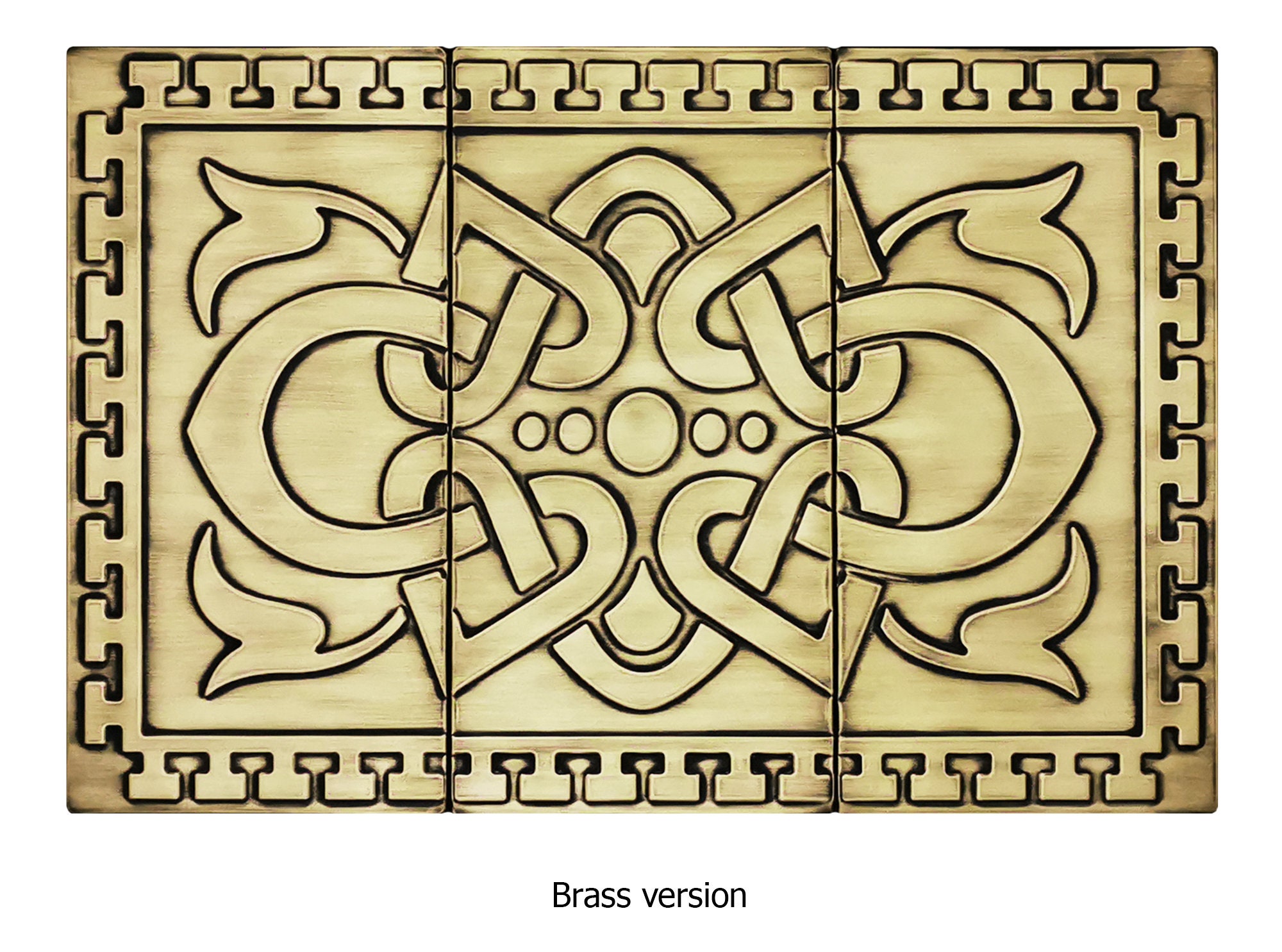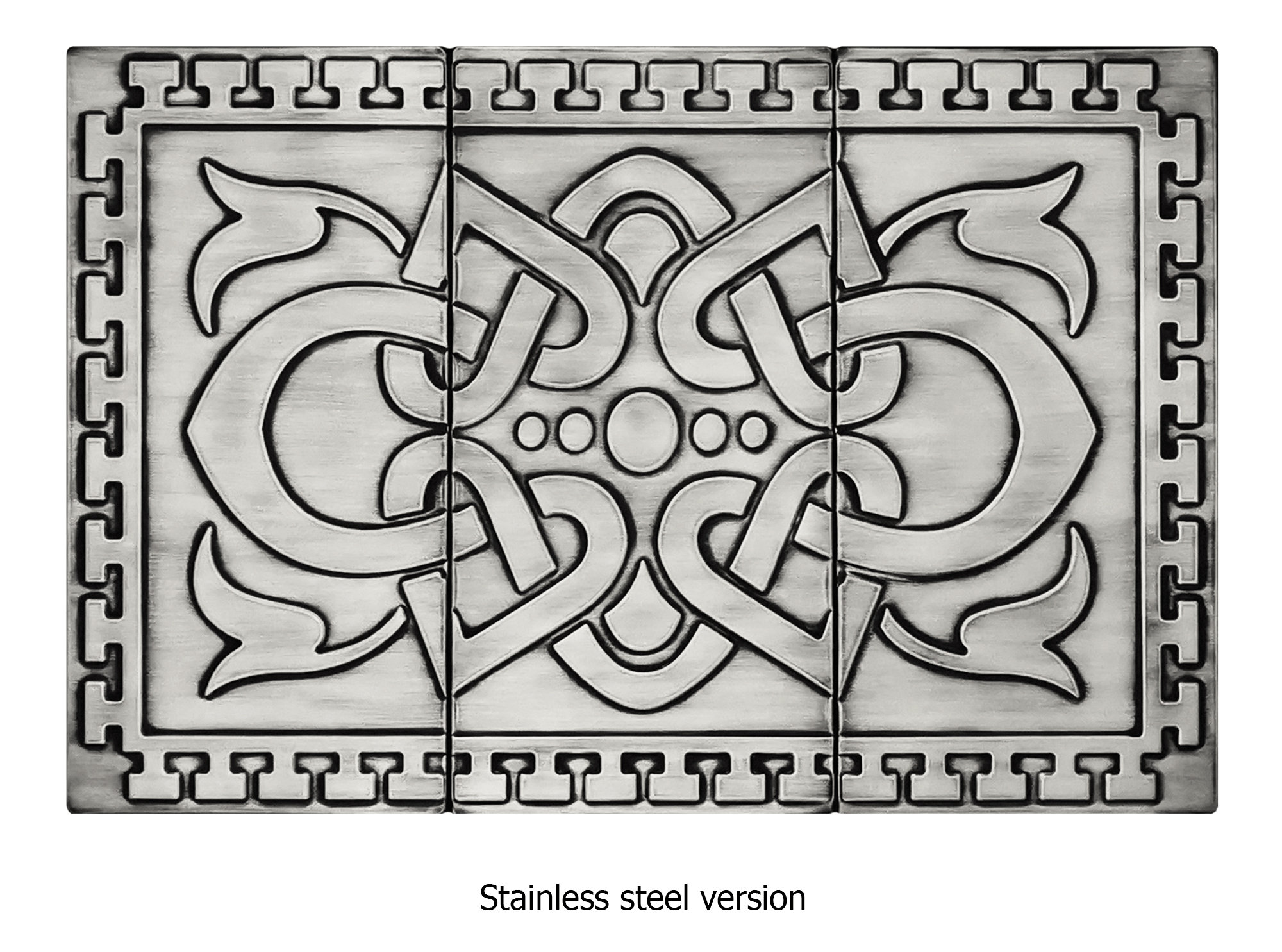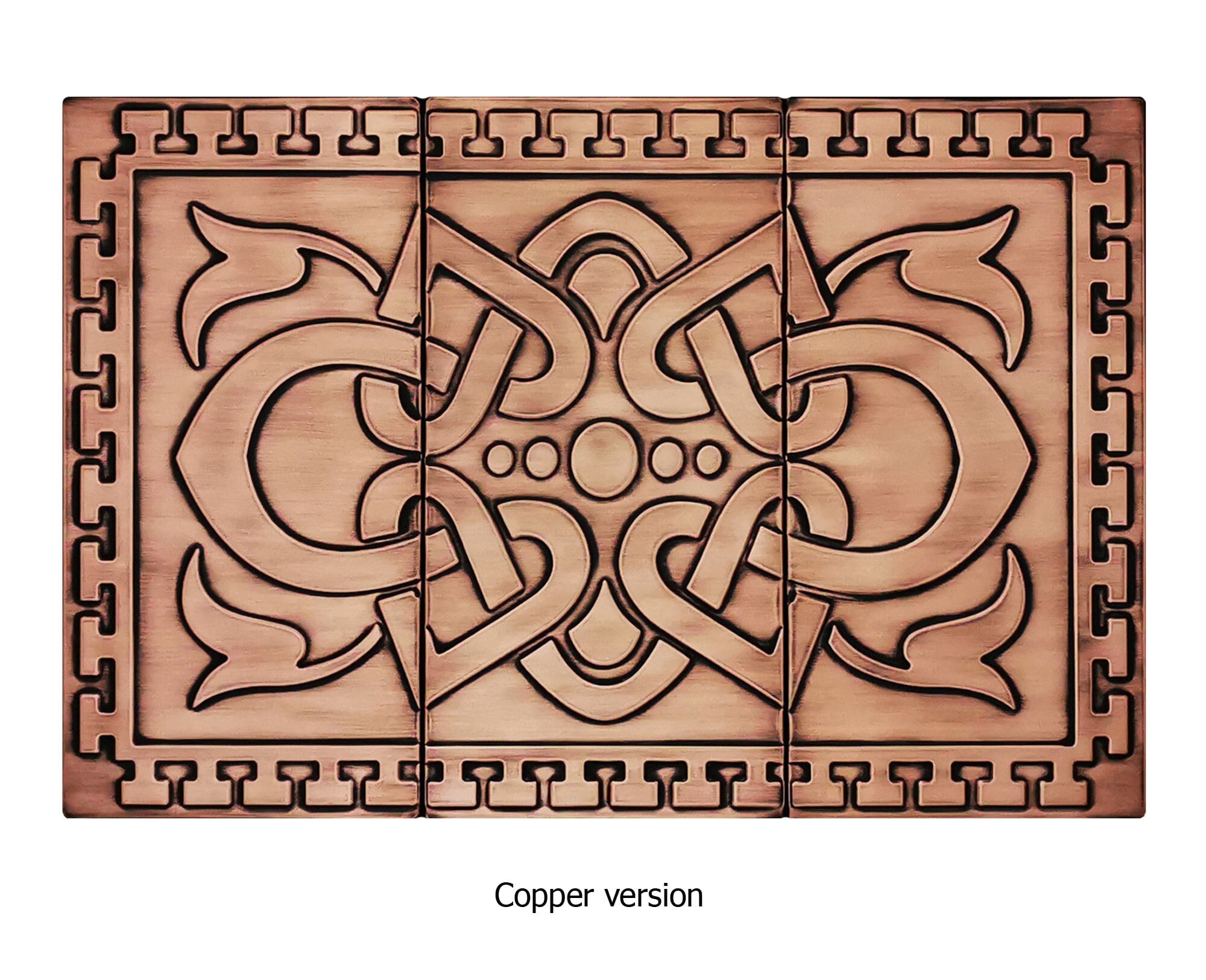 Beautiful, unique celtic backsplash on 3 tiles. Available in 3 sizes. 100% Copper, Stainless Steel or Brass.