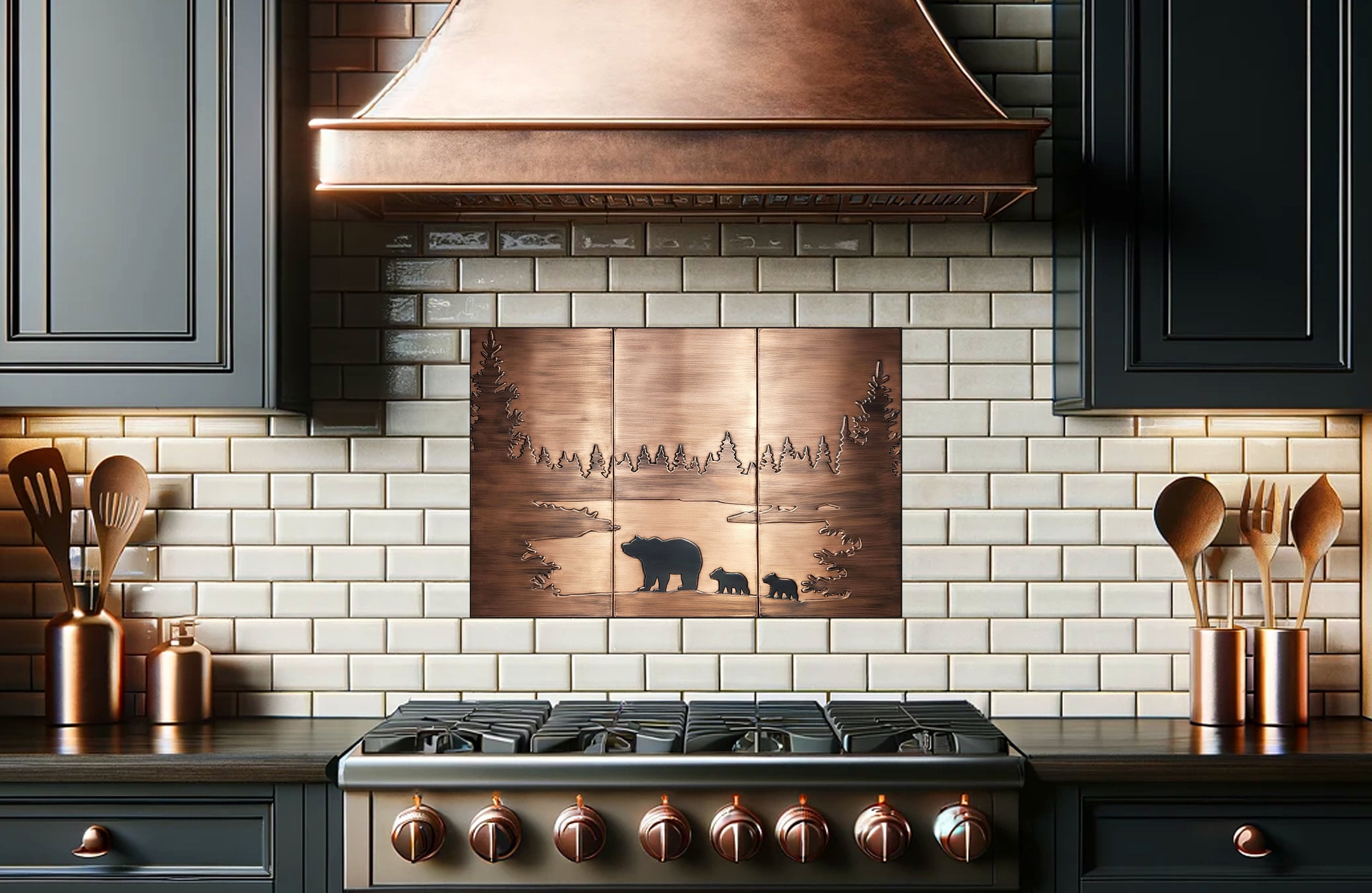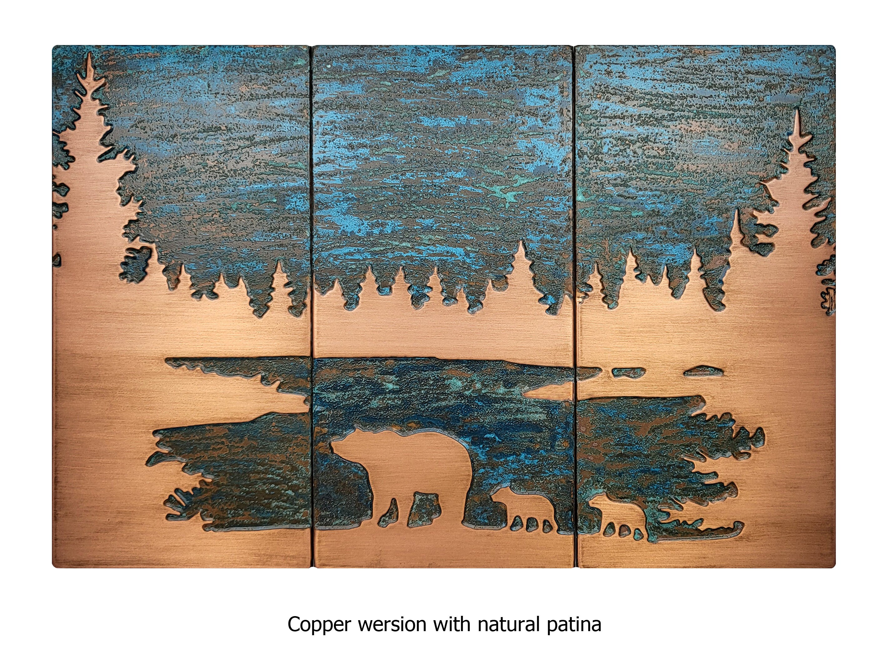 - **Material and Artistry:** Leon's masterful hands breathe life into this heartwarming tableau, meticulously shaped from your choice of premium copper, stainless steel, or brass. The exquisite craftsmanship captures the very essence of nature, with the Mama Bear and her cubs taking center stage amidst the tranquil beauty of the lake and the distant allure of Christmas trees.