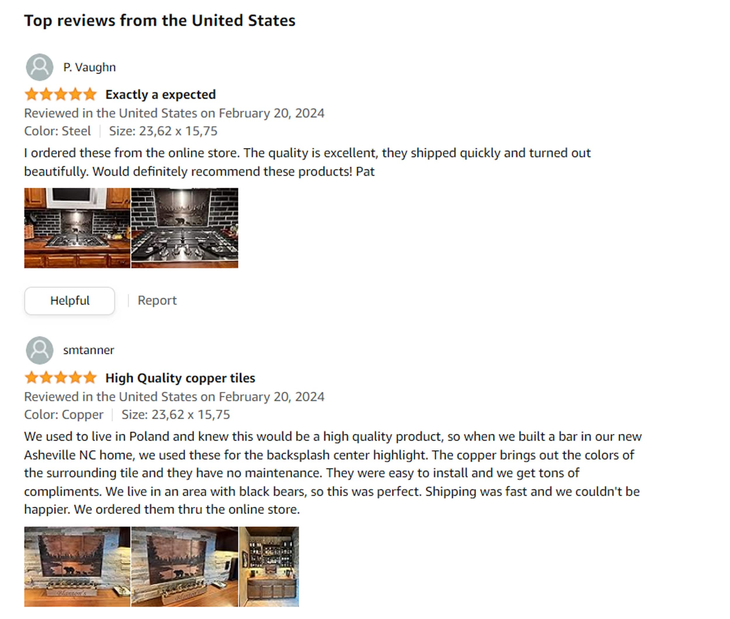 All my tiles are made of 100% real copper. It is not painted plastic or other copper-colored material that you can see from other manufacturers. I also offer tiles made of 100% brass and stainless steel.