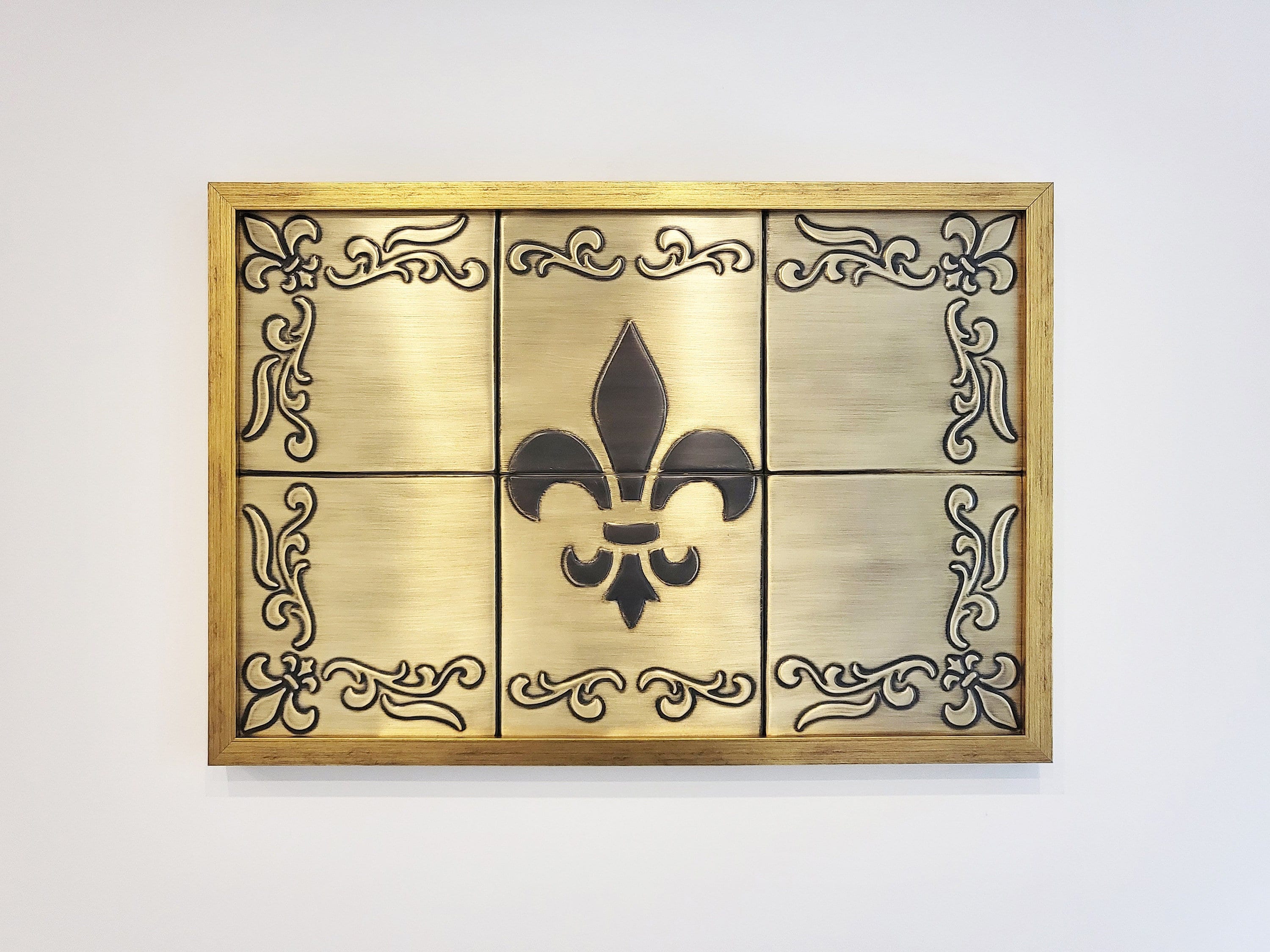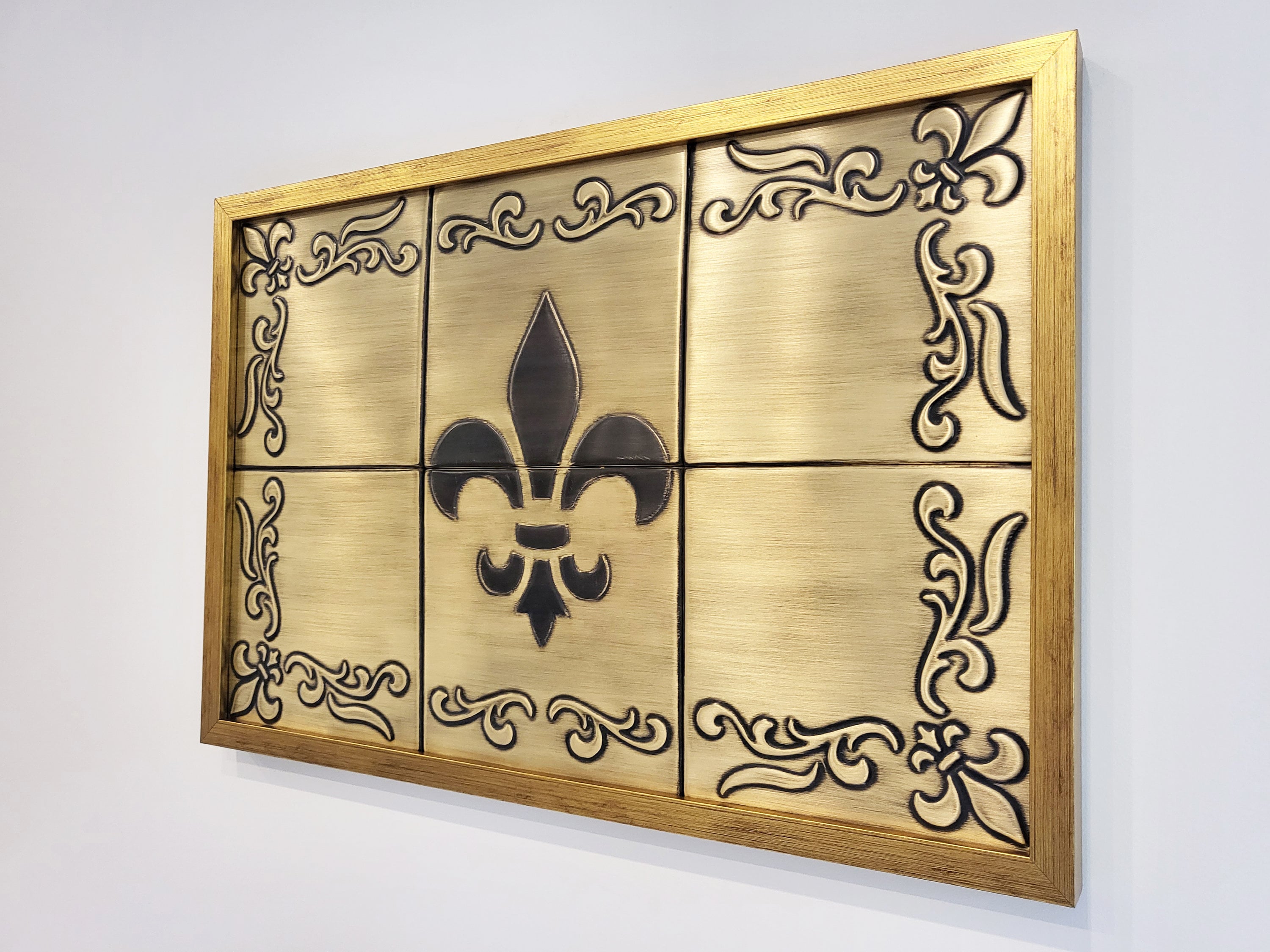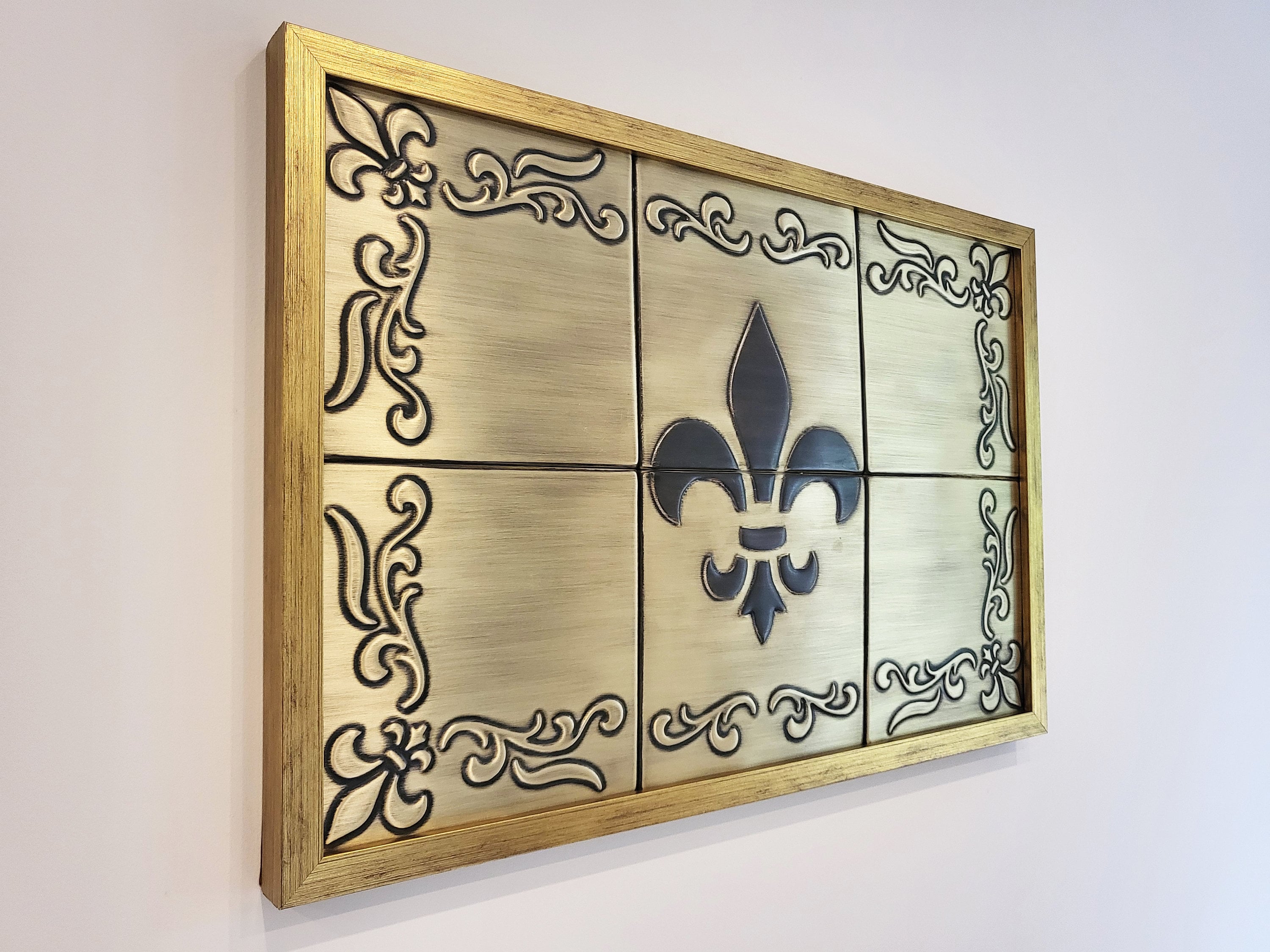 Brass Fleur de lis - Set of 6 Handmade tiles in a beautiful wood frame with a hook to hang on the wall - pure brass