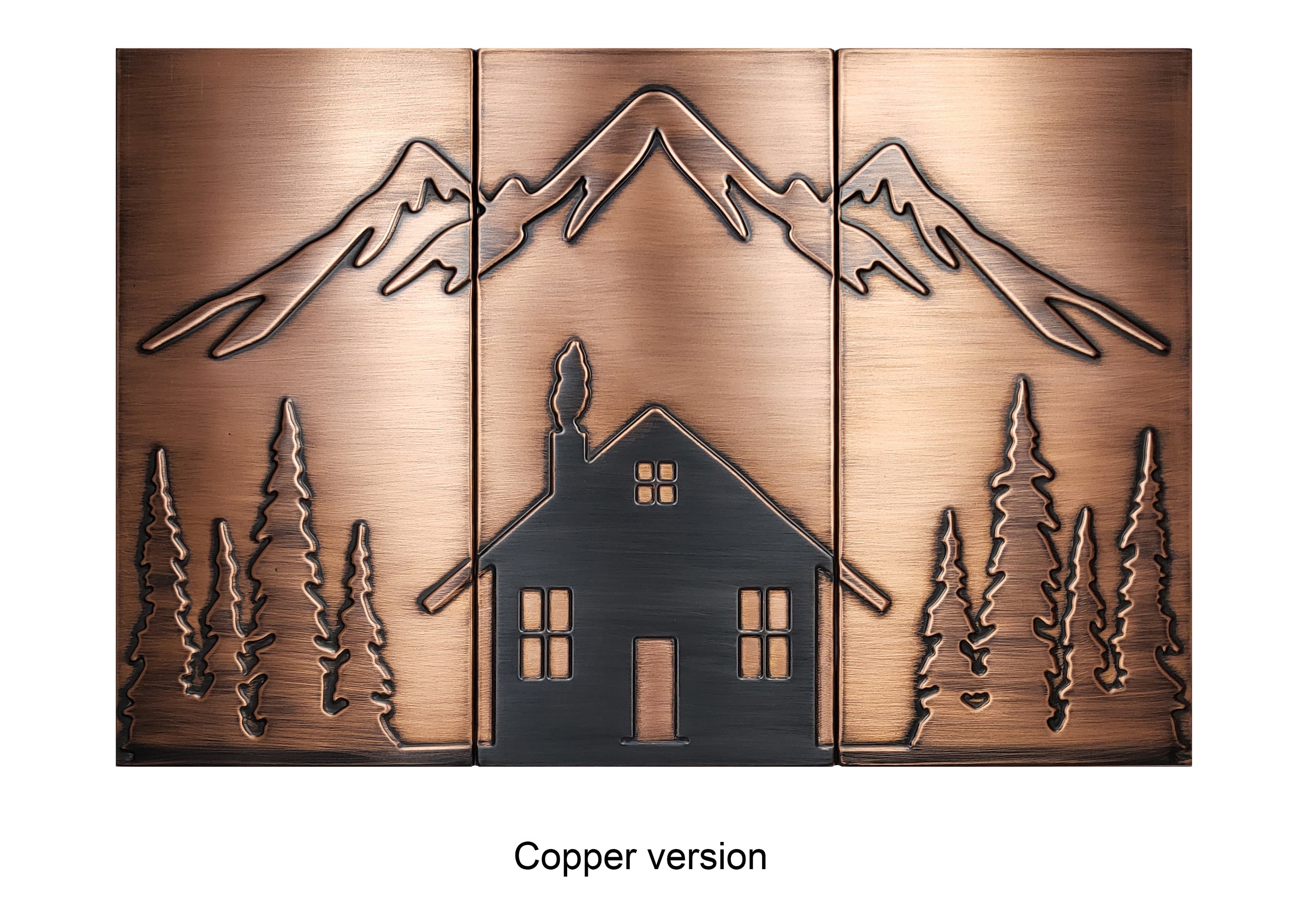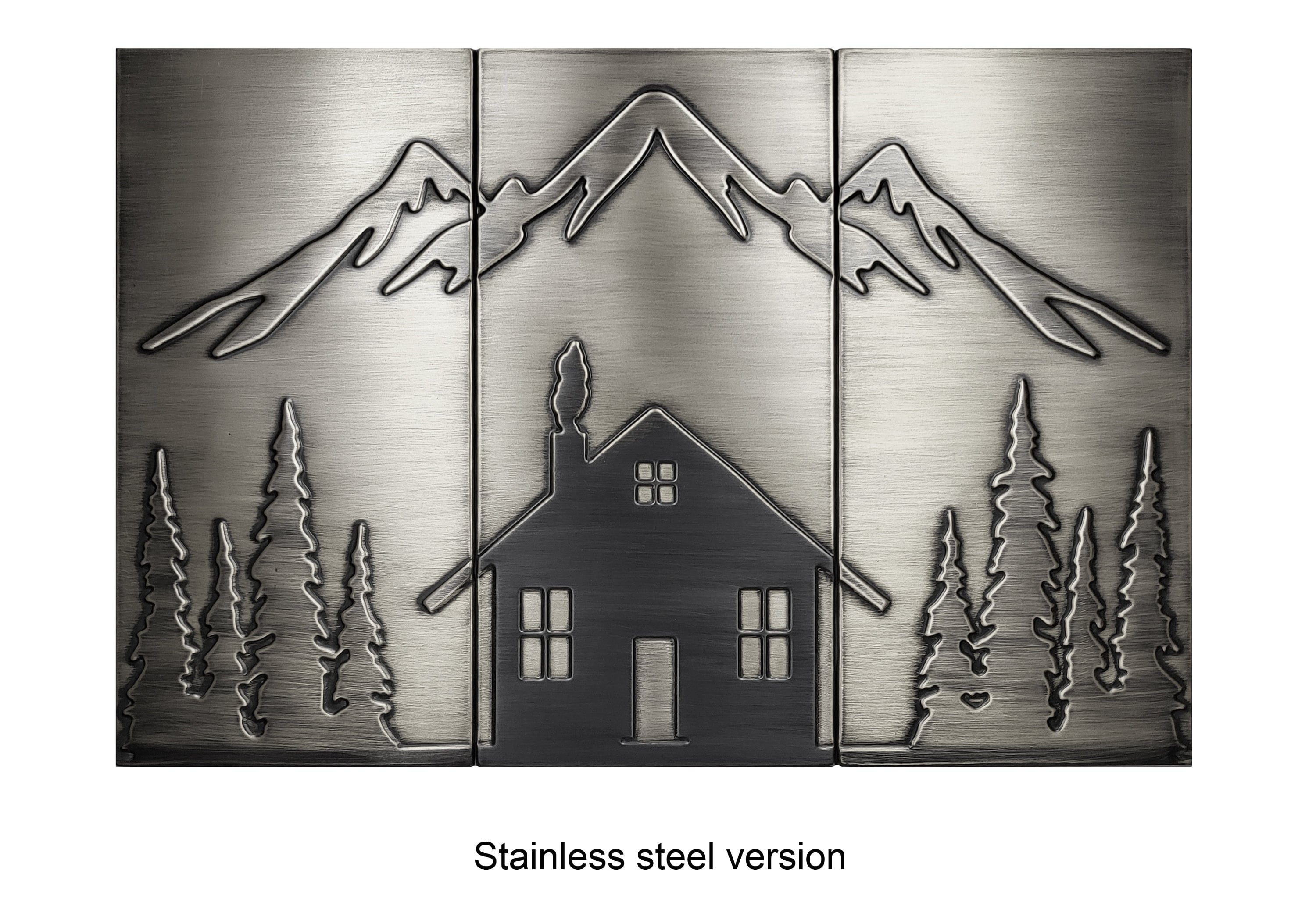 The triptych is embossed with an idyllic representation of a cabin nestled amidst towering trees, set against the majestic backdrop of mountain ranges. When installed side by side, these three rectangular tiles come together to form a seamless, enchanting landscape.
