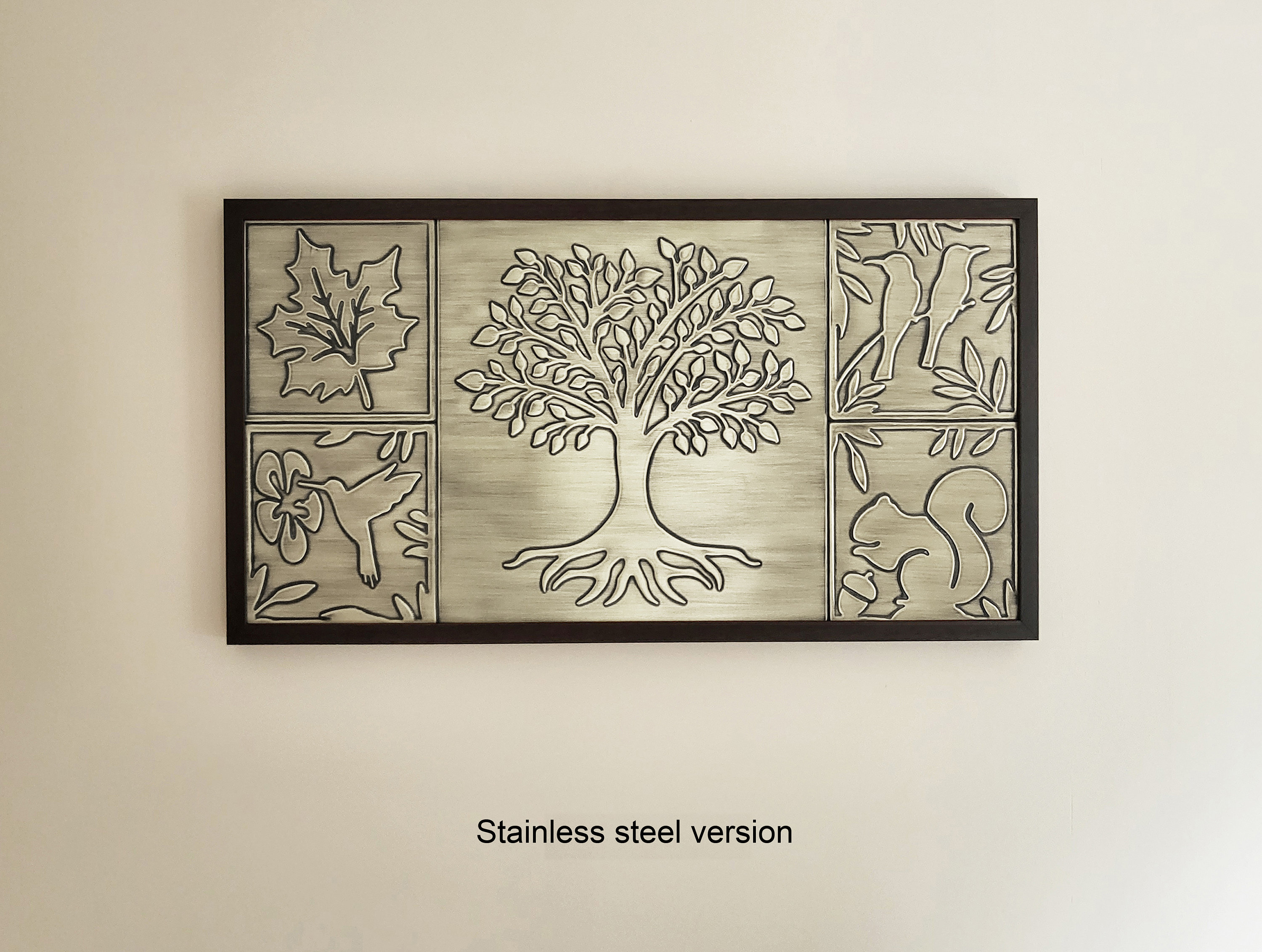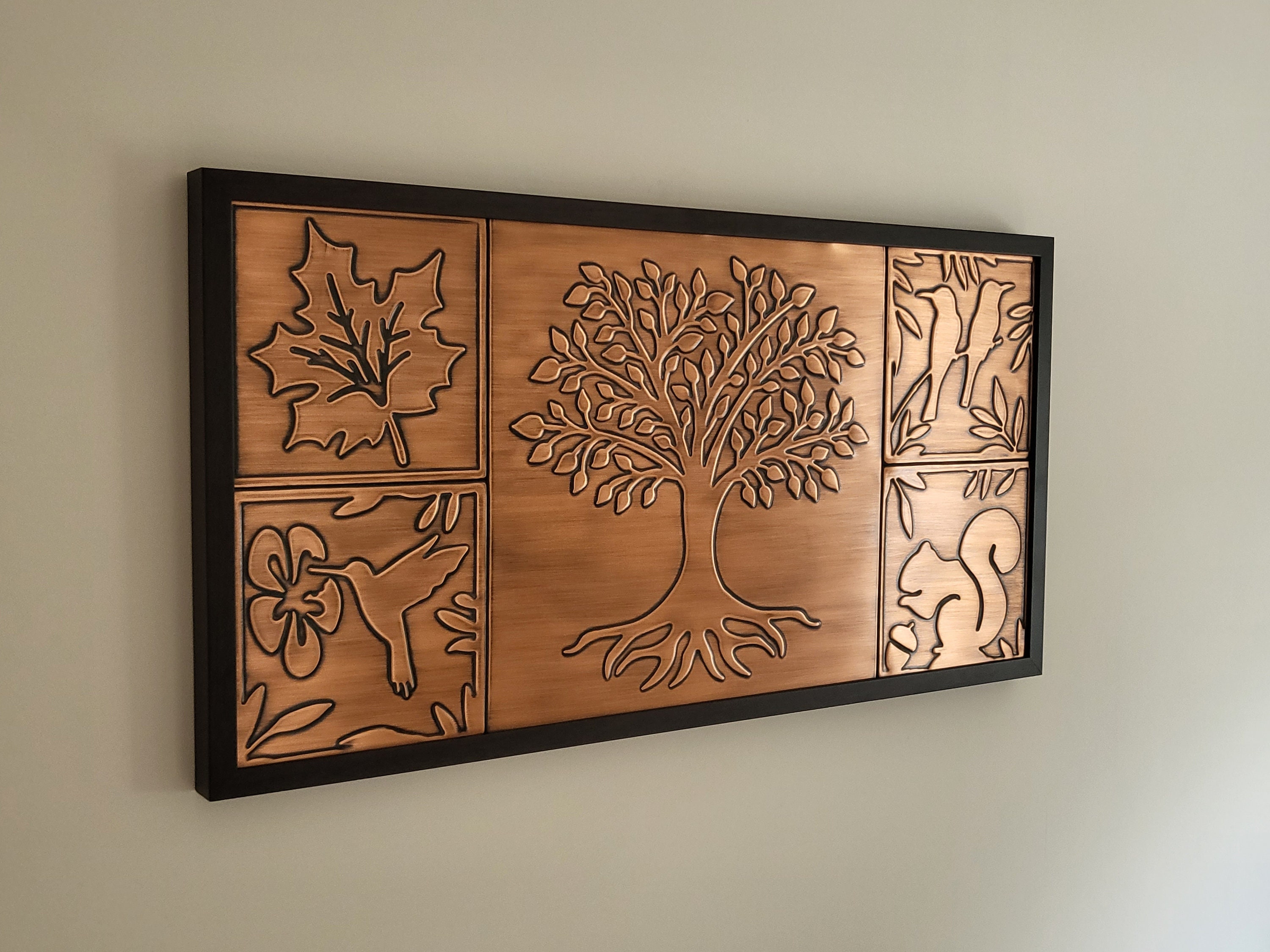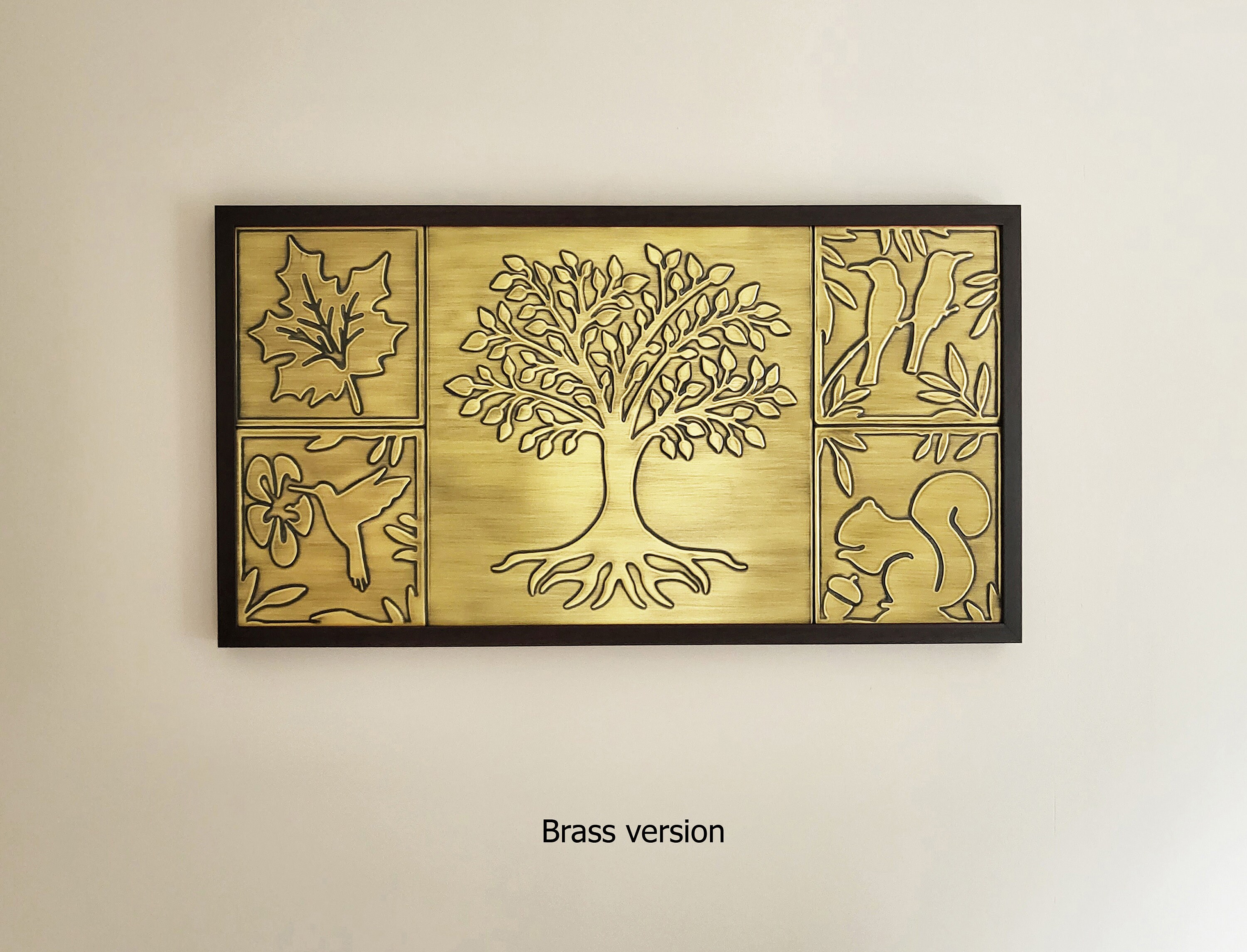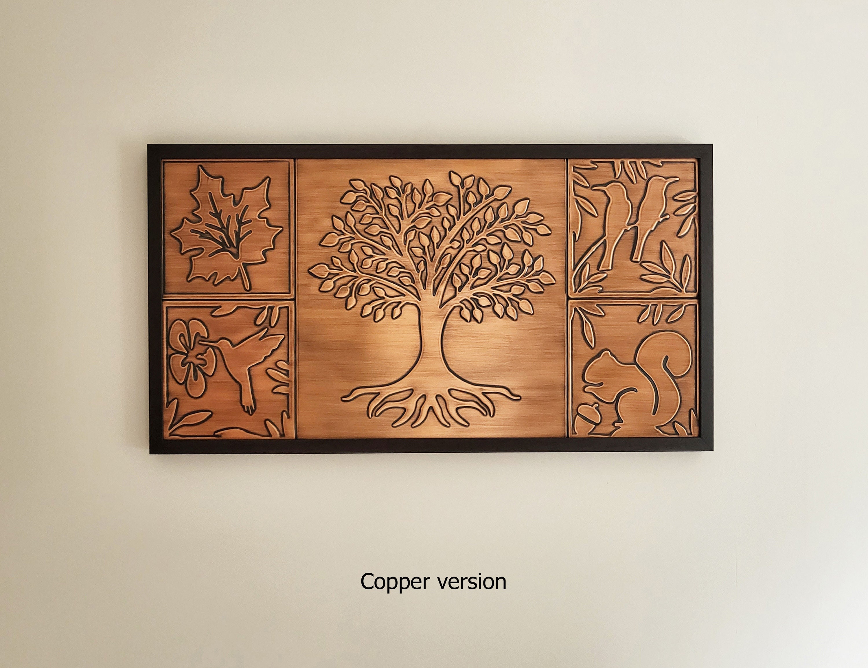 Tree of life, squirrel, leaf, birds and hummingbird in a beautiful wooden frame. Set of 5 handmade tiles. 100% Copper, Stainless Steel or Brass.