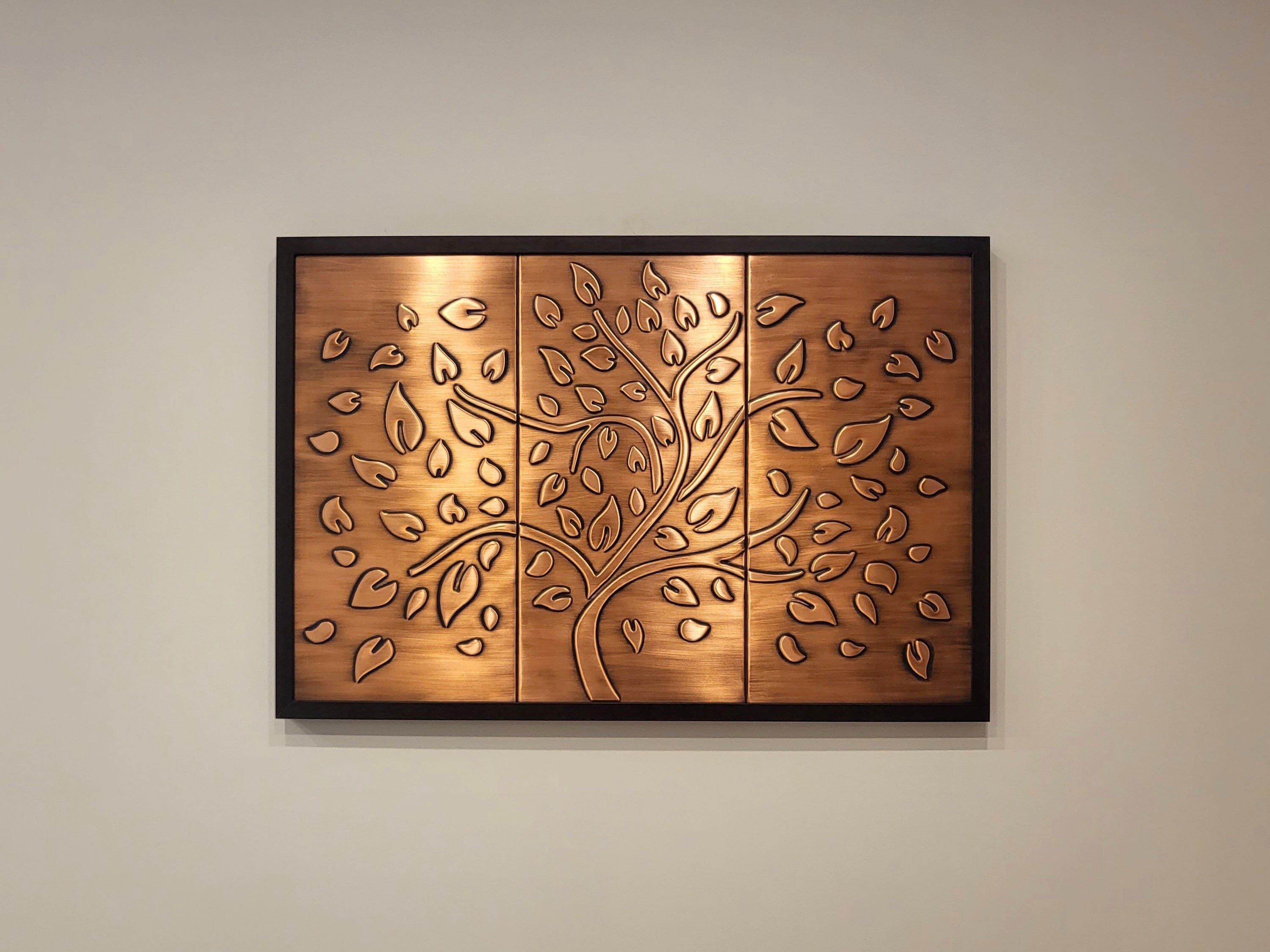 Fabulous tree with falling leaves and a beautiful wooden frame. Set of 3 handmade tiles. 100% Copper, Stainless Steel or Brass.