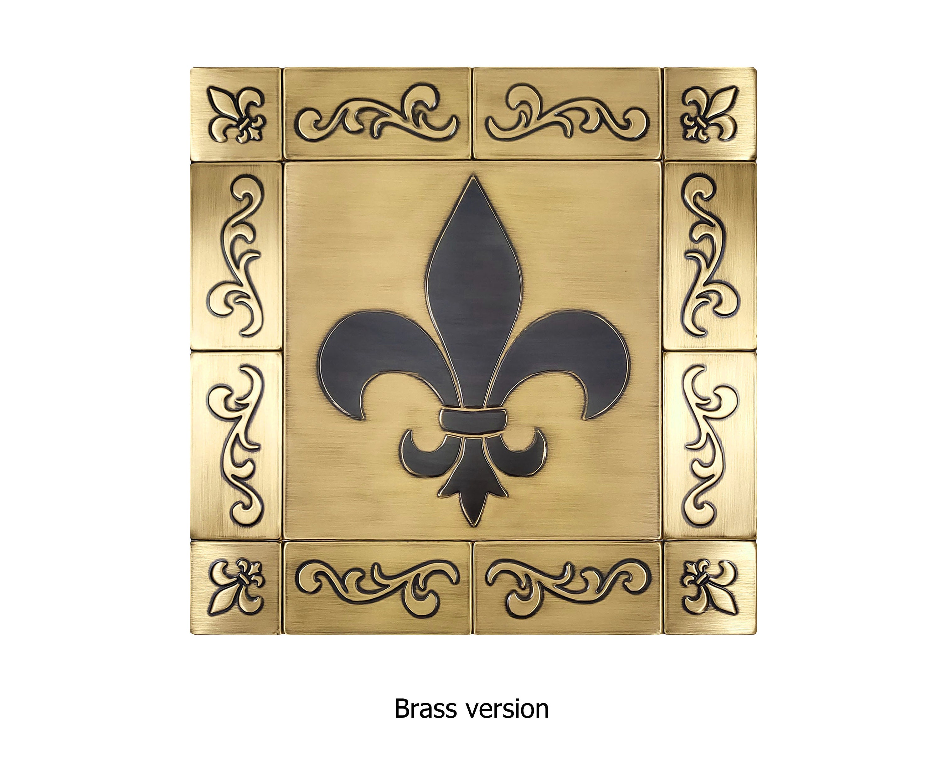 Immerse yourself in a majestic tableau crafted from thirteen individual tiles. At the center stage is a generously proportioned square tile, intricately adorned with a resplendent lily, symbolizing the very heart of the 'Fleur De Lis'. Surrounding this emblematic centerpiece are twelve smaller tiles, each meticulously hand-engraved, coming together to form a harmonious ornamental border. The ensemble, in its entirety, paints a tableau reminiscent of regal French tapestries and the opulence of bygone eras.