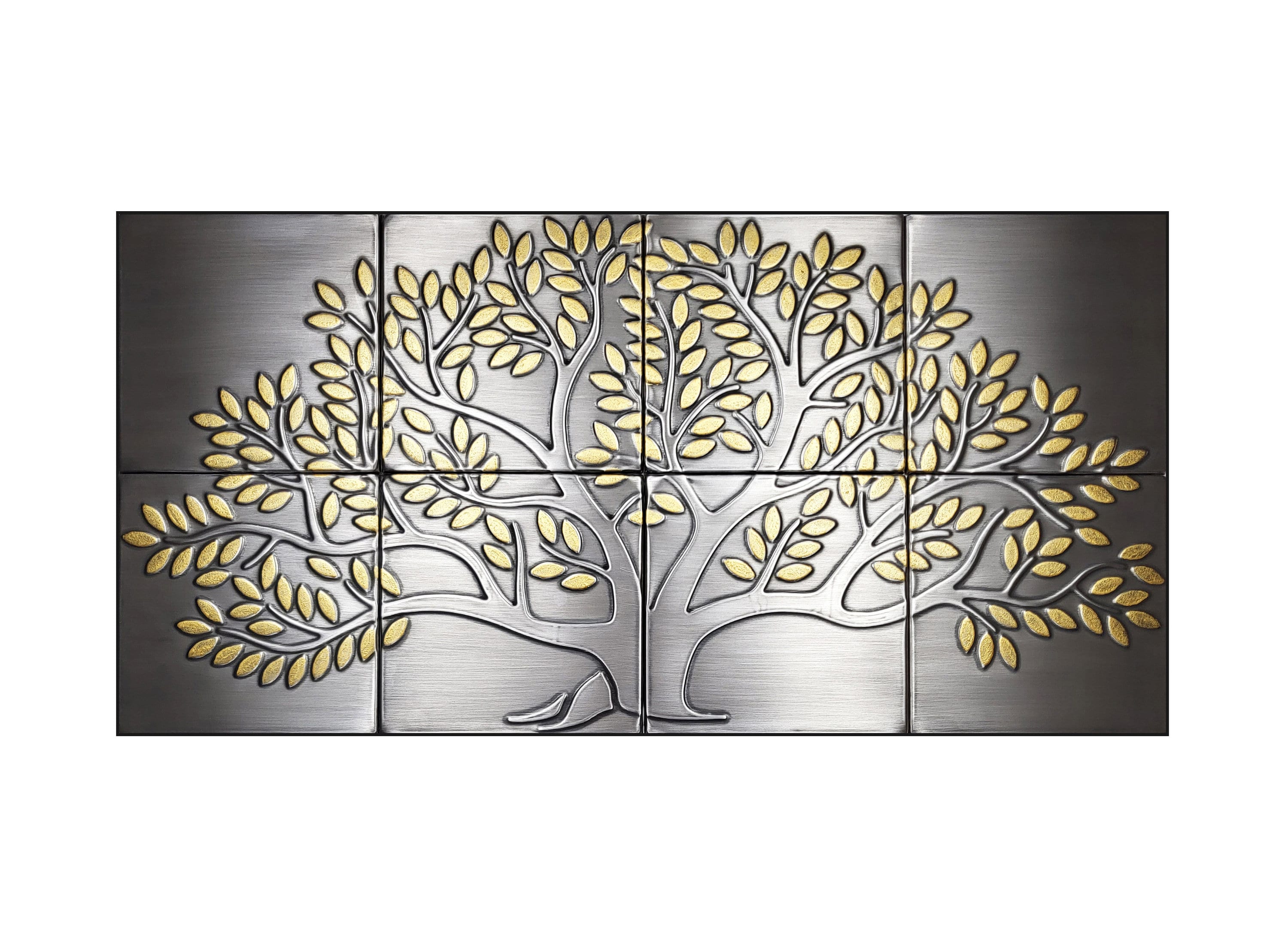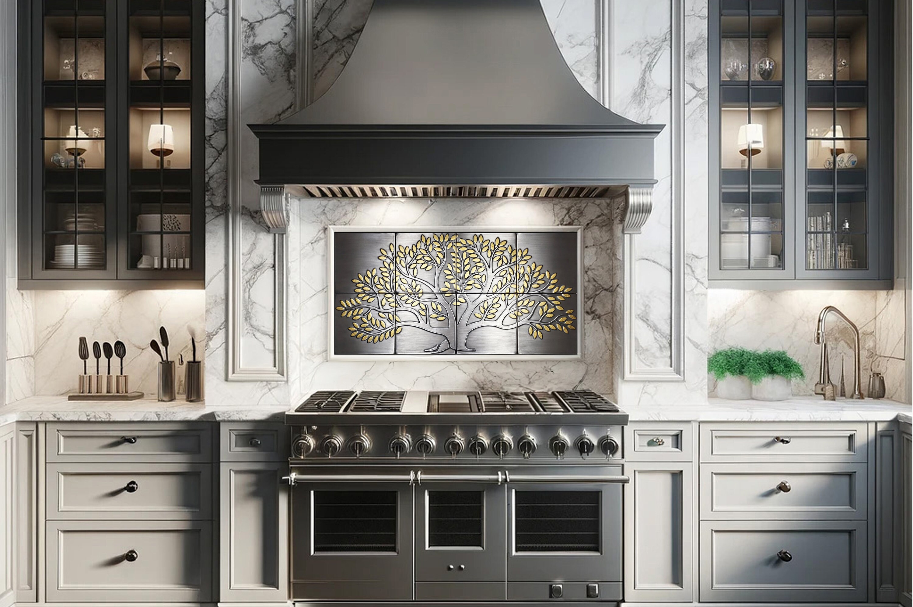 Luxury Tree of Life Kitchen Backsplash – Handmade Wall Art on Stainless Steel with Brass Leaves – Elegant Home Decor Tile Set