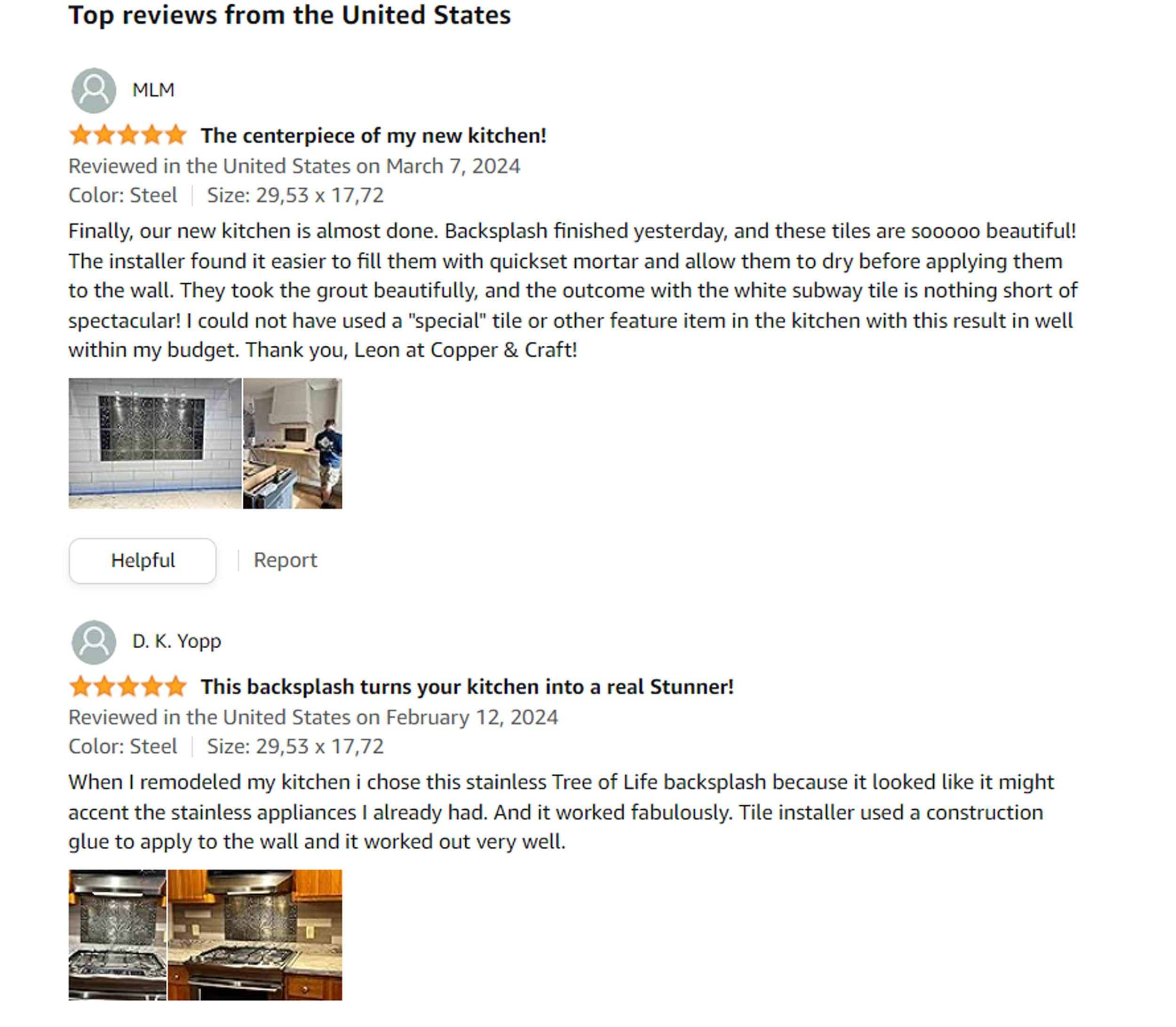 All my tiles are made of 100% real copper. It is not painted plastic or other copper-colored material that you can see from other manufacturers. I also offer tiles made of 100% brass and stainless steel.
