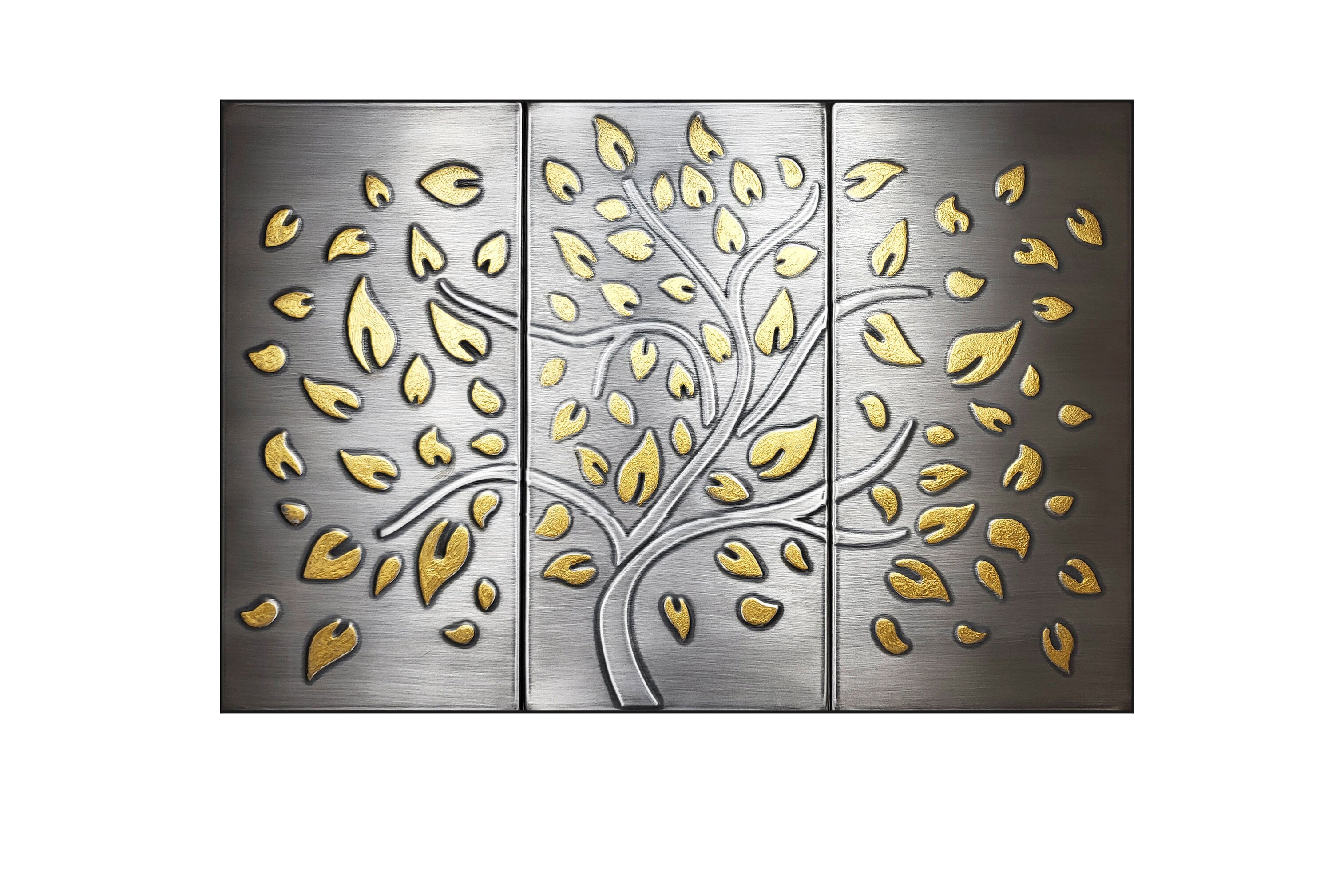 This triptych tells a tale of the venerated Tree of Life. The tree, standing tall and magnificent, showcases intricately embossed branches and roots, all rendered in gleaming stainless steel that gleams with a polished sheen.