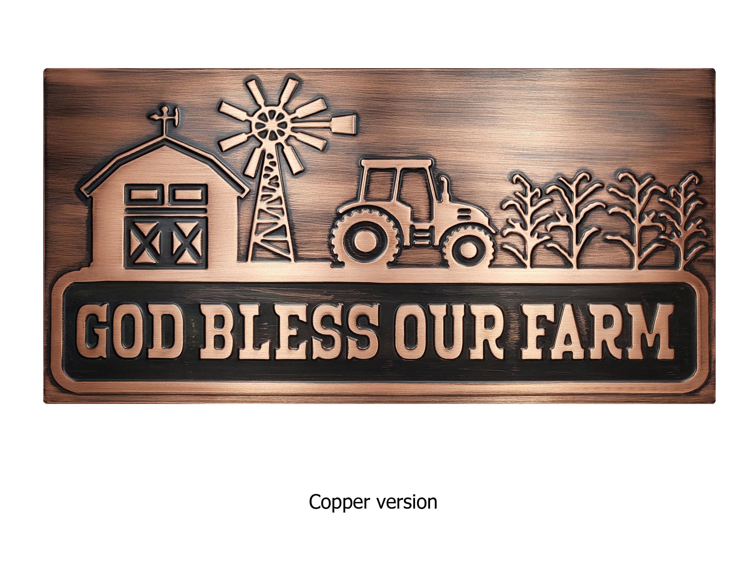God Bless Our Farm Metal Sign – Copper Farmhouse Wall Art – Rustic Kitchen Backsplash Tile – Tractor & Barn Decor – Country Home Gift