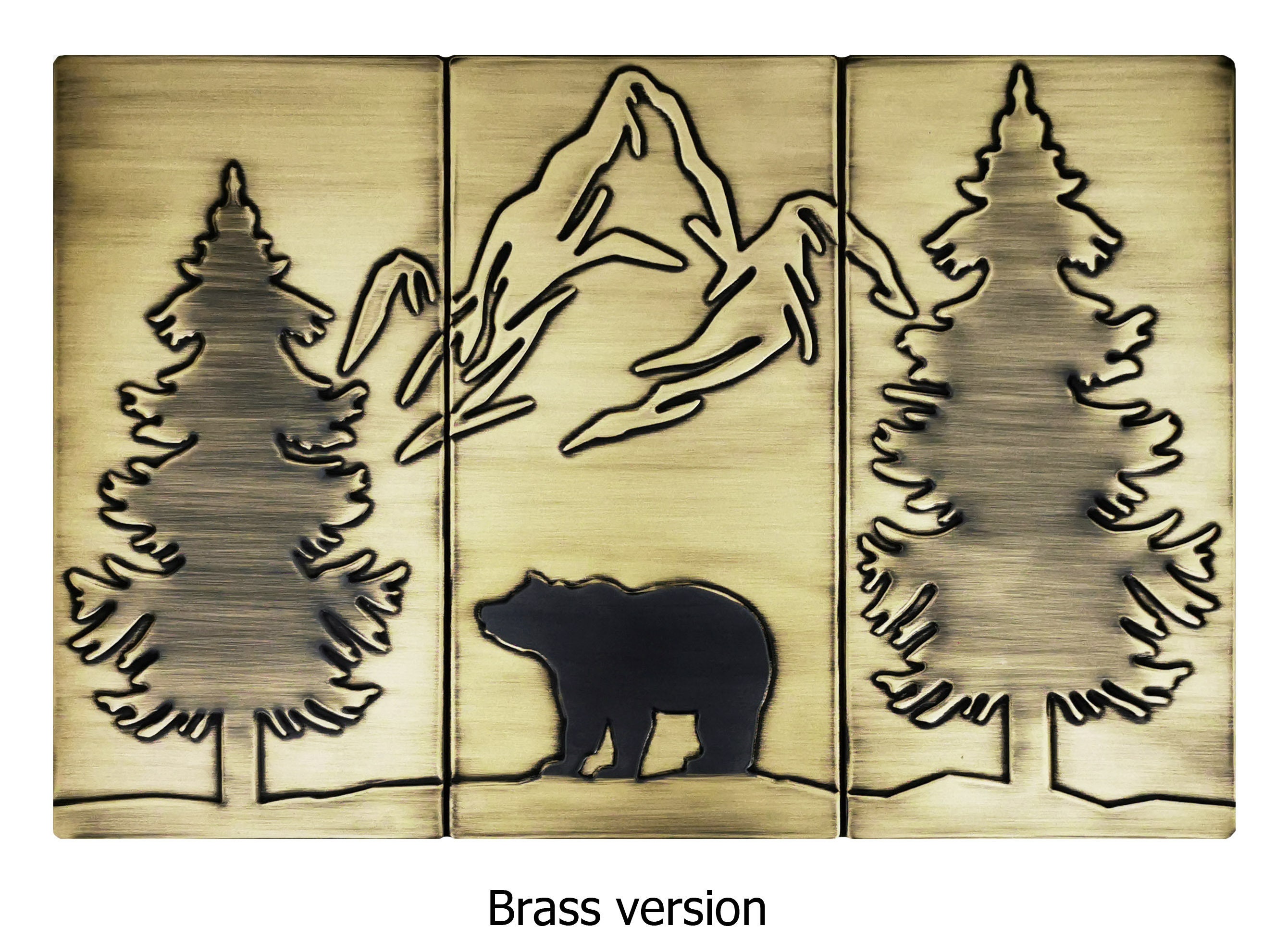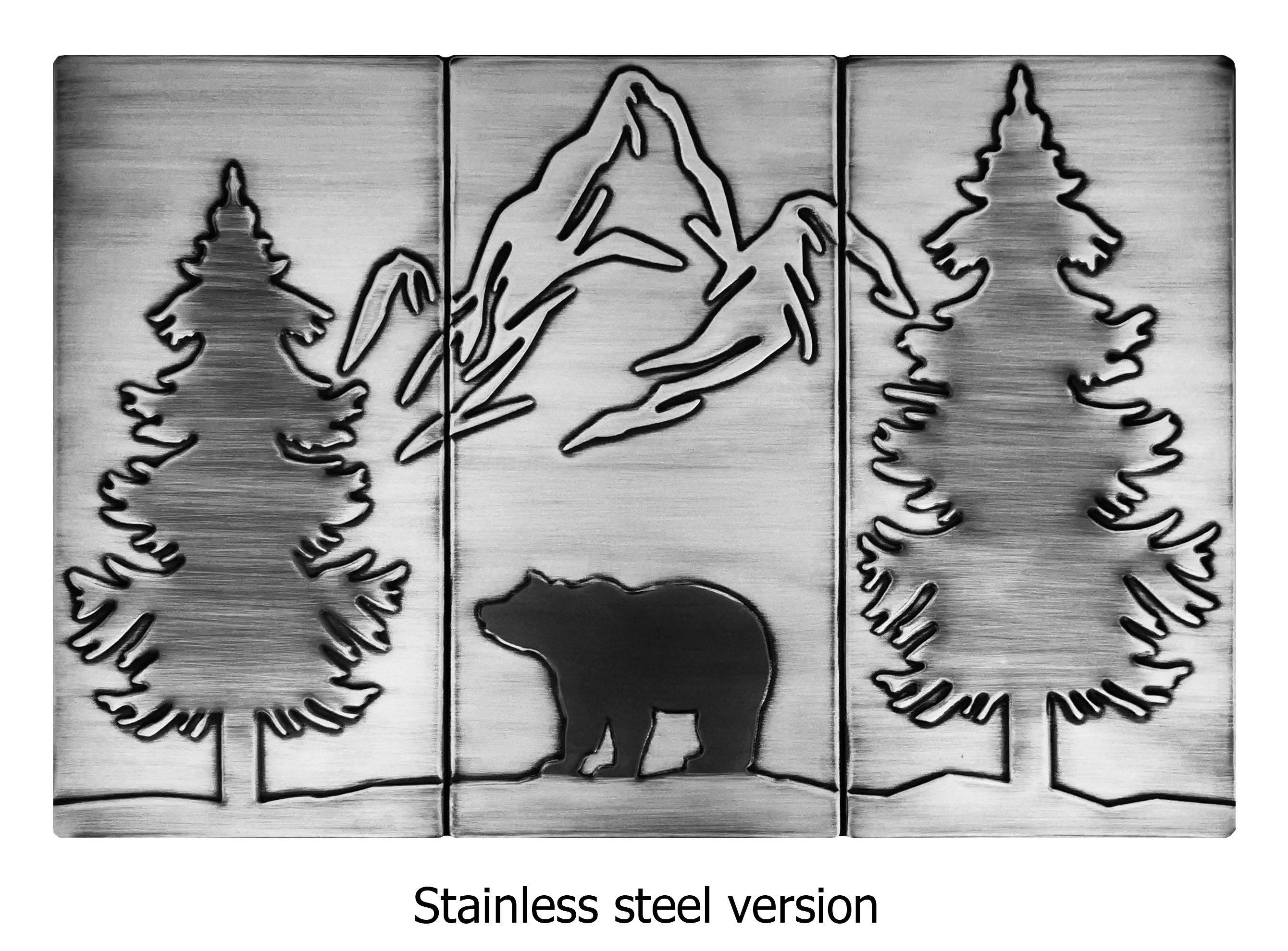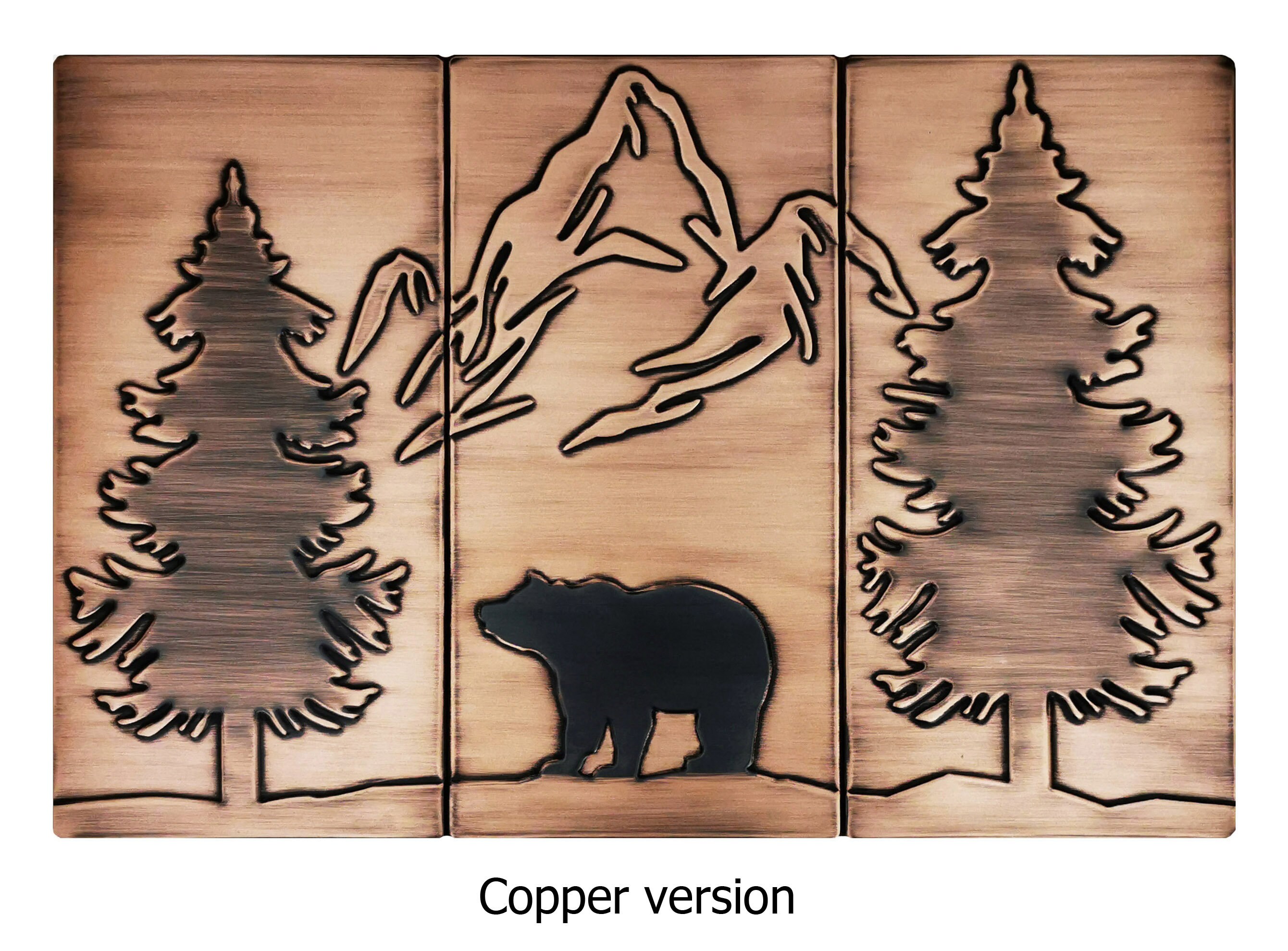 Bear, mountains and two pines - beautiful set of 3 Handmade tiles - 100% Copper, Stainless Steel or Brass.