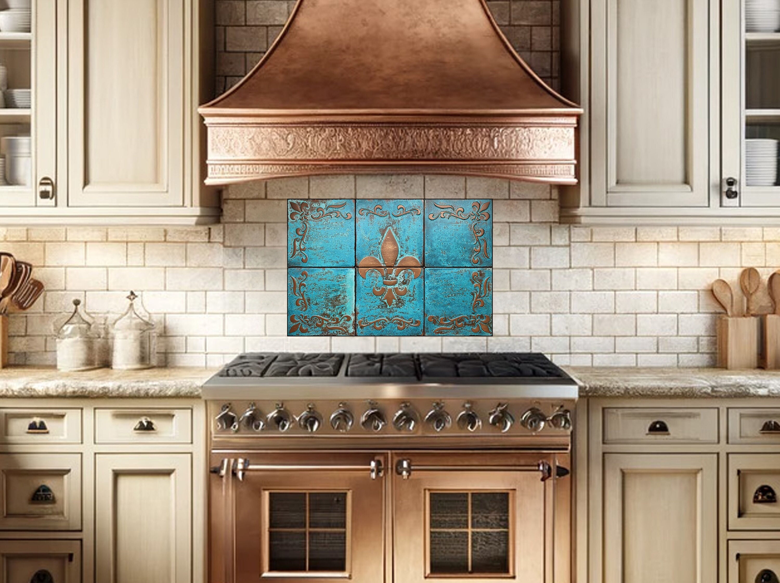 Drawing inspiration from the essence of France and the intricacies of handmade artistry, every tile begins as a blank canvas. The delicate strokes of the fleur de lis symbol are hand-engraved, ensuring that each square is both a standalone masterpiece and a fragment of the larger, captivating mosaic. The designs are further deepened and brought to life by a carefully applied patina, which not only enriches the pattern but also lends each tile a character that's truly one-of-a-kind. And to ensure that this masterpiece stands the test of time, every tile is meticulously coated with a special wax. This protection retains the metal's luster, guards its intricate design, and ensures suitability across a variety of environments — from the vibrant energy of a kitchen backsplash to the serene ambiance of a bathroom, or even the unpredictable outdoors.