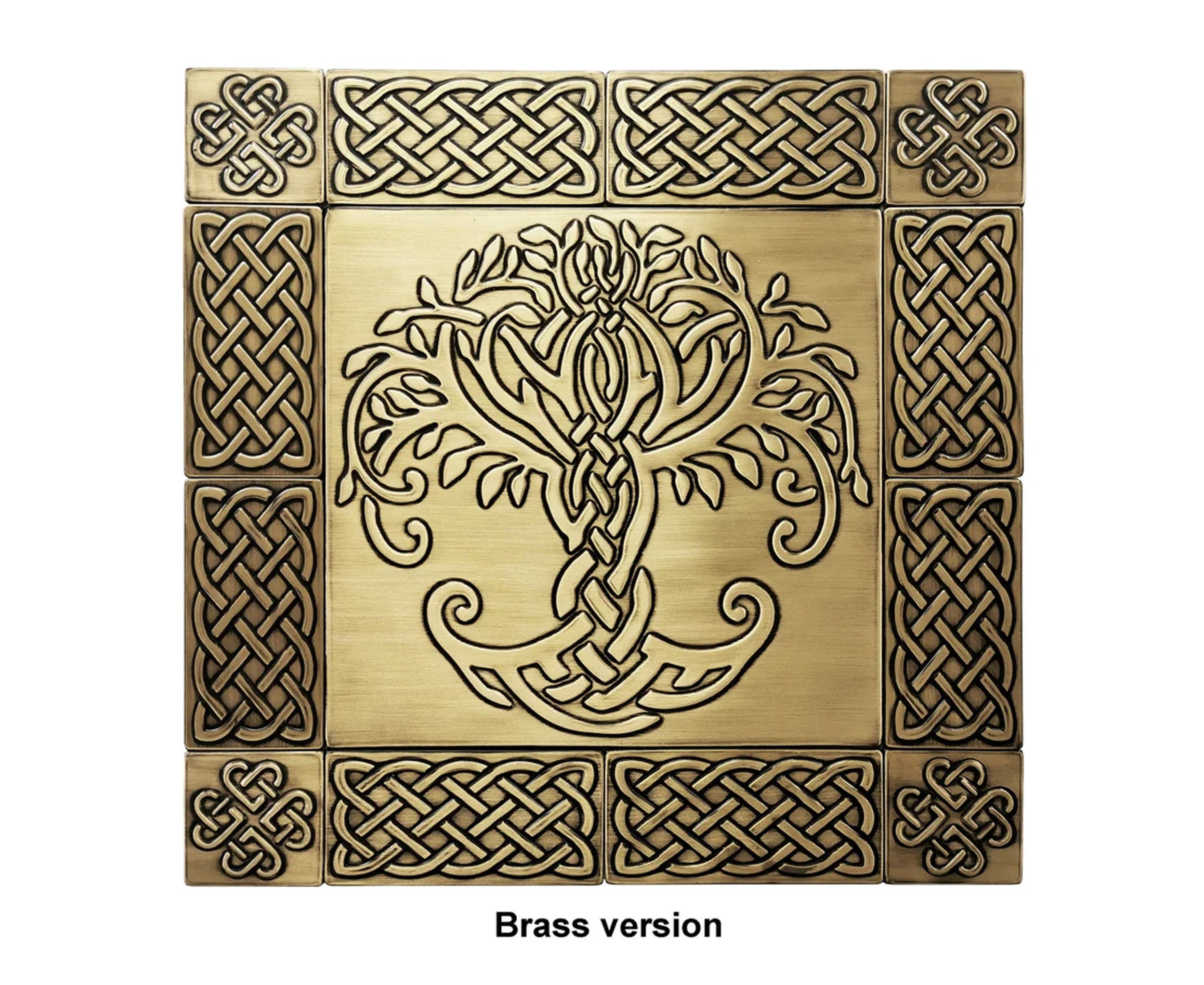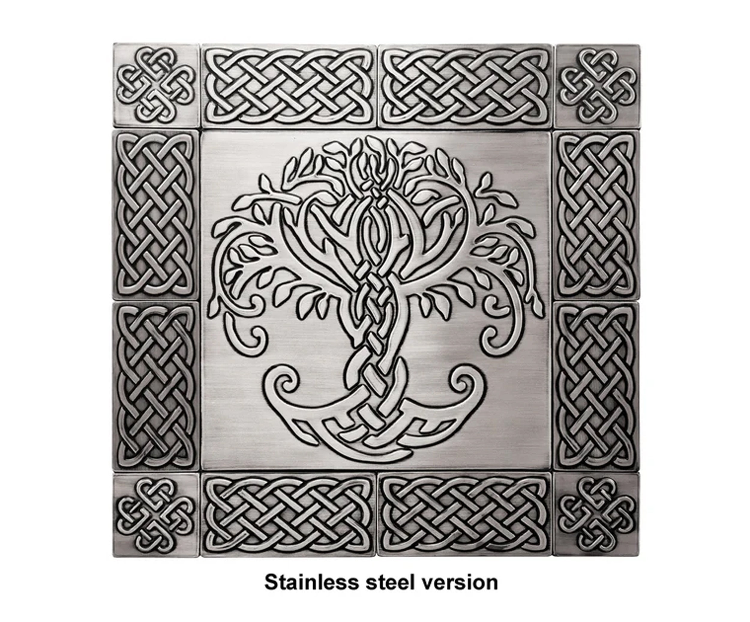 This handcrafted tile set features the sacred Tree of Life surrounded by Celtic knot borders β a symbol of balance, connection, and strength. Made from copper, brass, or stainless steel, this piece is available in polished metal or unique blue/brown patina.