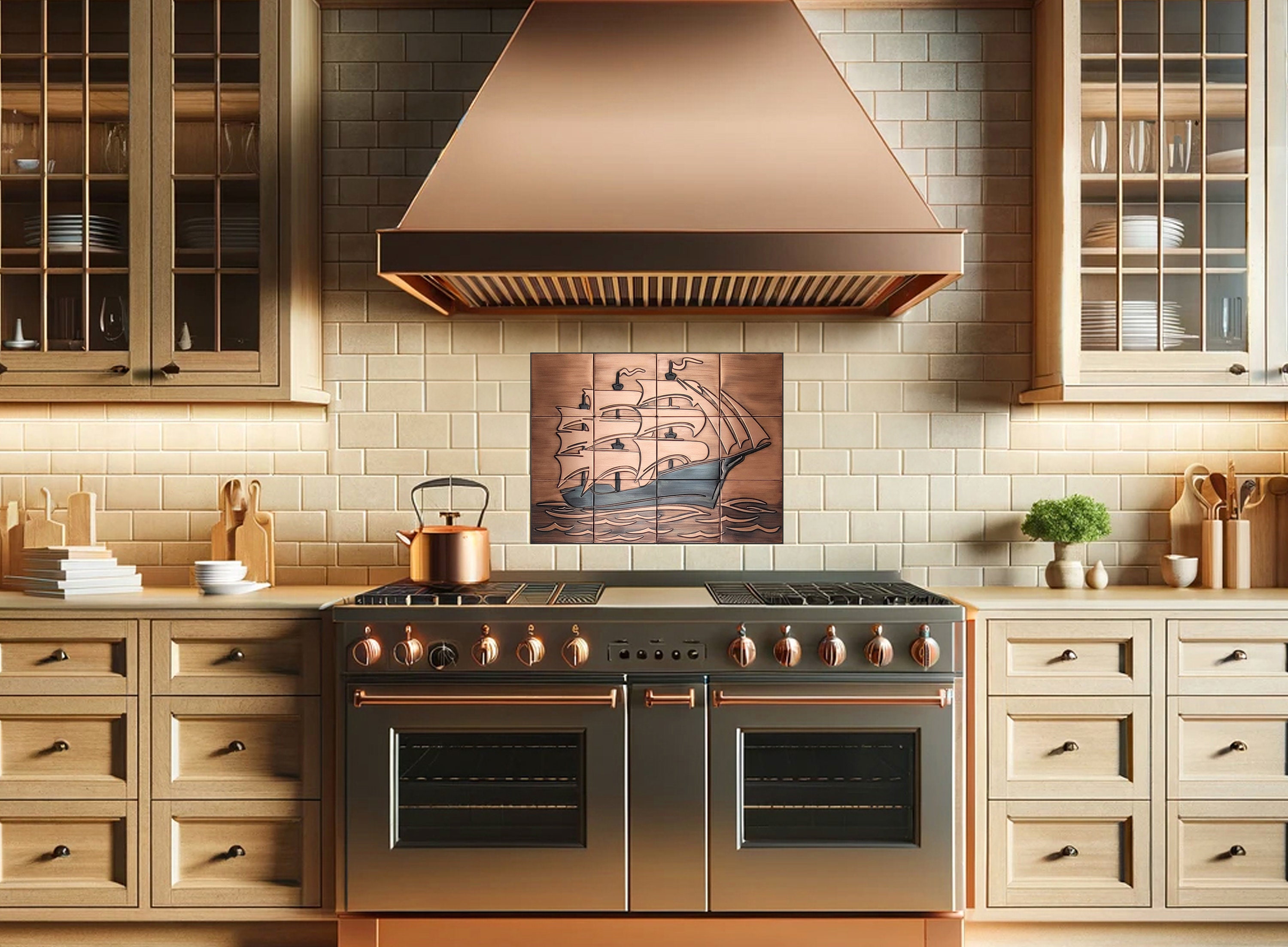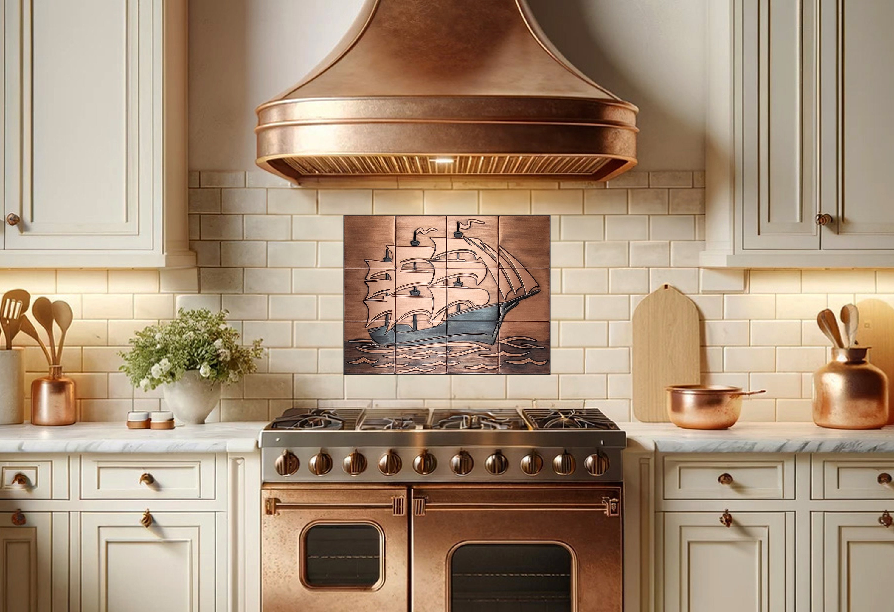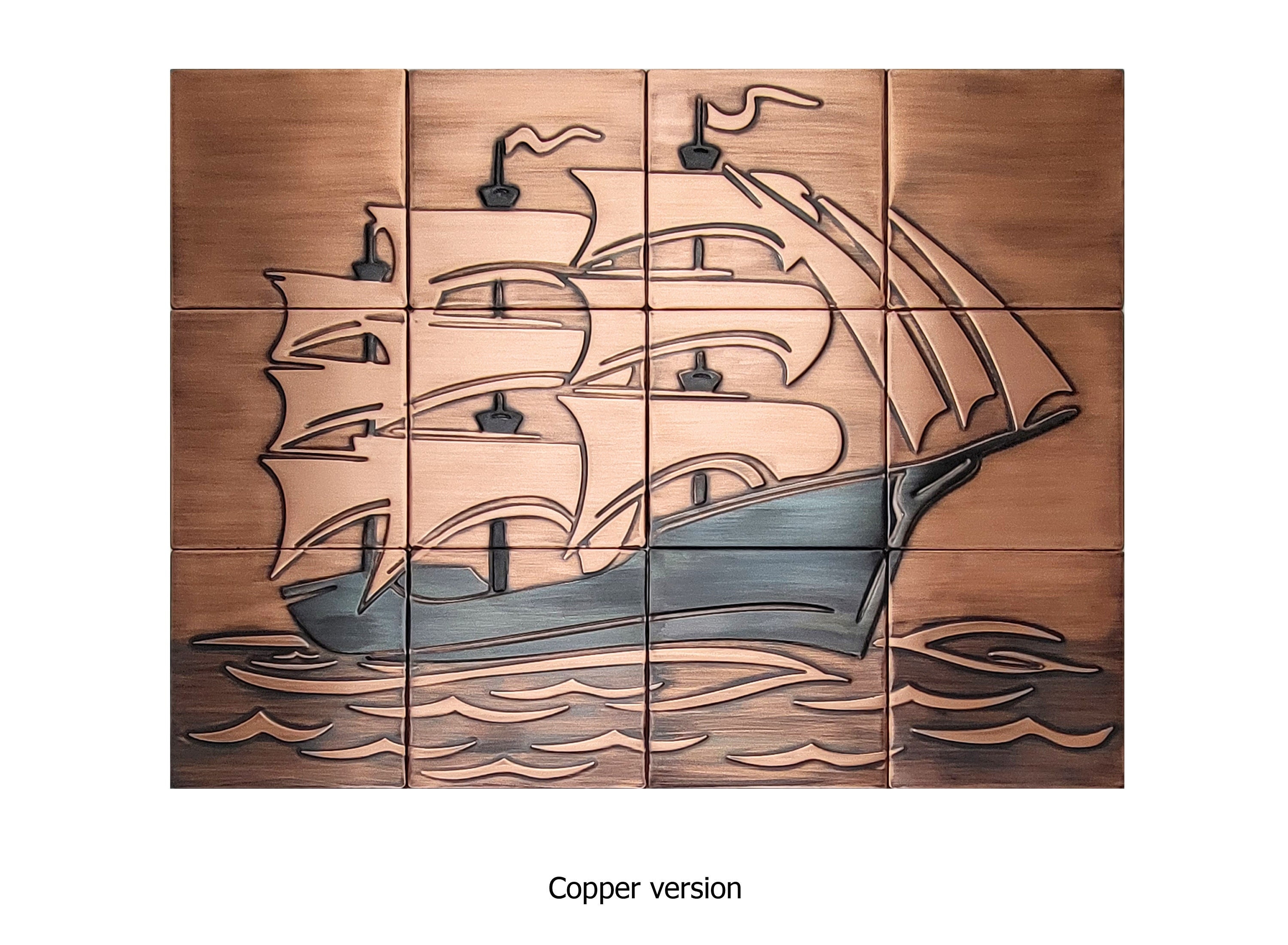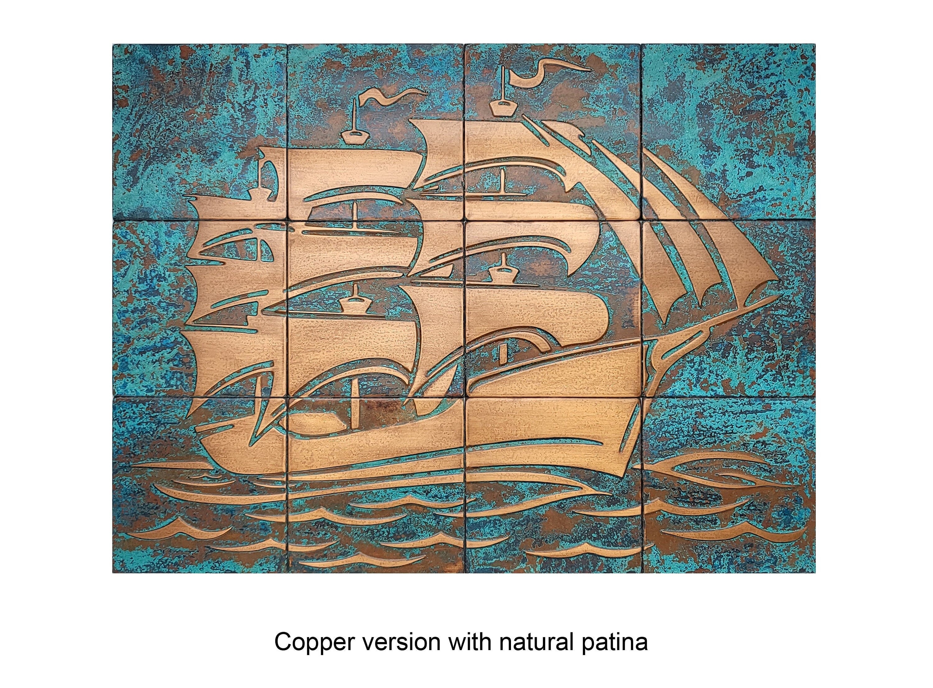Vintage style sailing ship - set of handmade, decorative tiles - 100% Copper, Brass or Stainless Steel