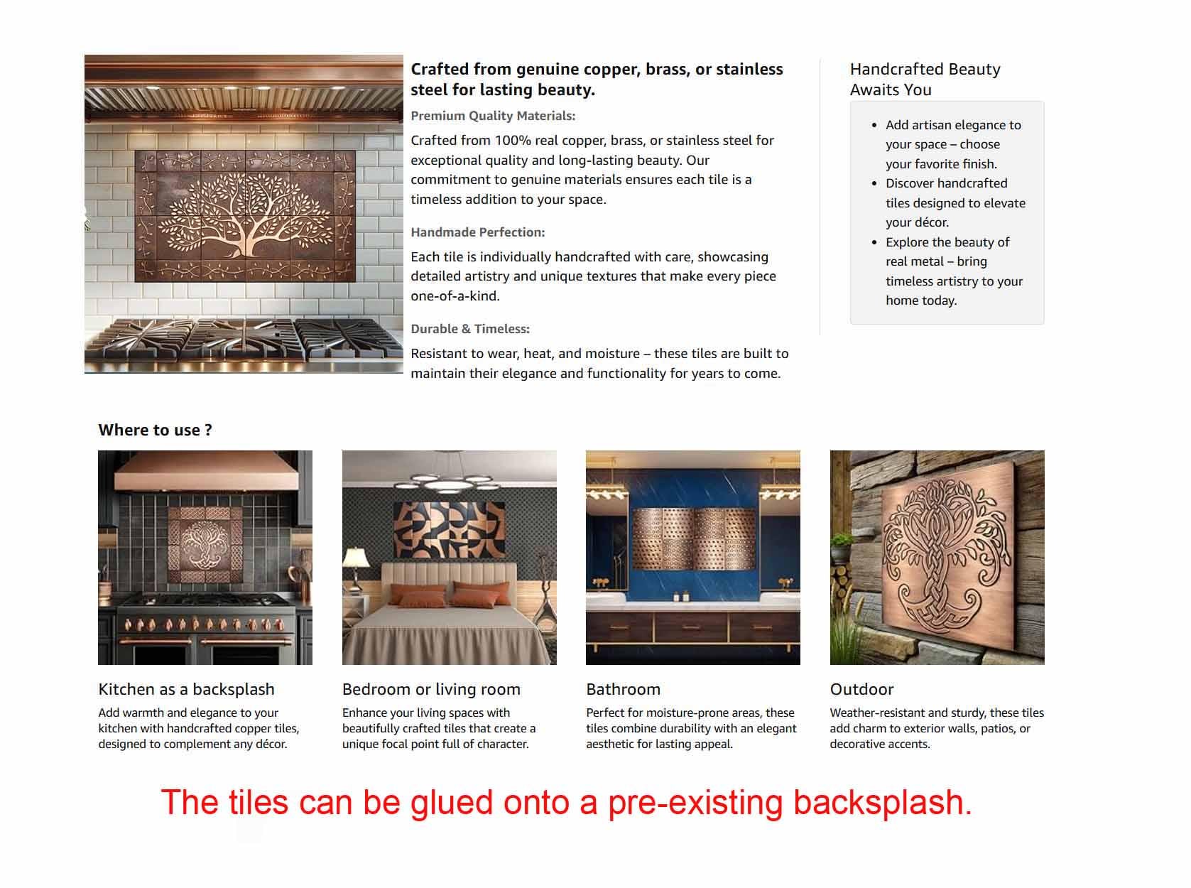All my tiles are made of 100% real copper. It is not painted plastic or other copper-colored material that you can see from other manufacturers. I also offer tiles made of 100% brass and stainless steel.