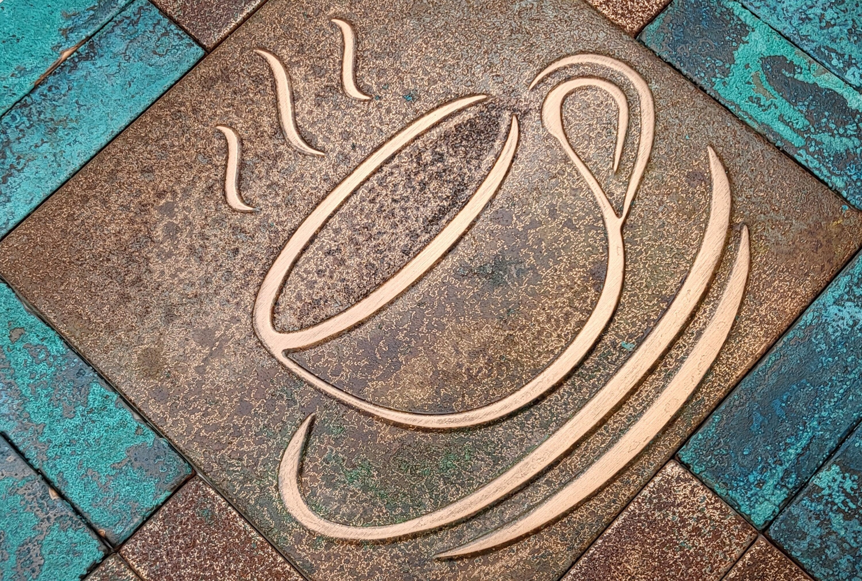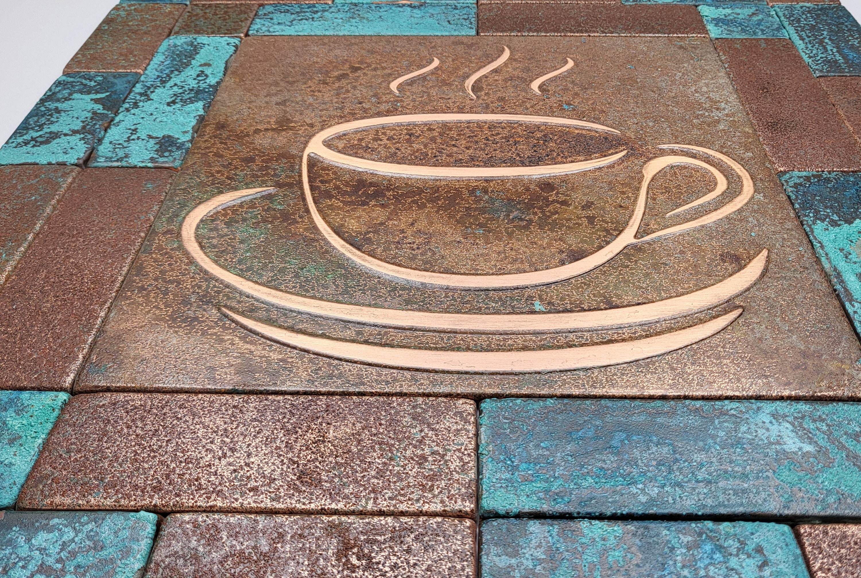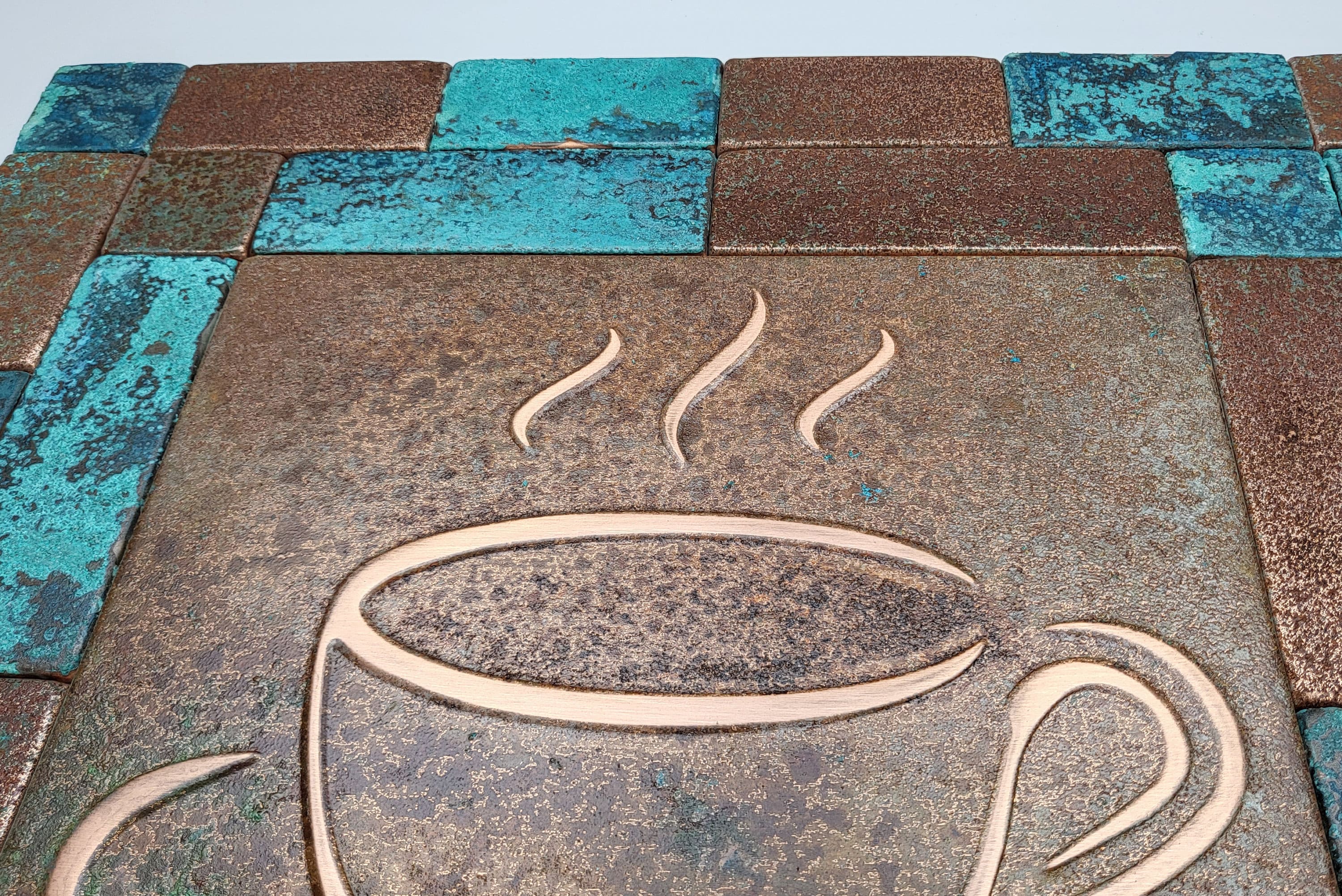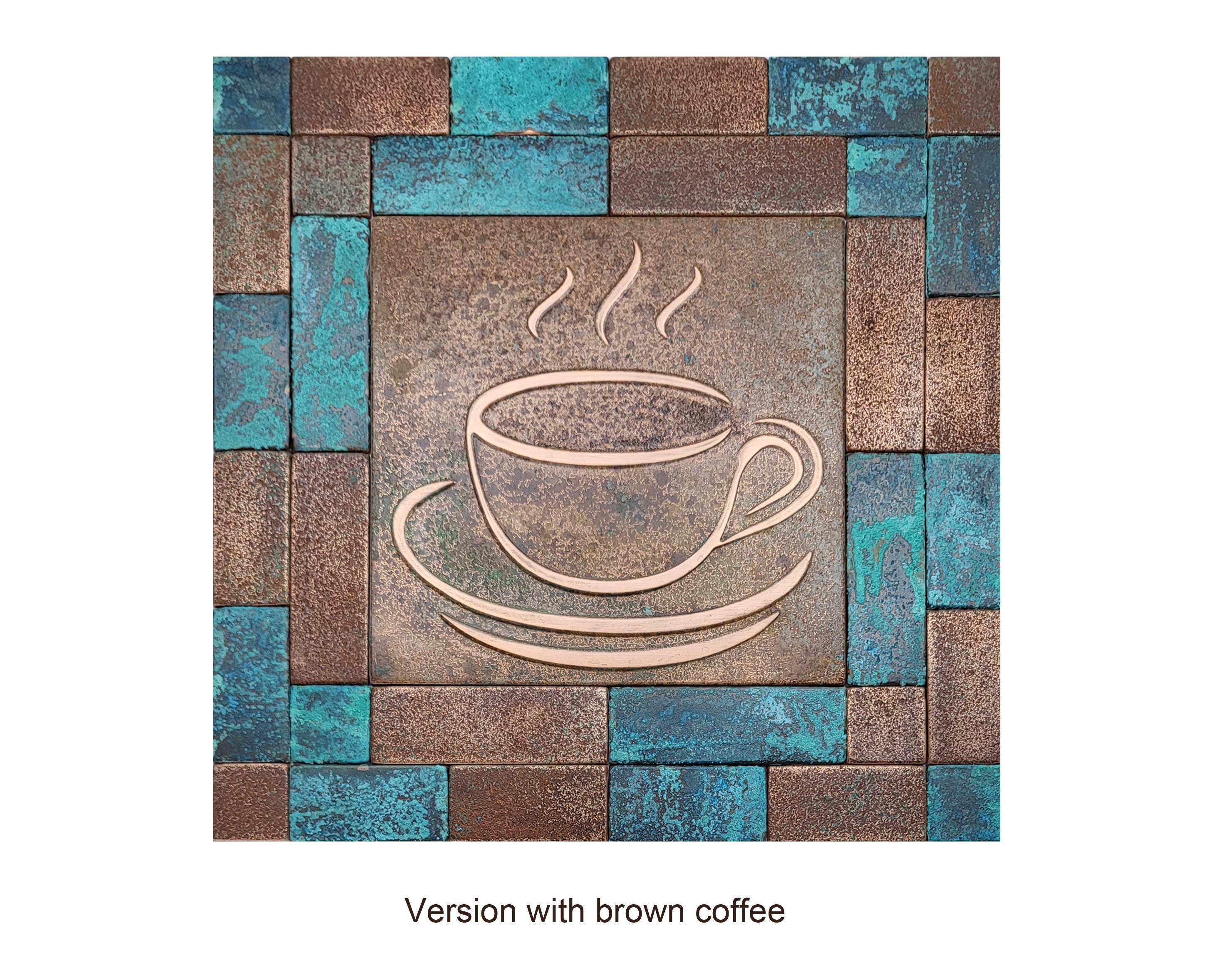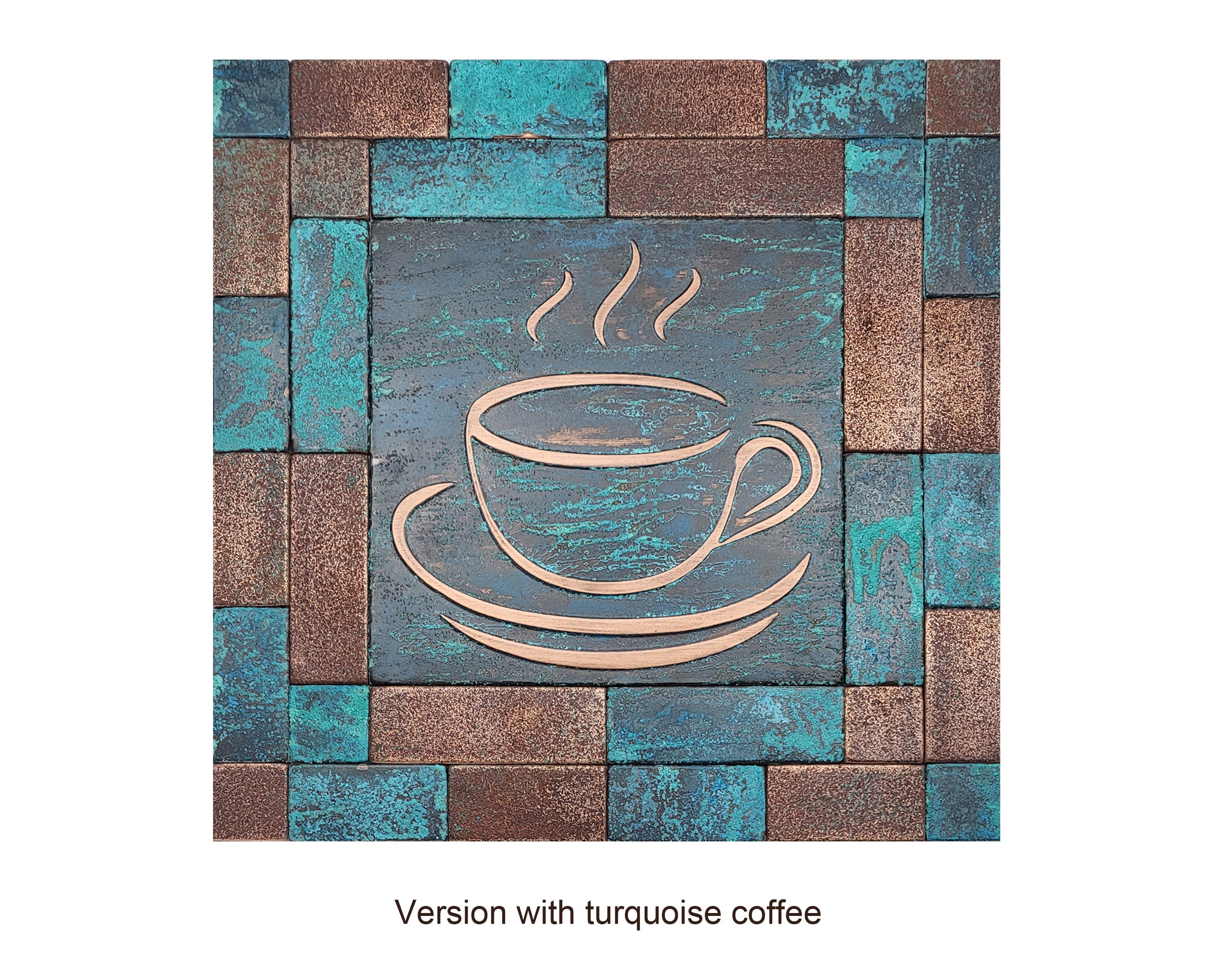 Elevate your kitchen with this set of handmade copper coffee-themed tiles. Featuring a beautifully detailed coffee pot, steaming cups, and scattered coffee beans, this rustic design is perfect for coffee lovers and those who cherish unique, artisanal decor. The natural patina finish enhances its timeless charm, making it a standout piece for your kitchen backsplash or wall.
