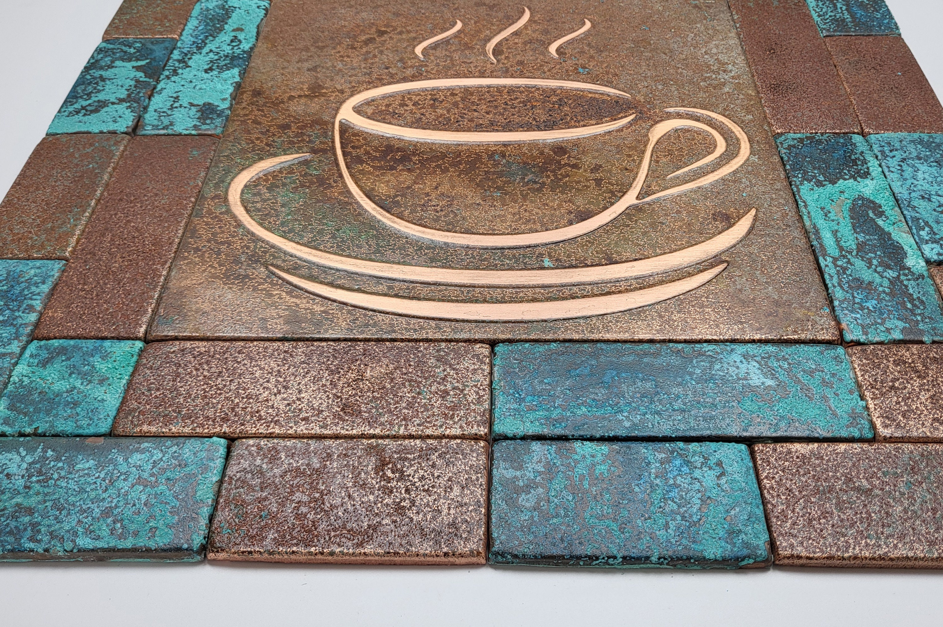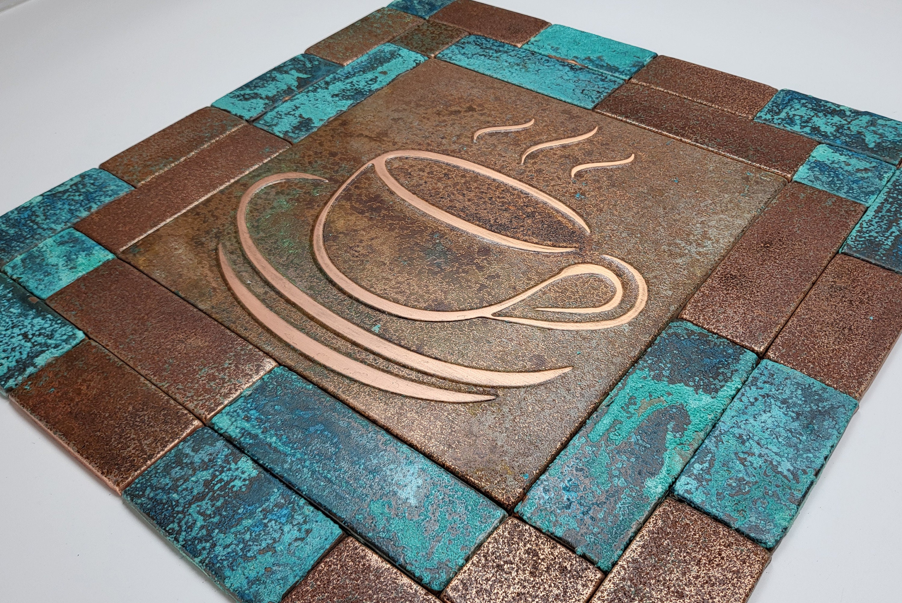 Handmade Copper Coffee Backsplash Tiles – Rustic Patina Wall Art for Kitchen Decor
