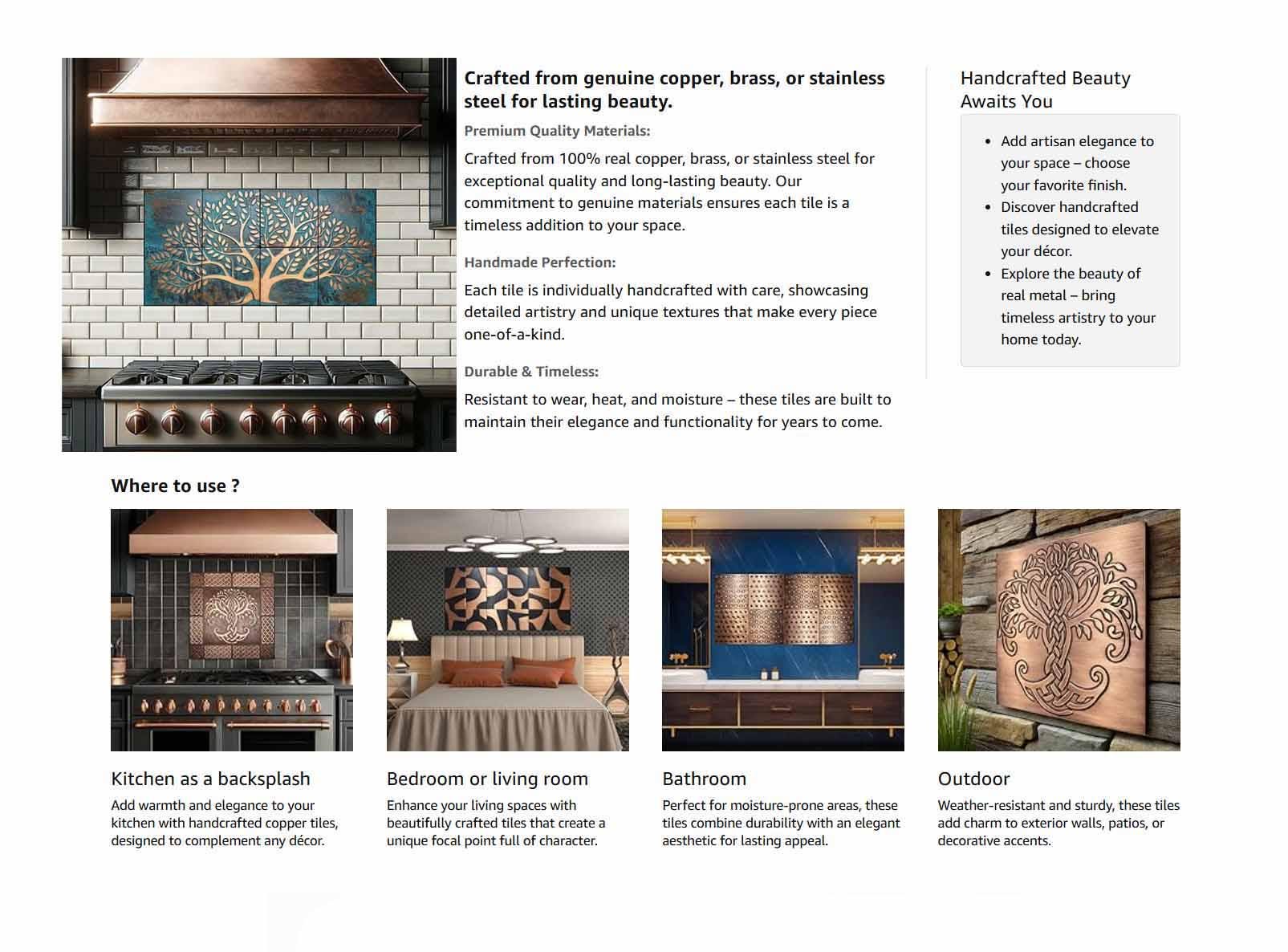 All my tiles are made of 100% real copper. It is not painted plastic or other copper-colored material that you can see from other manufacturers. I also offer tiles made of 100% brass and stainless steel.
