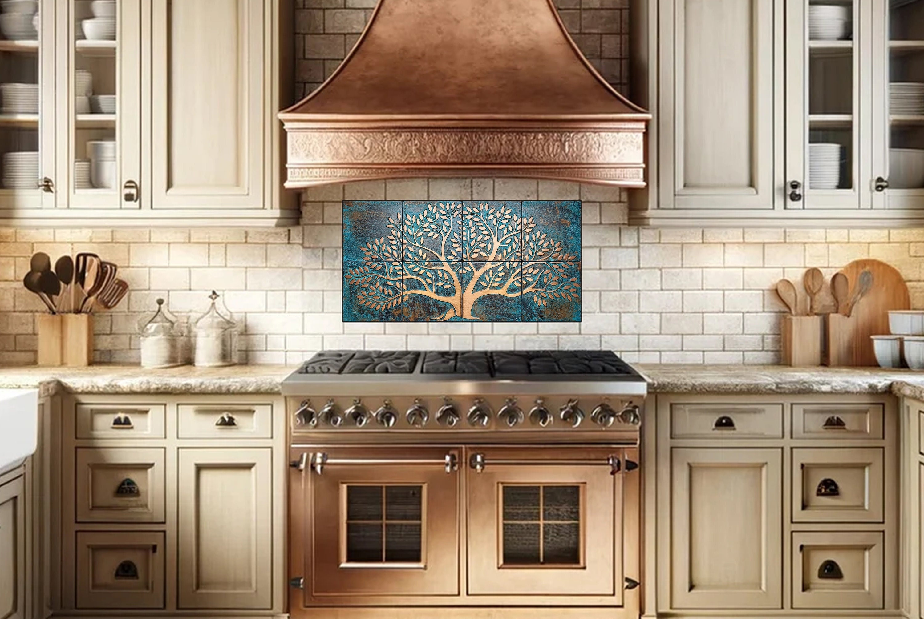Copper Tree of Life Wall Art – 8 Handmade Tiles with Natural Patina – Kitchen or Living Room Decor