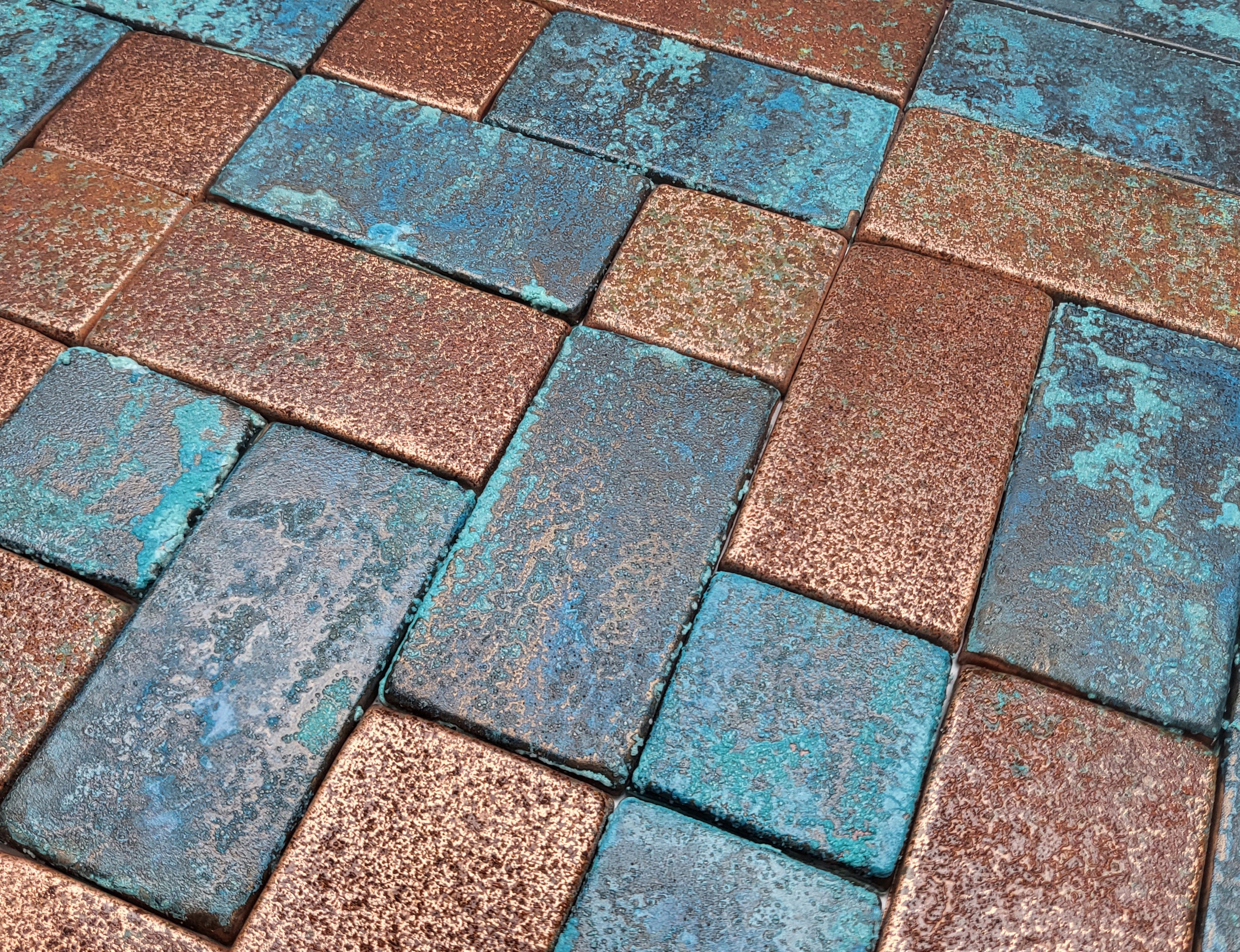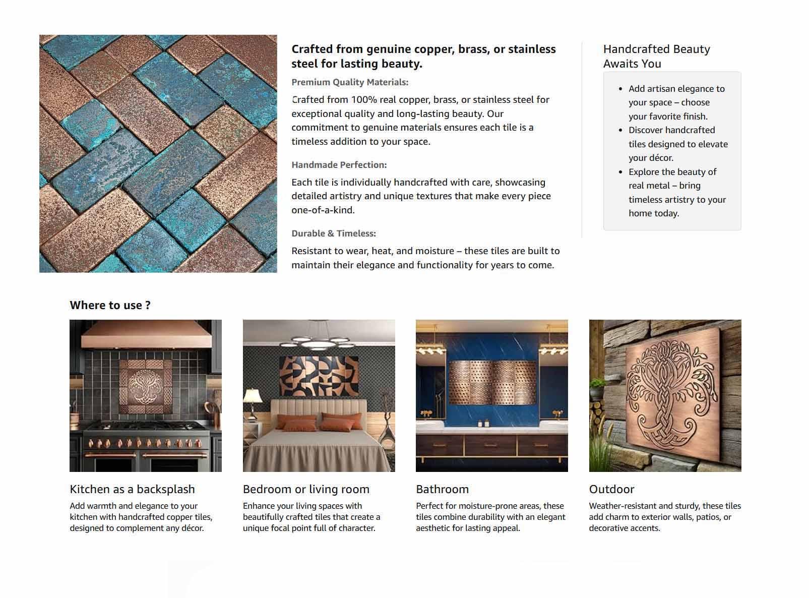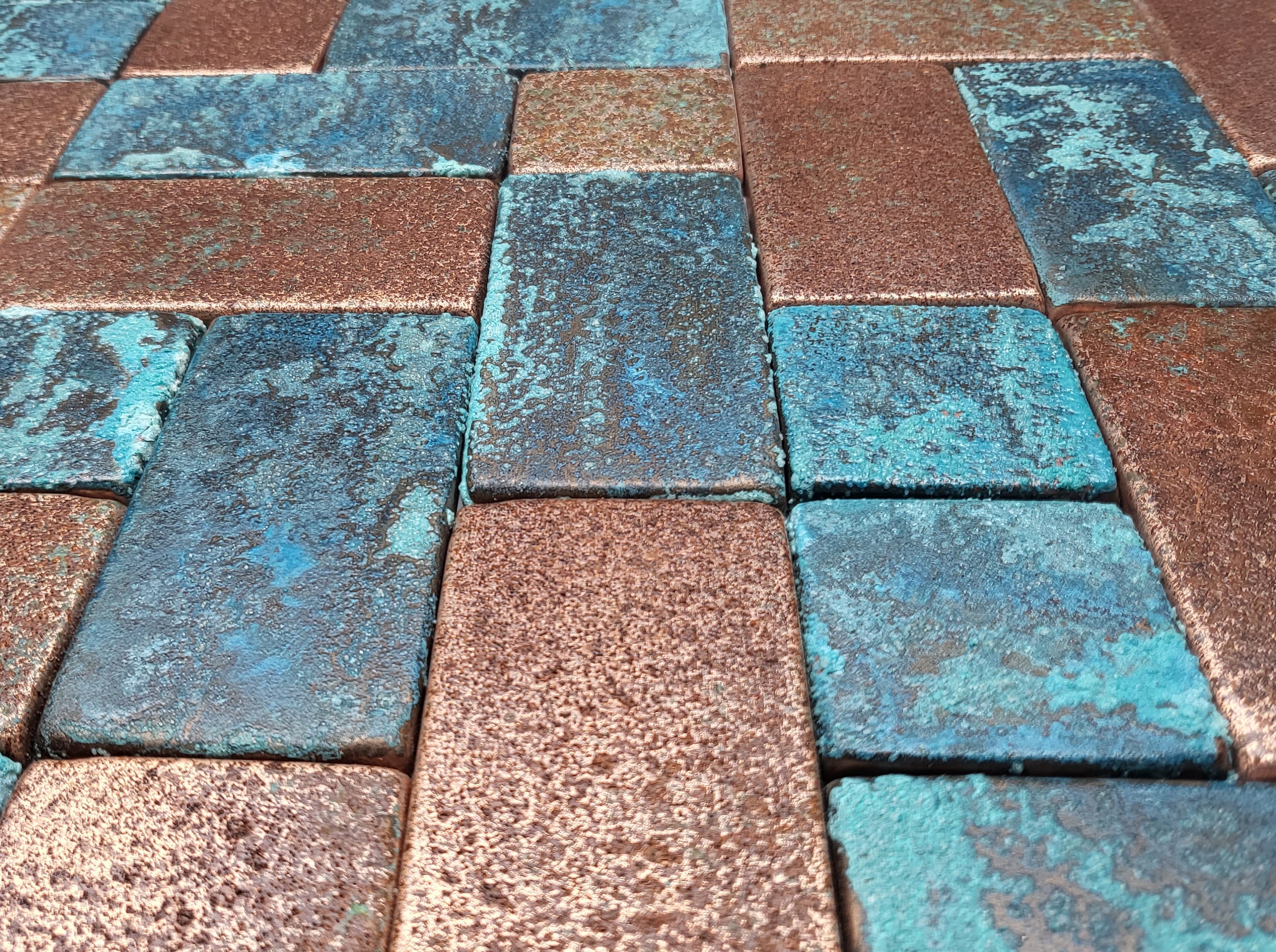 All my tiles are made of 100% real copper. It is not painted plastic or other copper-colored material that you can see from other manufacturers. I also offer tiles made of 100% brass and stainless steel.