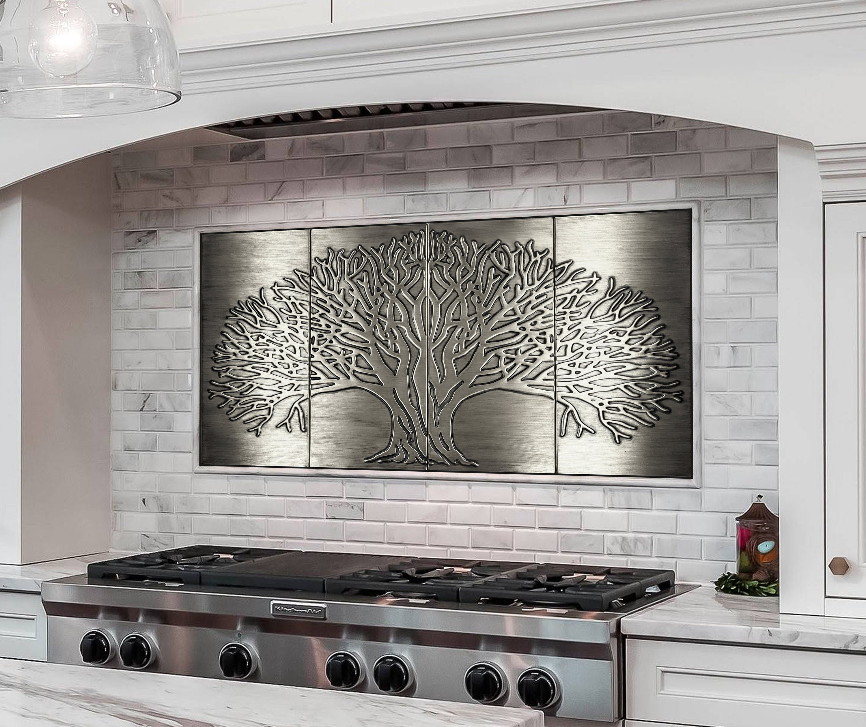 Crafted from 100% stainless steel, this four-piece wall panel showcases the iconic Tree of Life – a universal symbol of growth, strength, and connection. With its clean silver tone and crisp engraving, it’s the perfect focal point for luxury kitchens, contemporary backsplashes, or artistic feature walls.