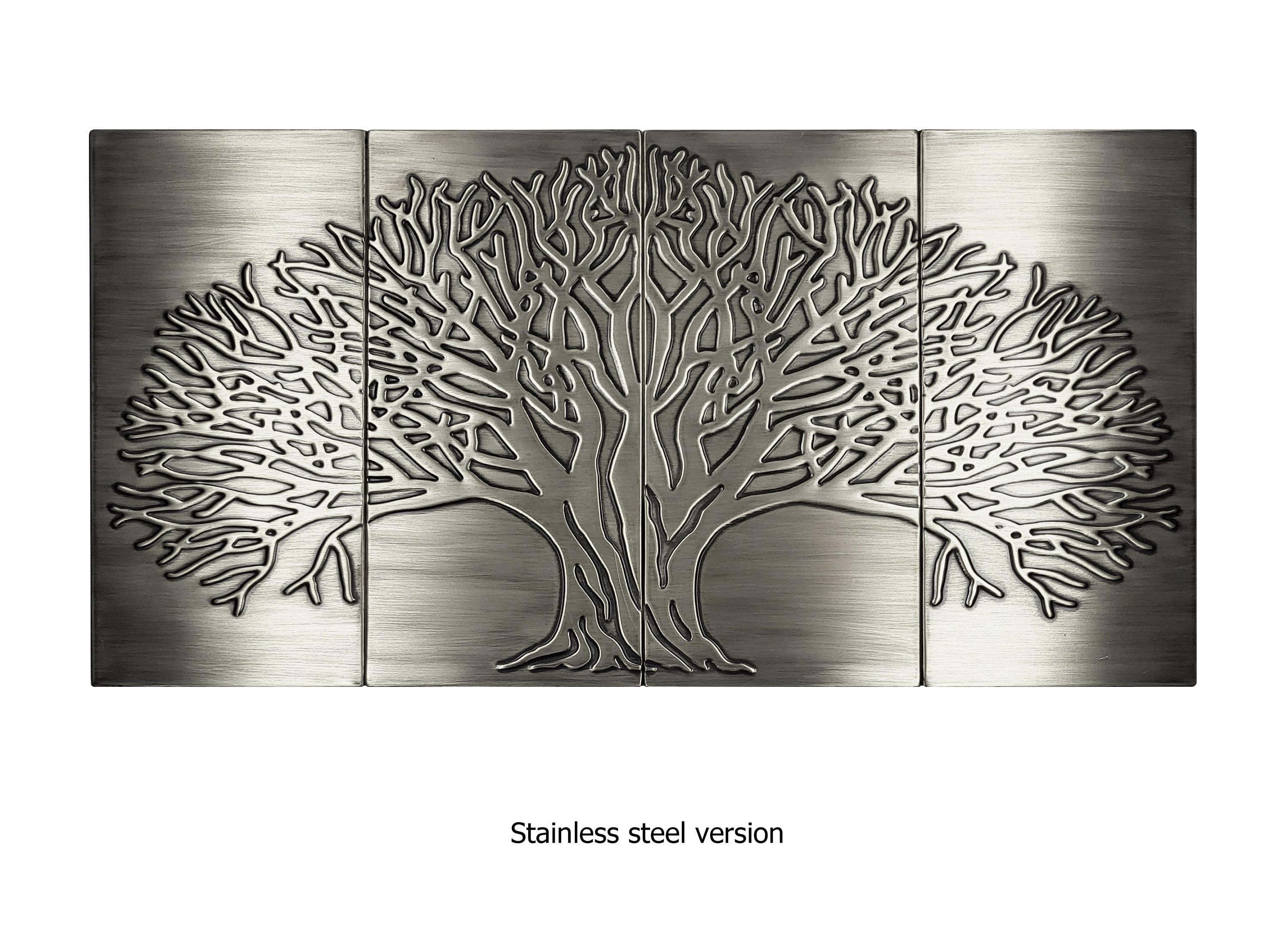 Brushed Stainless Steel Tree of Life – Set of 4 Modern Metal Wall Tiles | Handmade Backsplash for Contemporary Kitchen or Fireplace