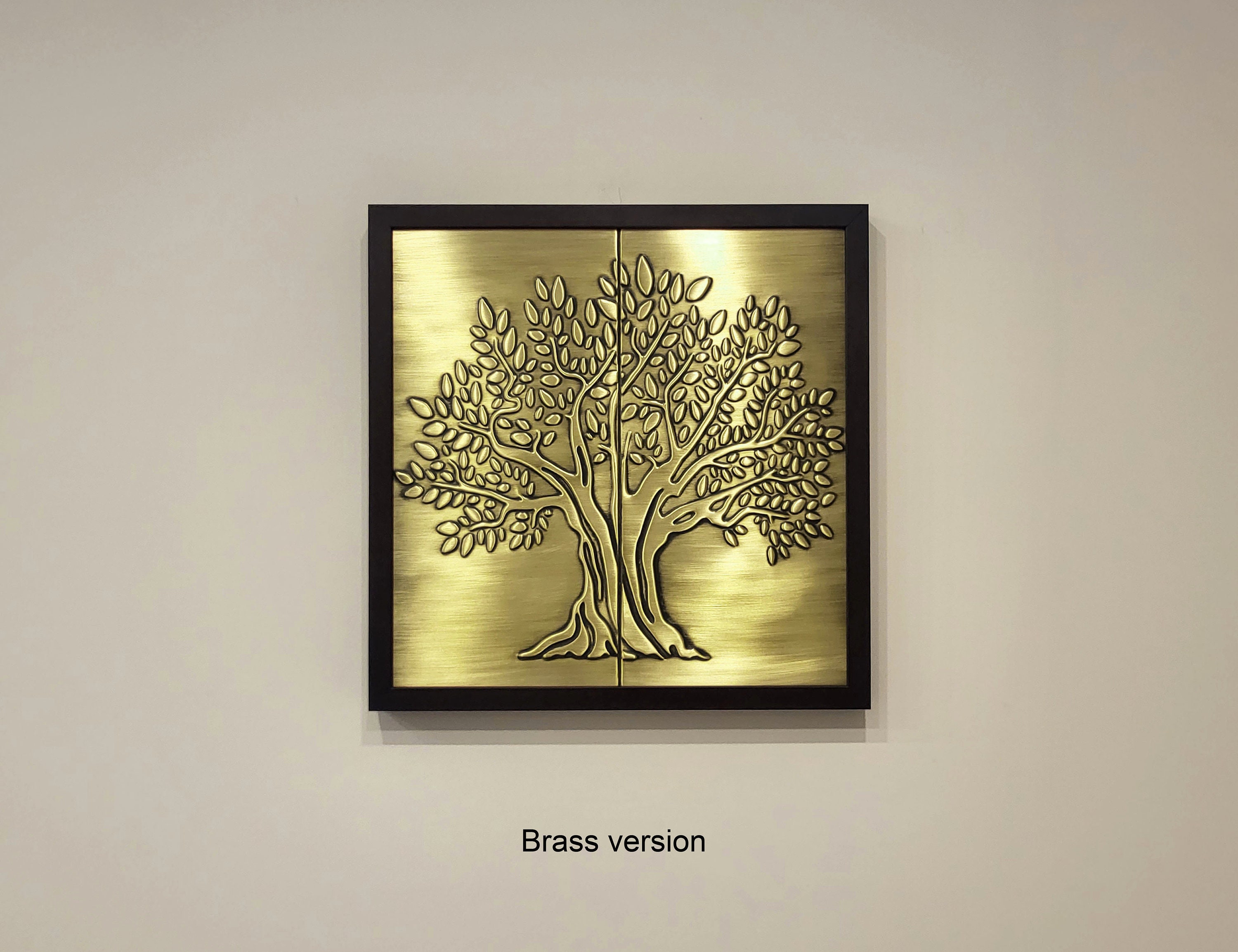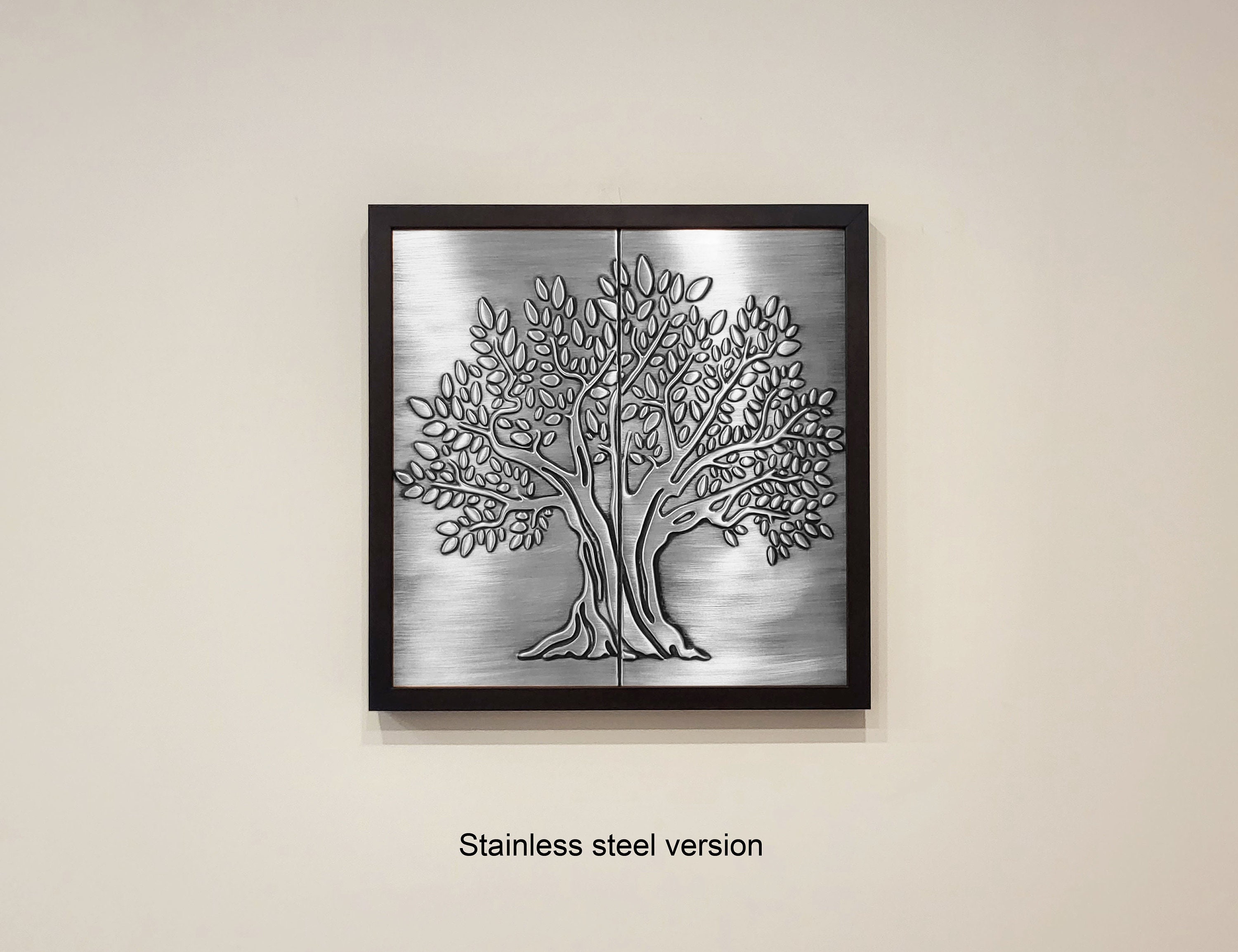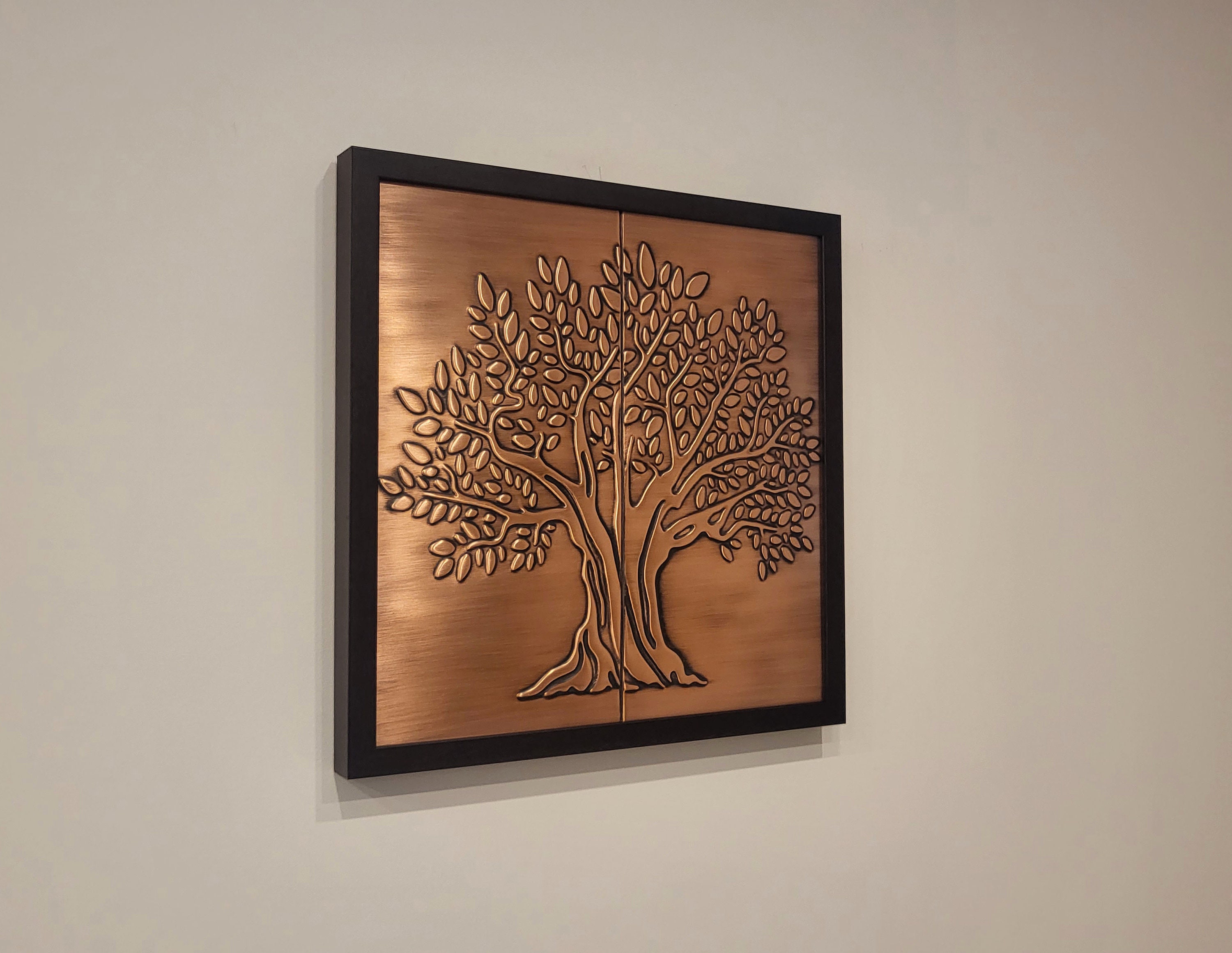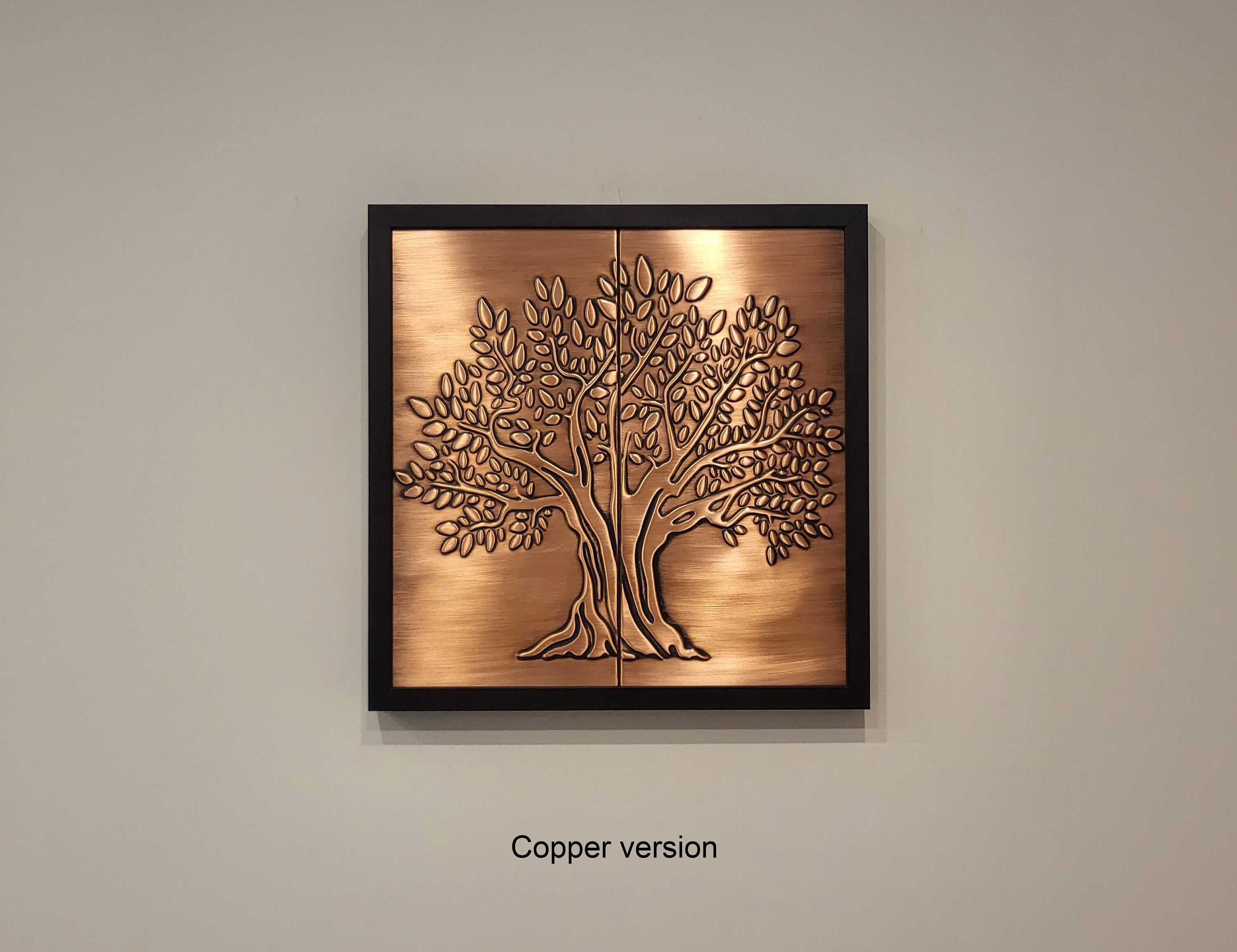 A tree on two handmade tiles in a wooden frame. 100% Copper, Stainless Steel or Brass.