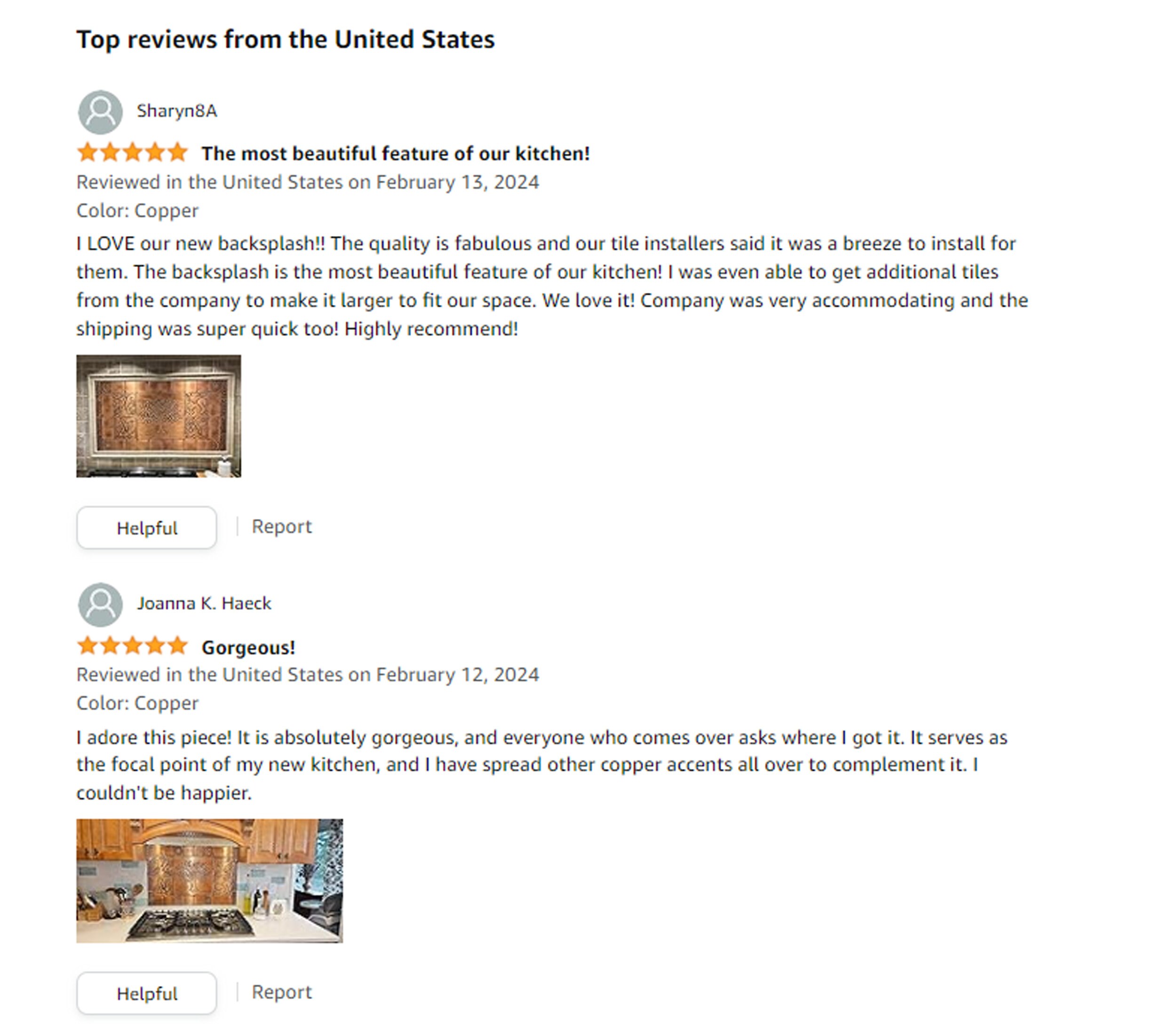 All my tiles are made of 100% real copper. It is not painted plastic or other copper-colored material that you can see from other manufacturers. I also offer tiles made of 100% brass and stainless steel.