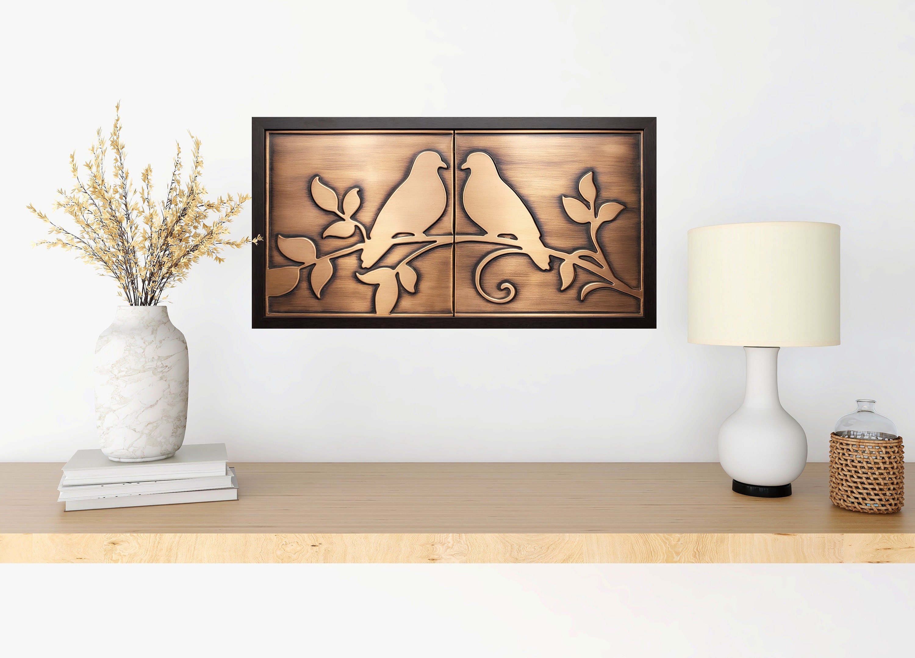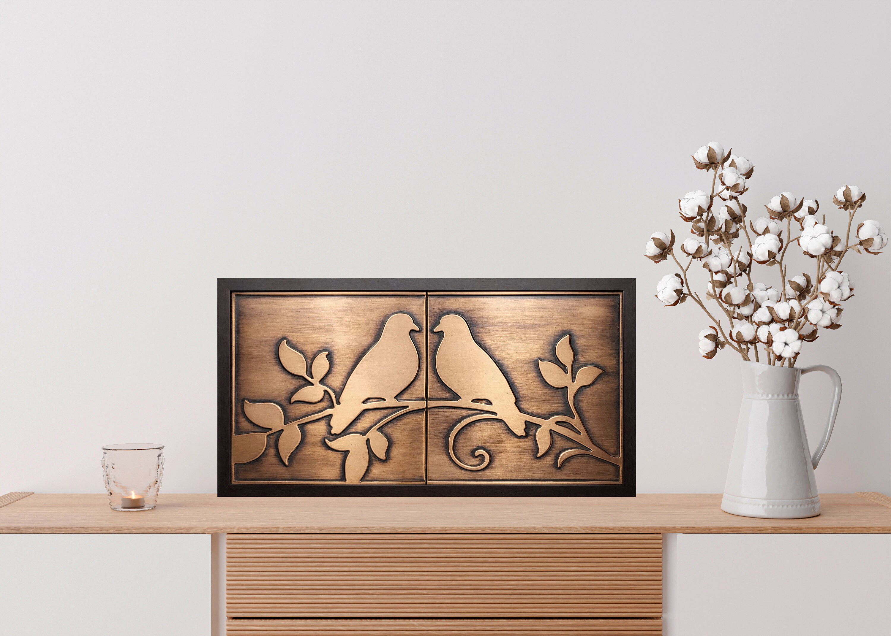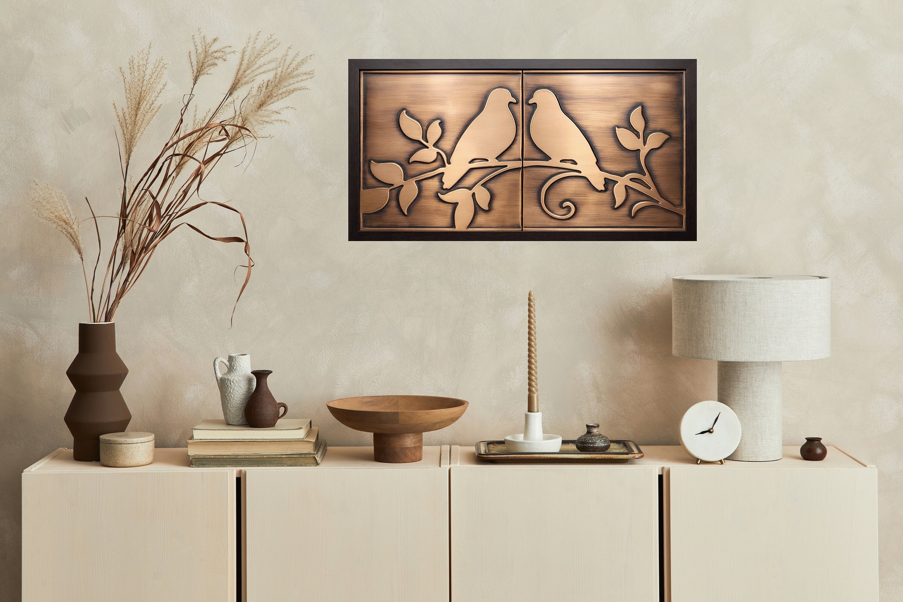 Each set is made from real copper, brass, or stainless steel, and deeply etched with precision to highlight every feather and curve. Finished in a warm, rustic tone and framed for easy hanging, it’s the perfect accent for any romantic space – bedroom, hallway, or living room.