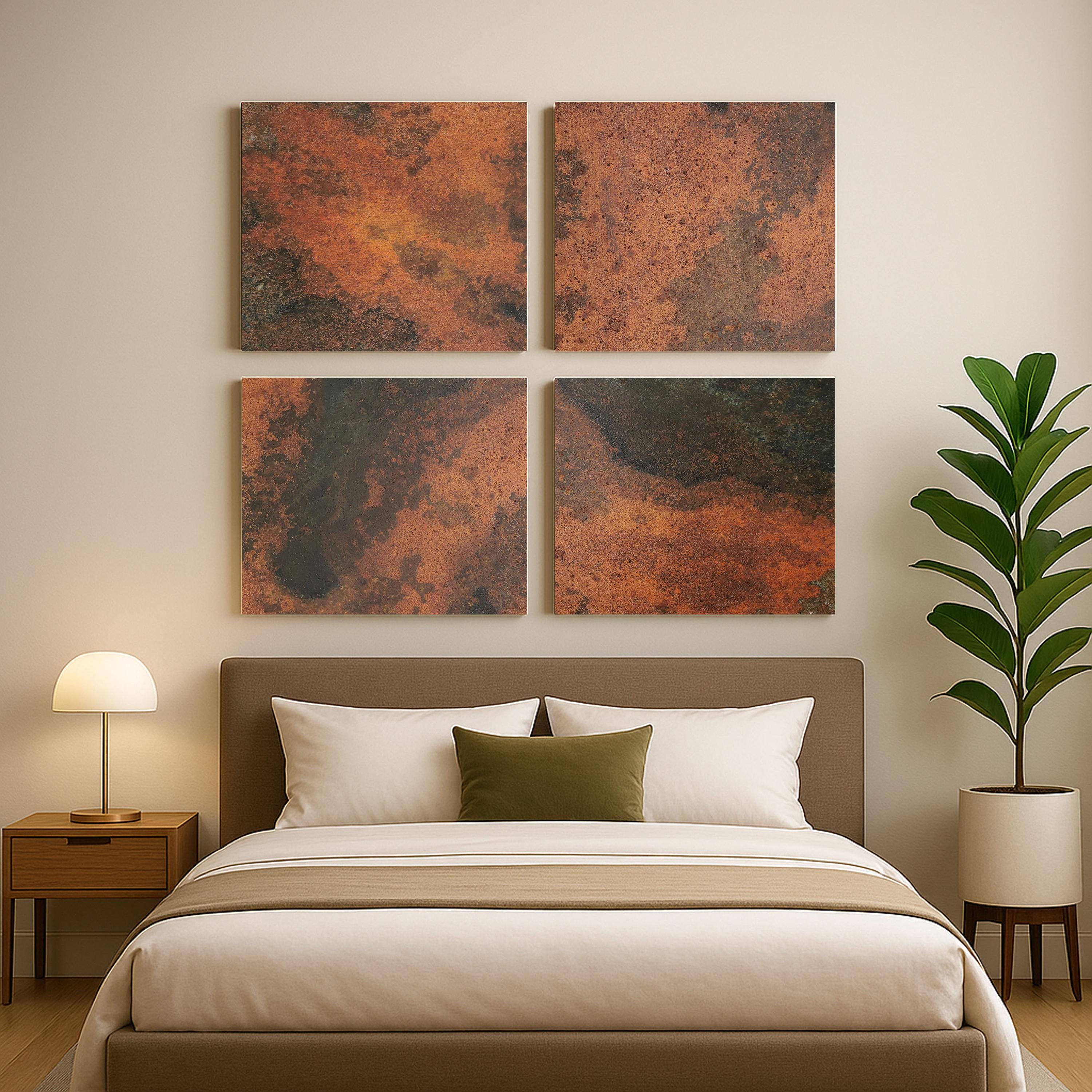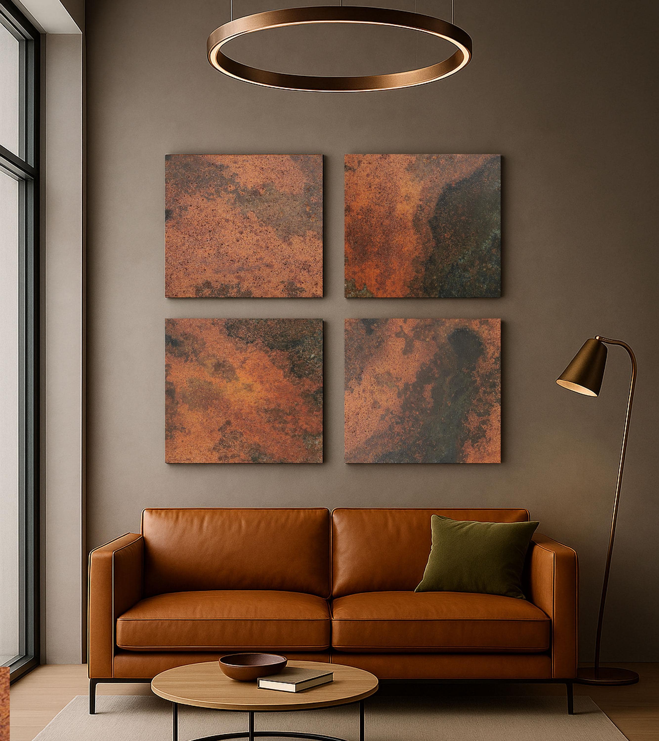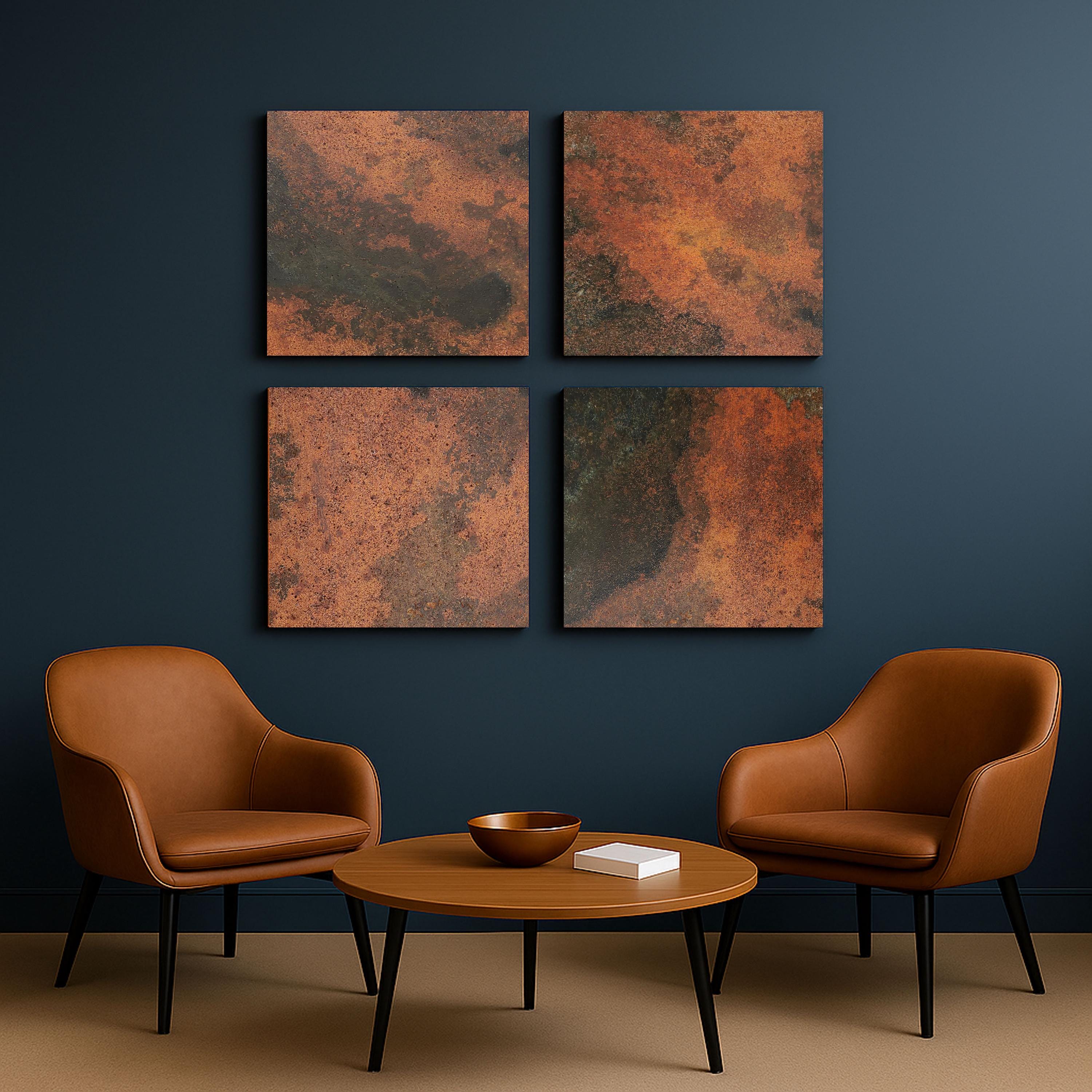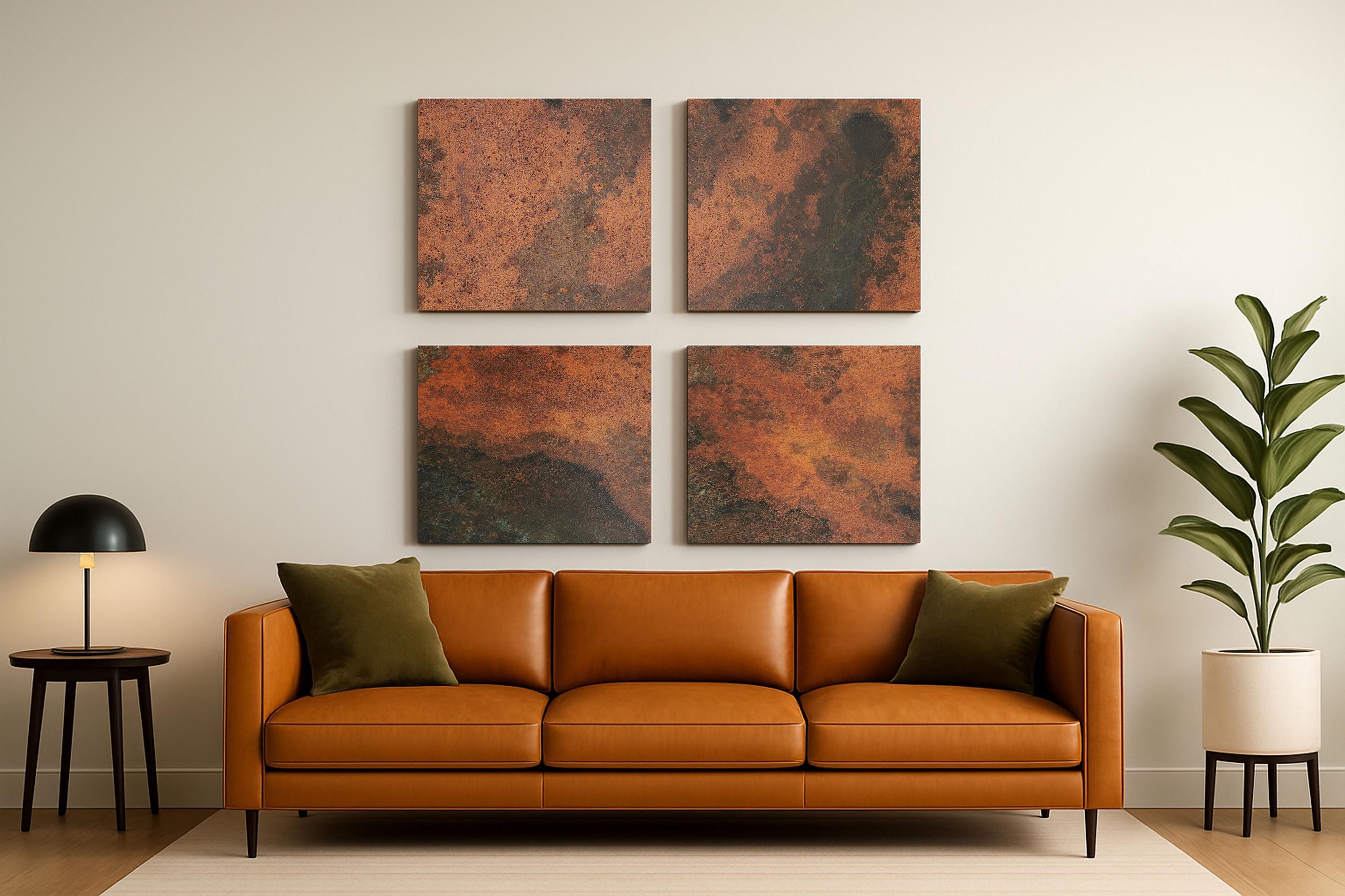 Each square panel is carefully patinated by hand, revealing natural gradients that resemble scorched earth, magma flows, or a cosmic storm seen from orbit. The result? A breathtaking 2x2 grid installation that radiates energy, intensity, and organic power.