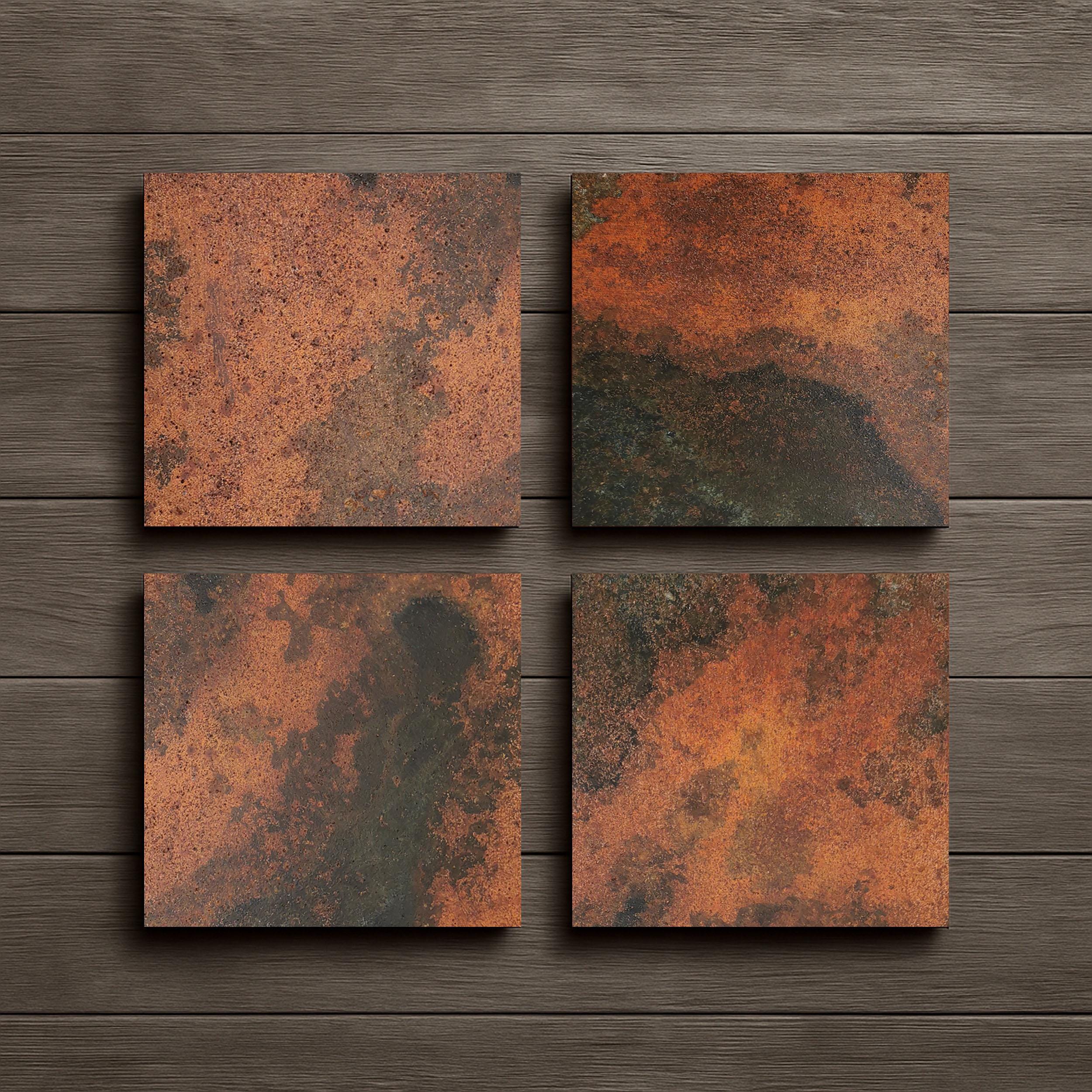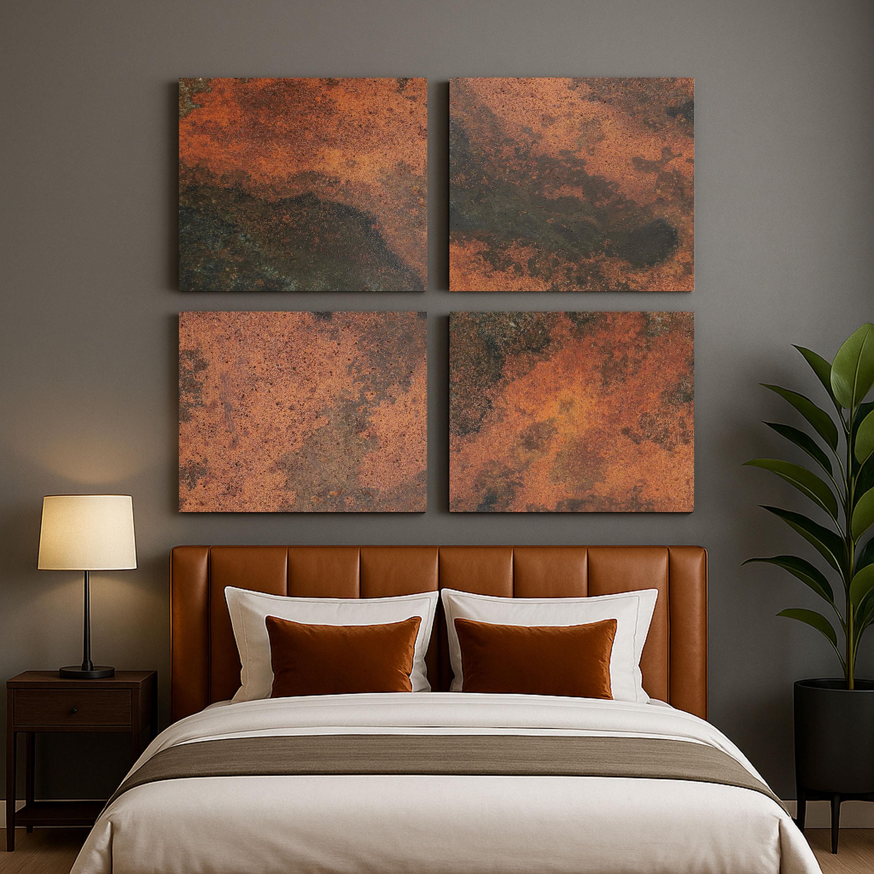 This 4-piece square panel wall art set is handmade from real copper and finished with our signature Eternal Copper Inferno patina – a fiery blend of burnt sienna, volcanic orange, and deep charcoal black.