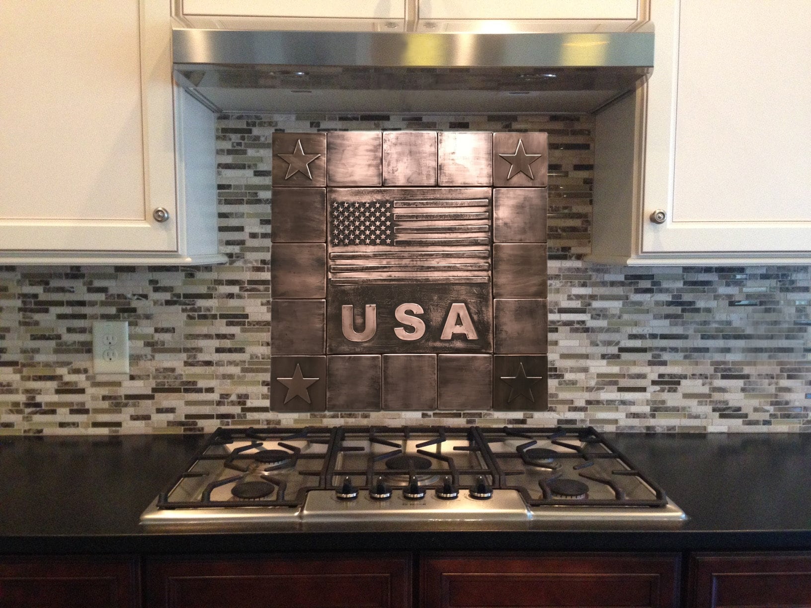 This rustic, handmade, custom copper tile with a flag which has become iconic (not only in the USA), surrounded with 12 plain copper tiles and 4 tiles with an art deco star is a timeless decoration. Just imagine looking at the symbol of freedom, liberty and human rights, in your kitchen as a backsplash, above your fireplace, in your living room or...anywhere you want.