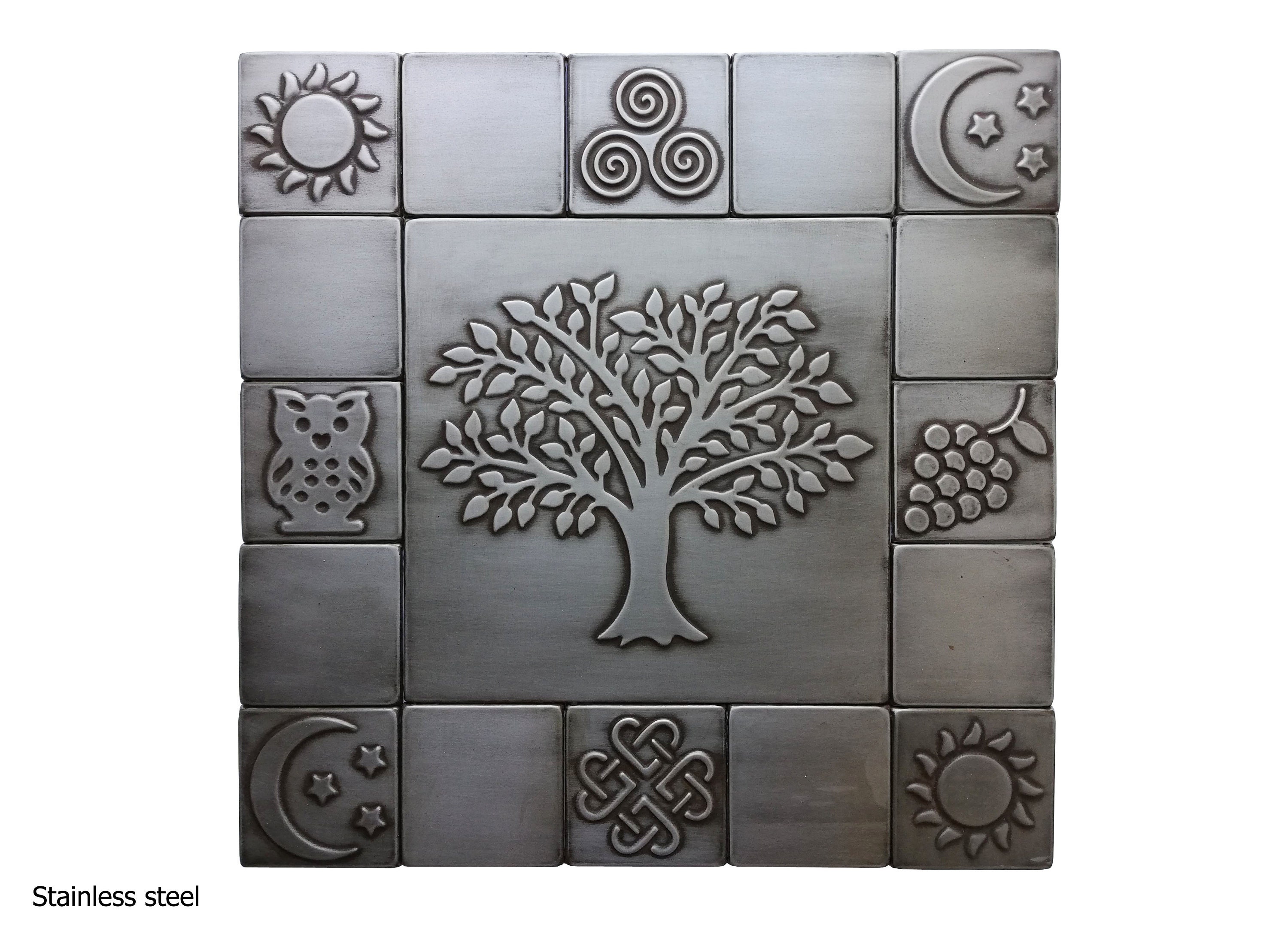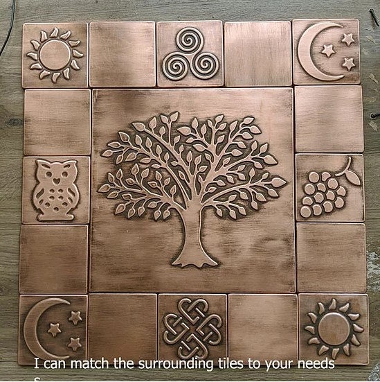 This handmade copper backsplash tile shows a metaphor and a research tool introduced by Darwin in order to visualize his view on relationships between living and extinct creatures, as well as similarities between different species. Since the tree of life raises a timeless question of life and evanescence, it is an extremely popular theme in contemporary art. The main tile is surrounded with 8 plain tiles, 4 tiles with an owl, 2 tiles with a moon and 2 with a sun. The size of each surrounding tile is 3.93" x 3.93" (10cm x 10cm).