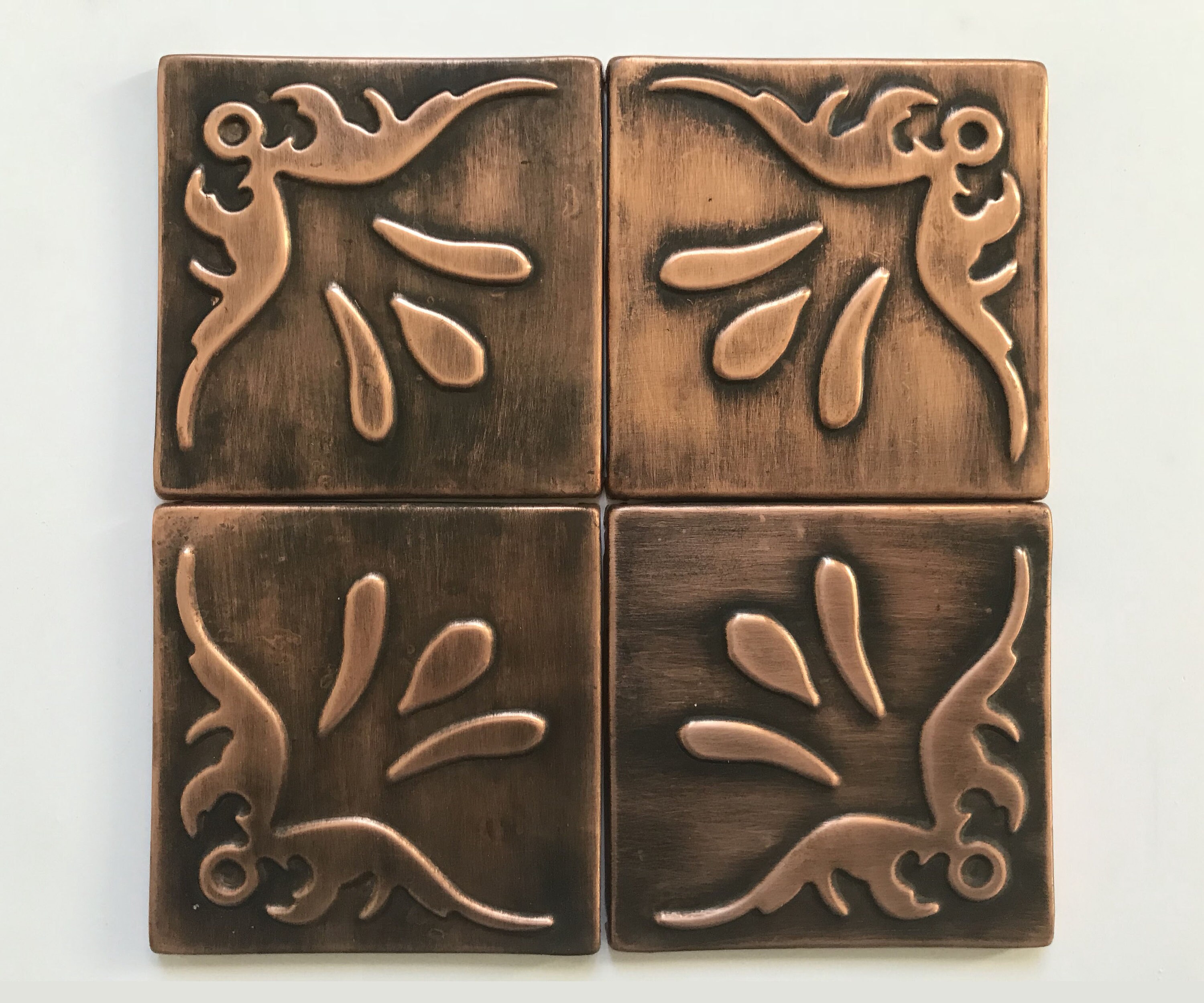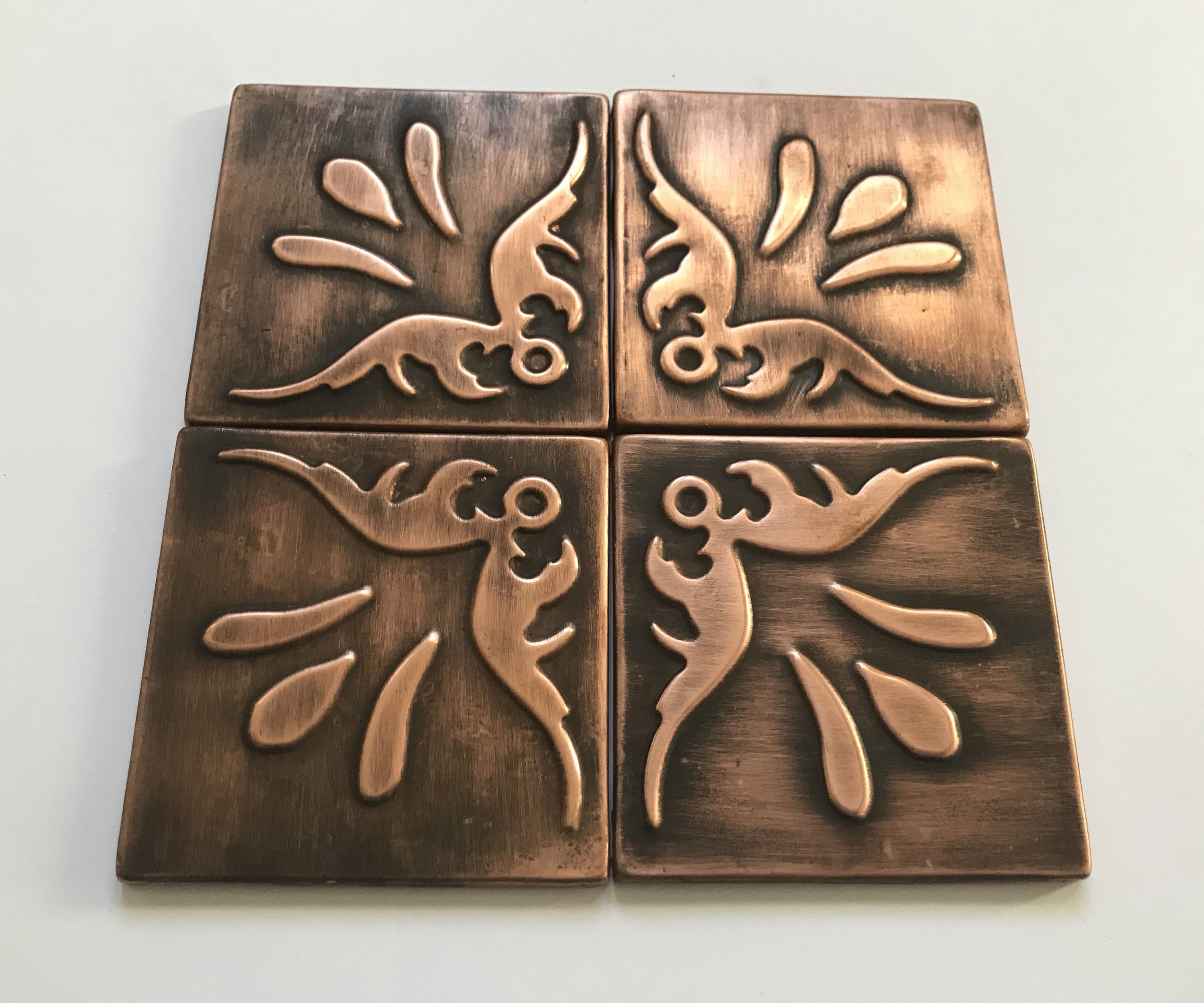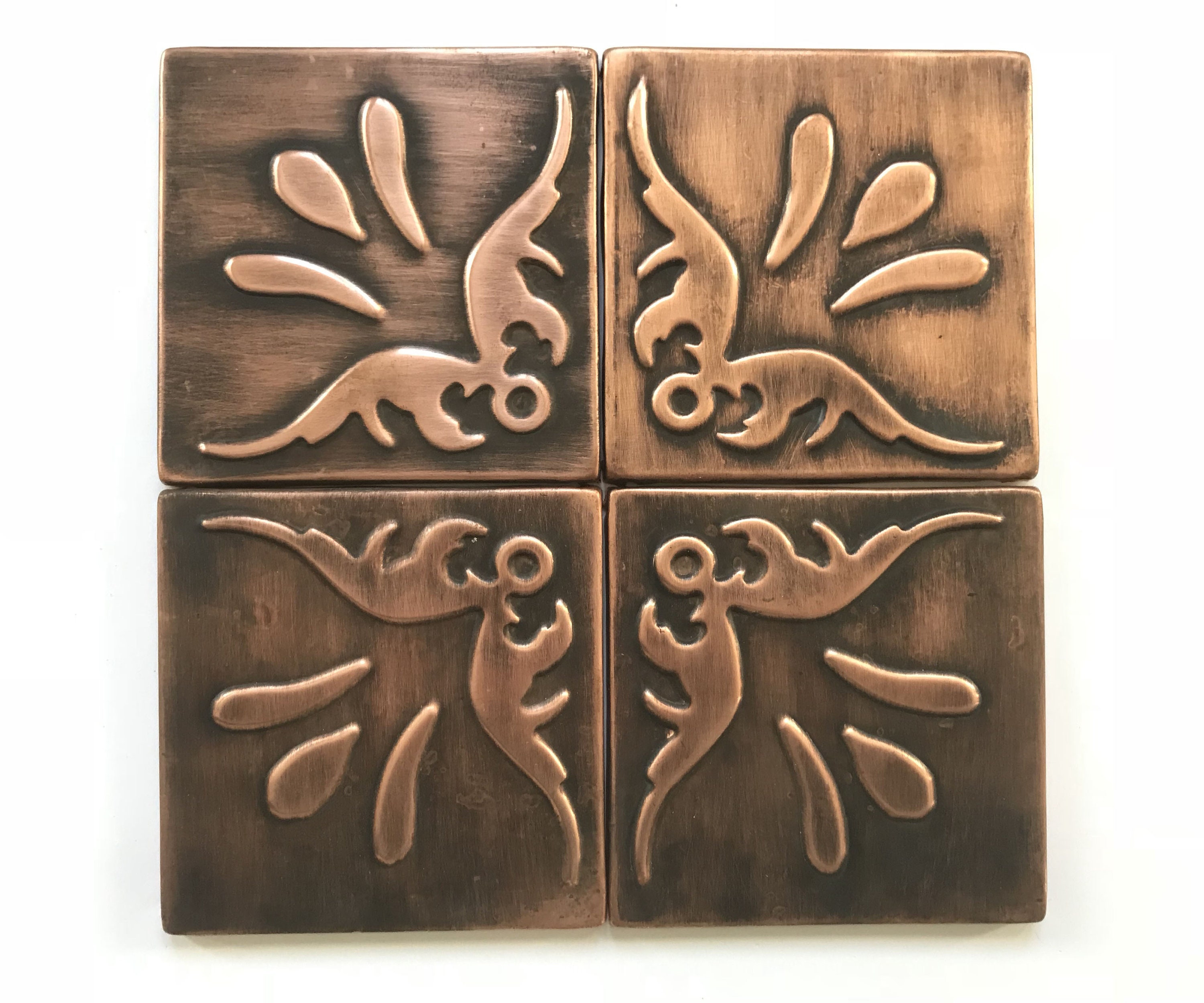 This set of custom, ornamental copper tiles is a great solution for someone who wants to create their own composition. It can be used solo or arranged with many different patterns (for example our mosaic copper tiles) or it can surround plain copper tiles.