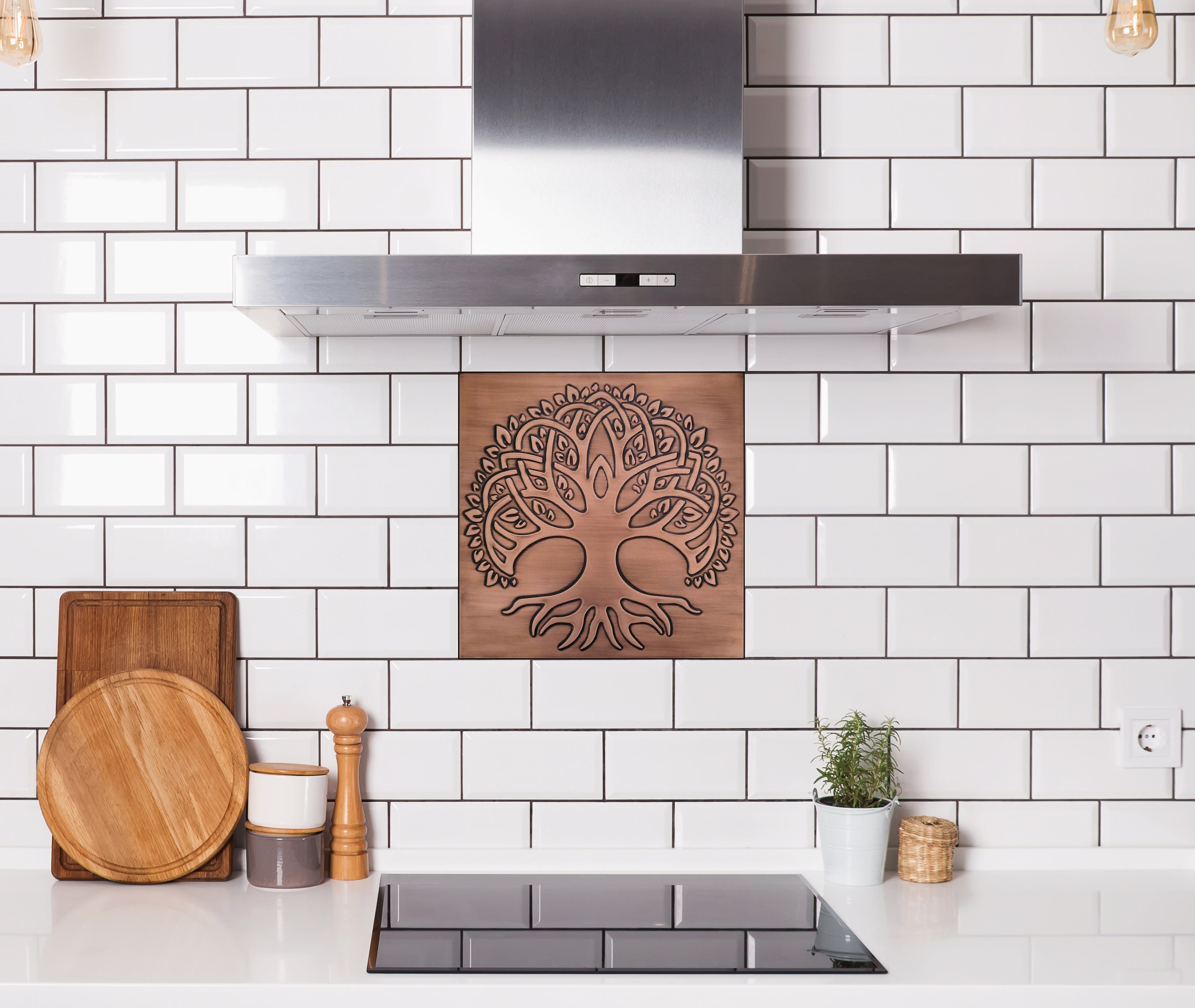 This handmade copper backsplash tile shows a metaphor and a research tool introduced by Darwin in order to visualize his view on relationships between living and extinct creatures, as well as similarities between different species. Since the tree of life raises a timeless question of life and evanescence, it is an extremely popular theme in contemporary art.