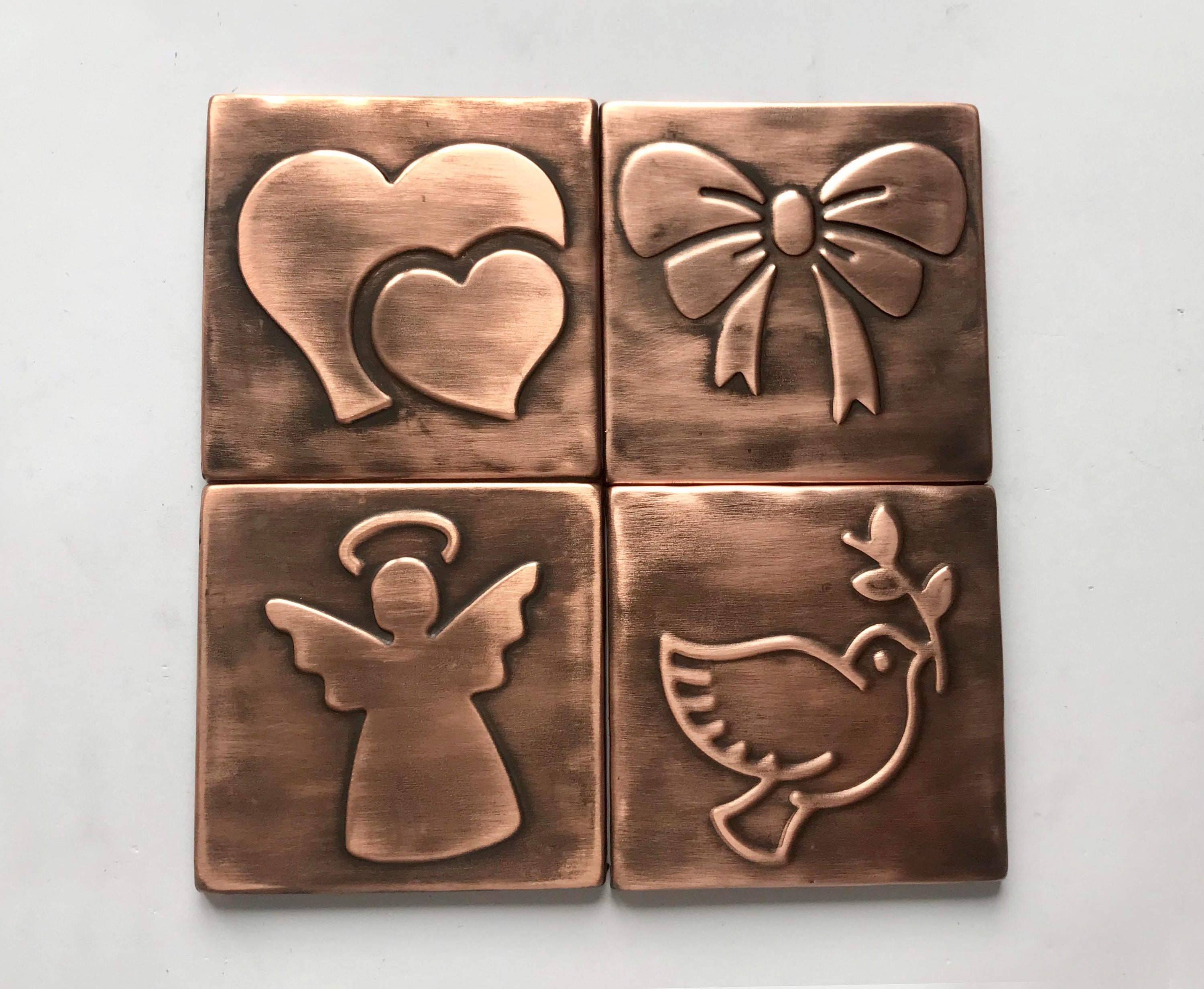 This set of 4 "peace and love" copper tiles is a great solution for someone who wants to create their own composition. It can be used solo or arranged with many different patterns (for example our mosaic copper tiles) or it can surround plain copper tiles.