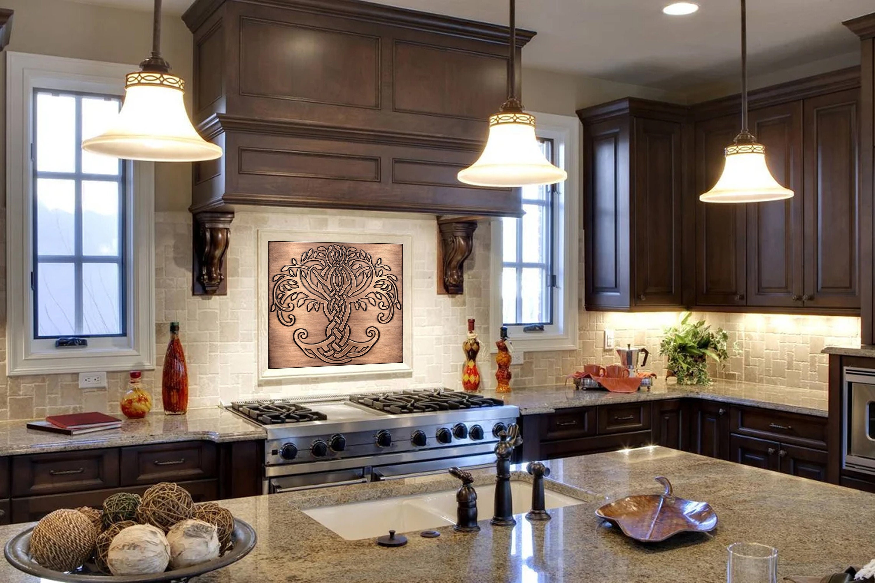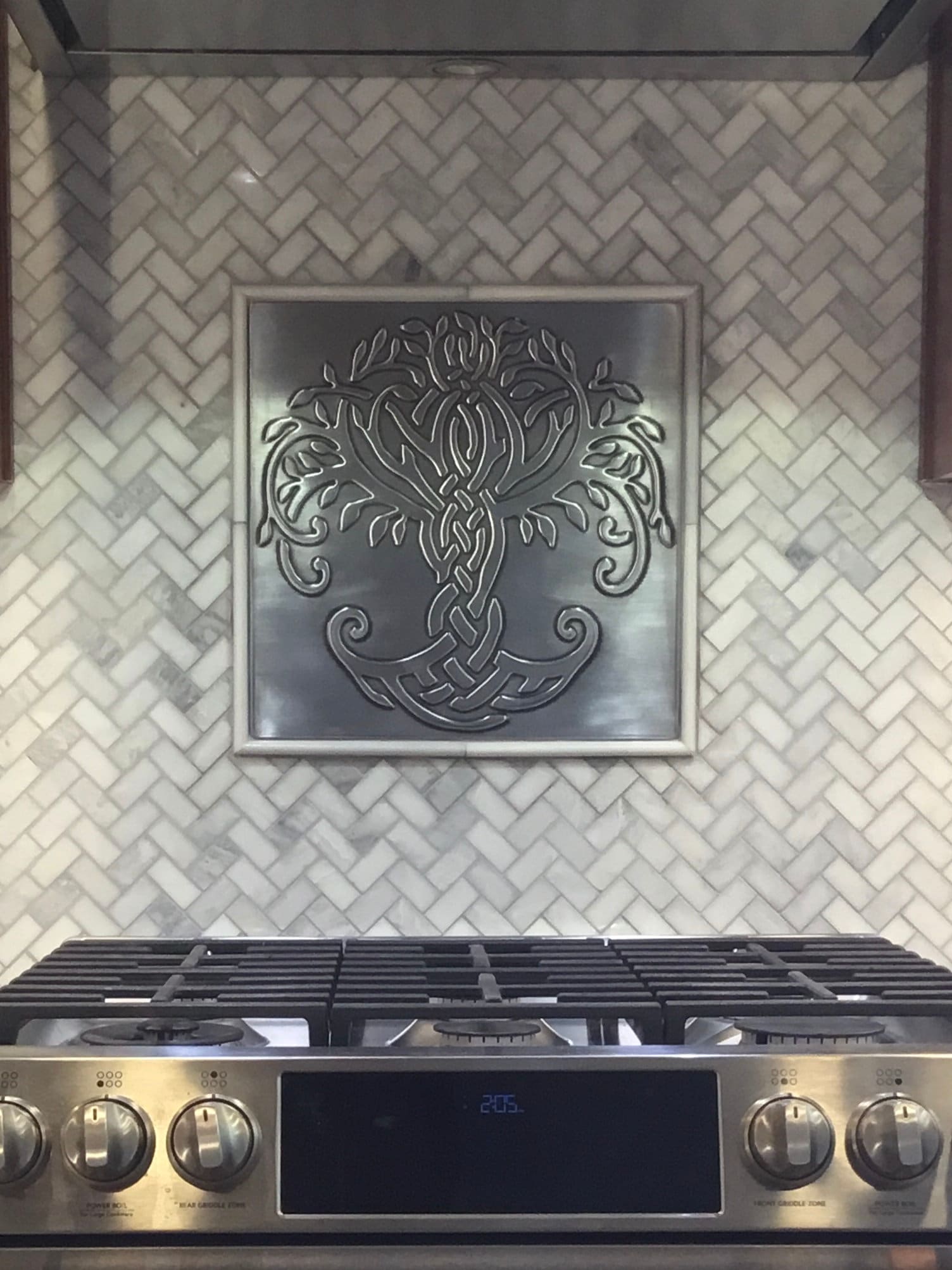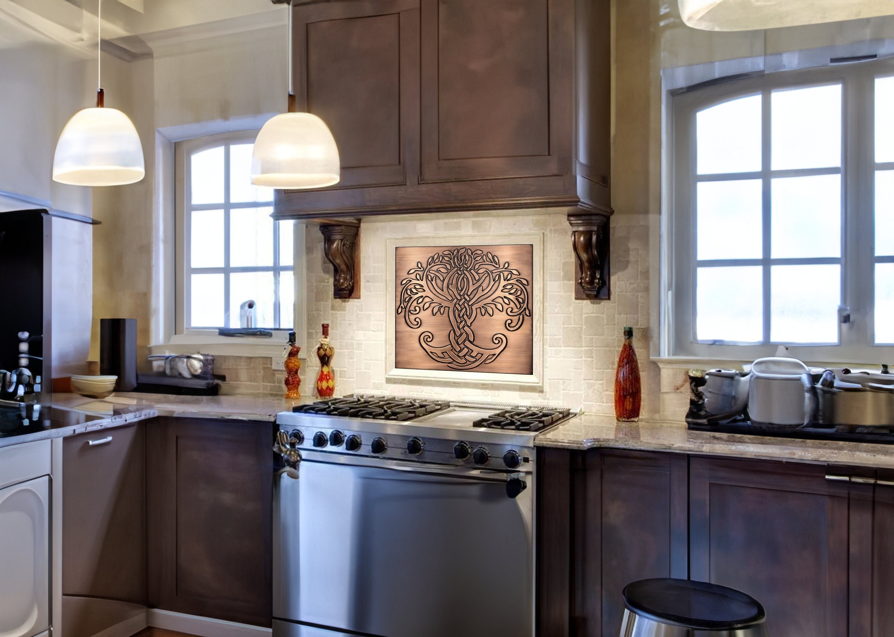 This handmade copper backsplash tile shows a metaphor and a research tool introduced by Darwin in order to visualize his view on relationships between living and extinct creatures, as well as similarities between different species. Since the tree of life raises a timeless question of life and evanescence, it is an extremely popular theme in contemporary art.