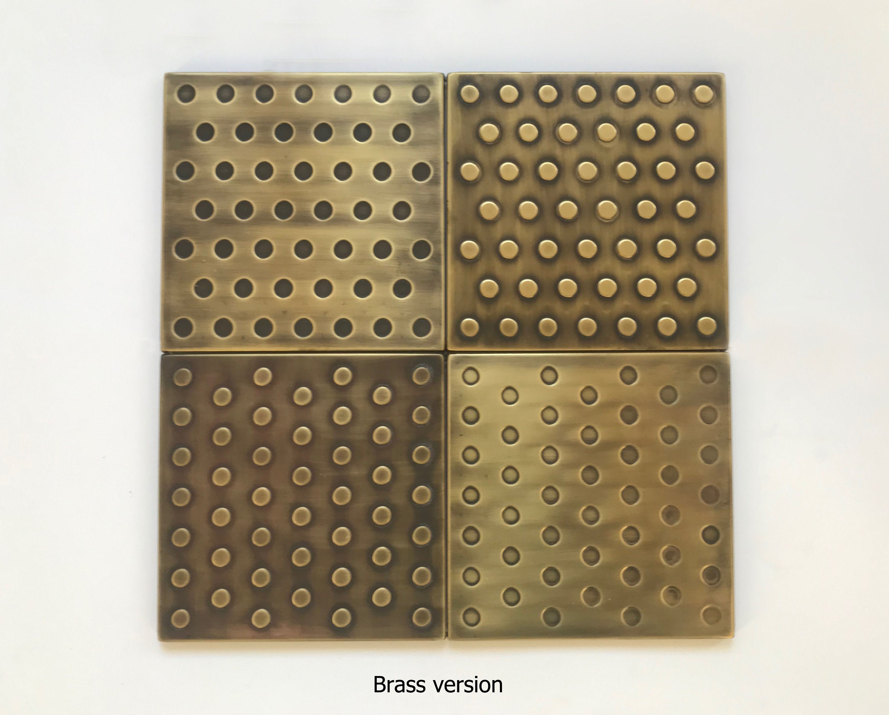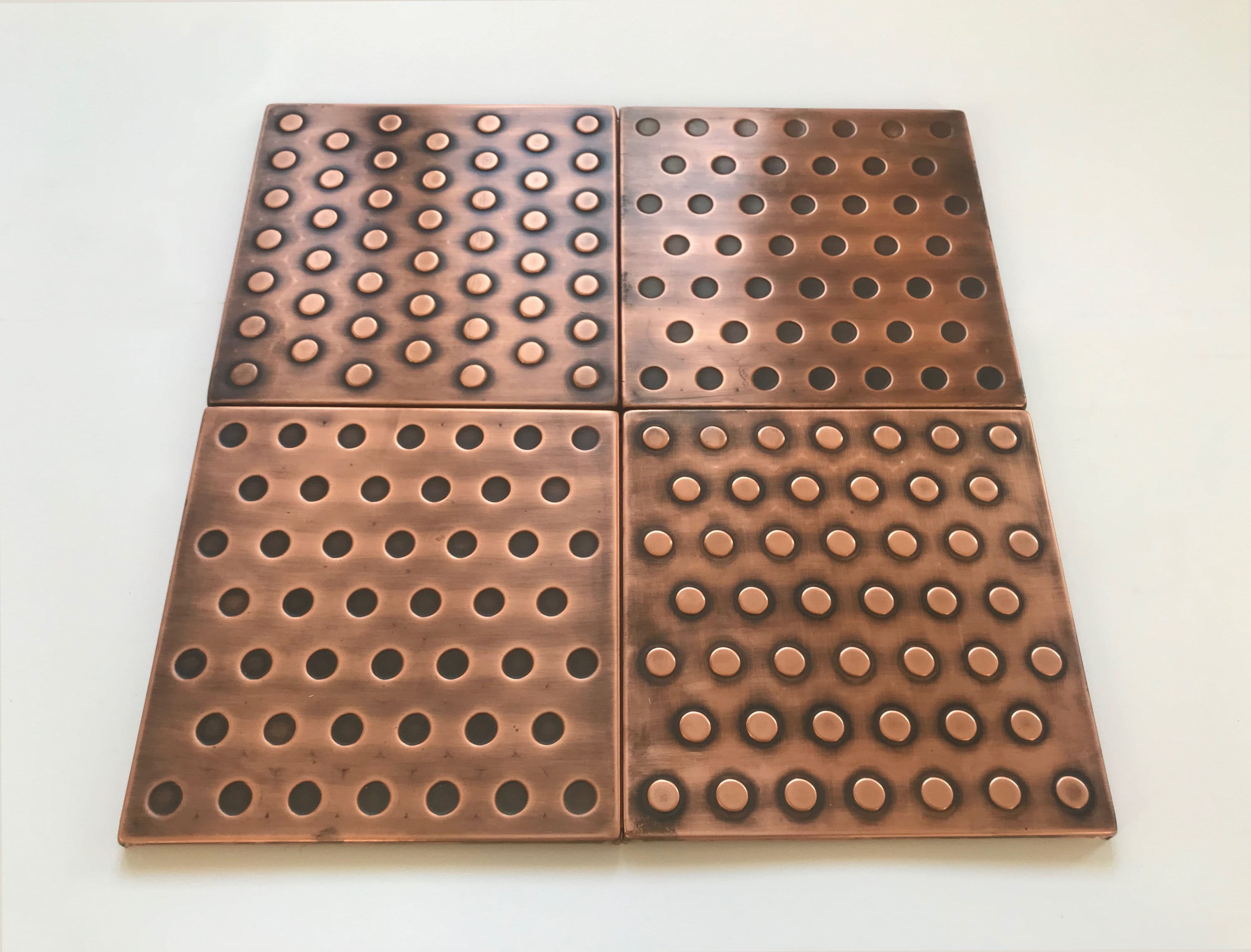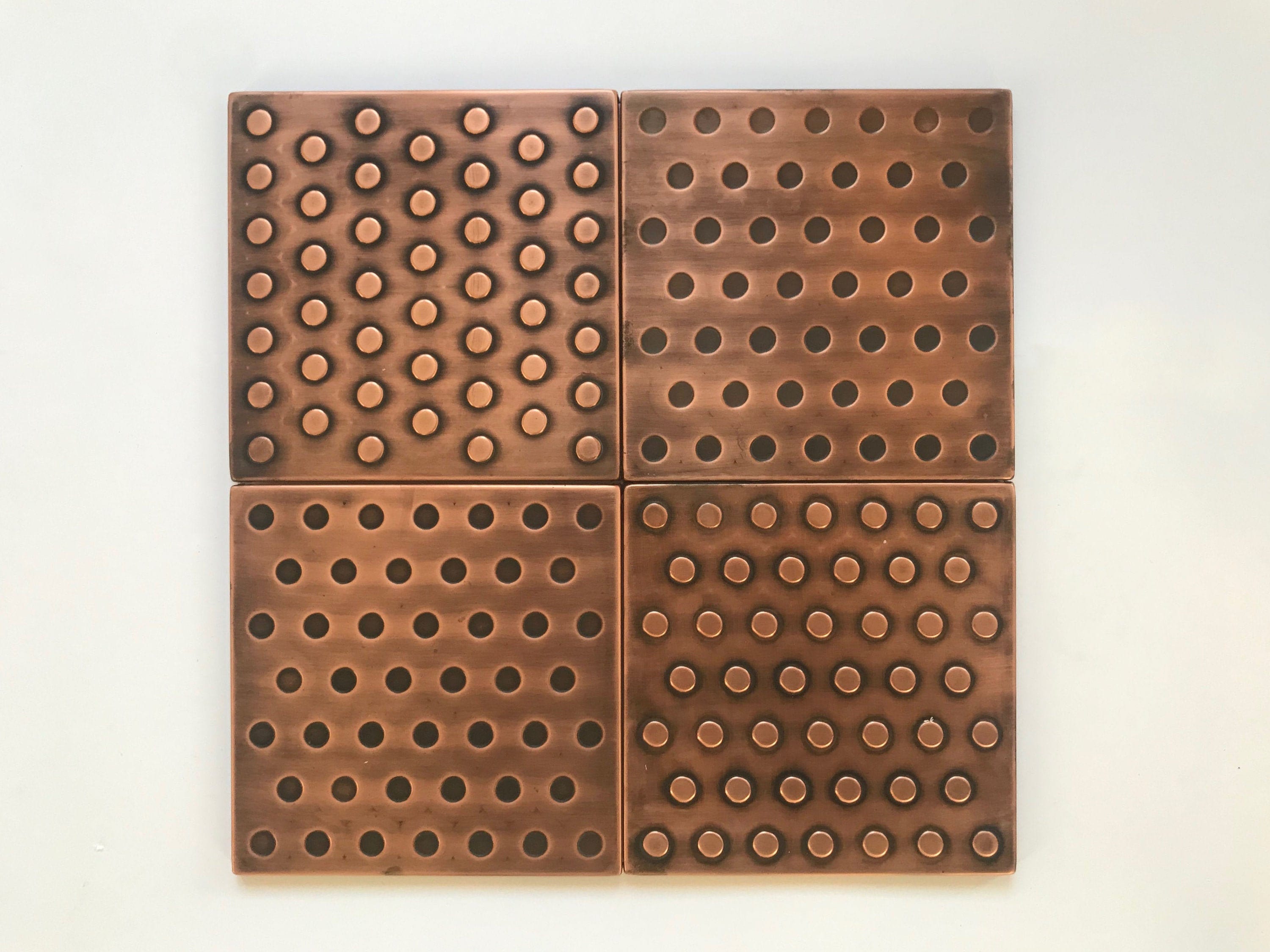 This set of 4 "polka dots" tiles is a great solution for someone who wants to create their own composition. It can be used solo or arranged with many different patterns (for example our mosaic copper or brass tiles) or it can surround plain copper or brass tiles.