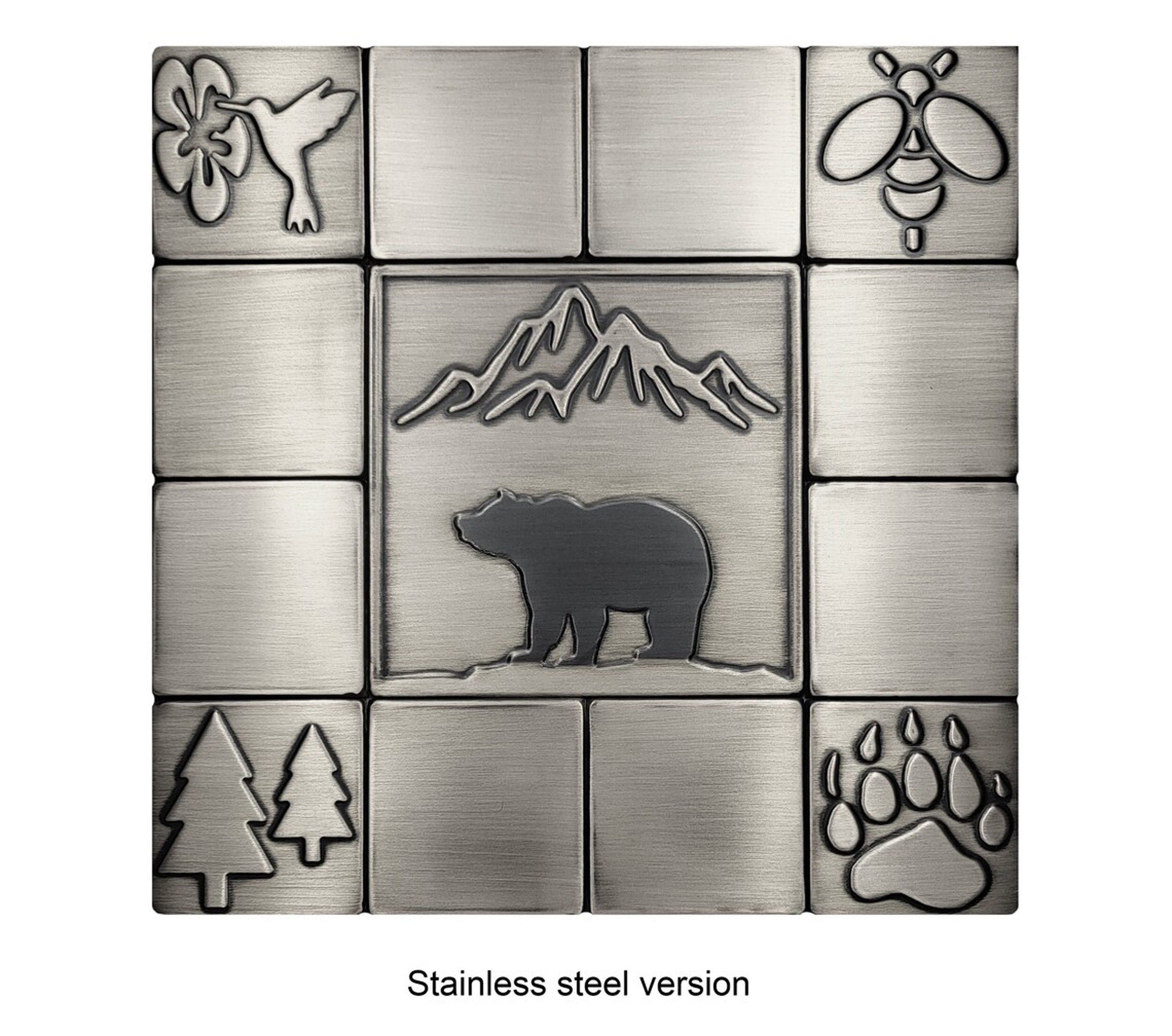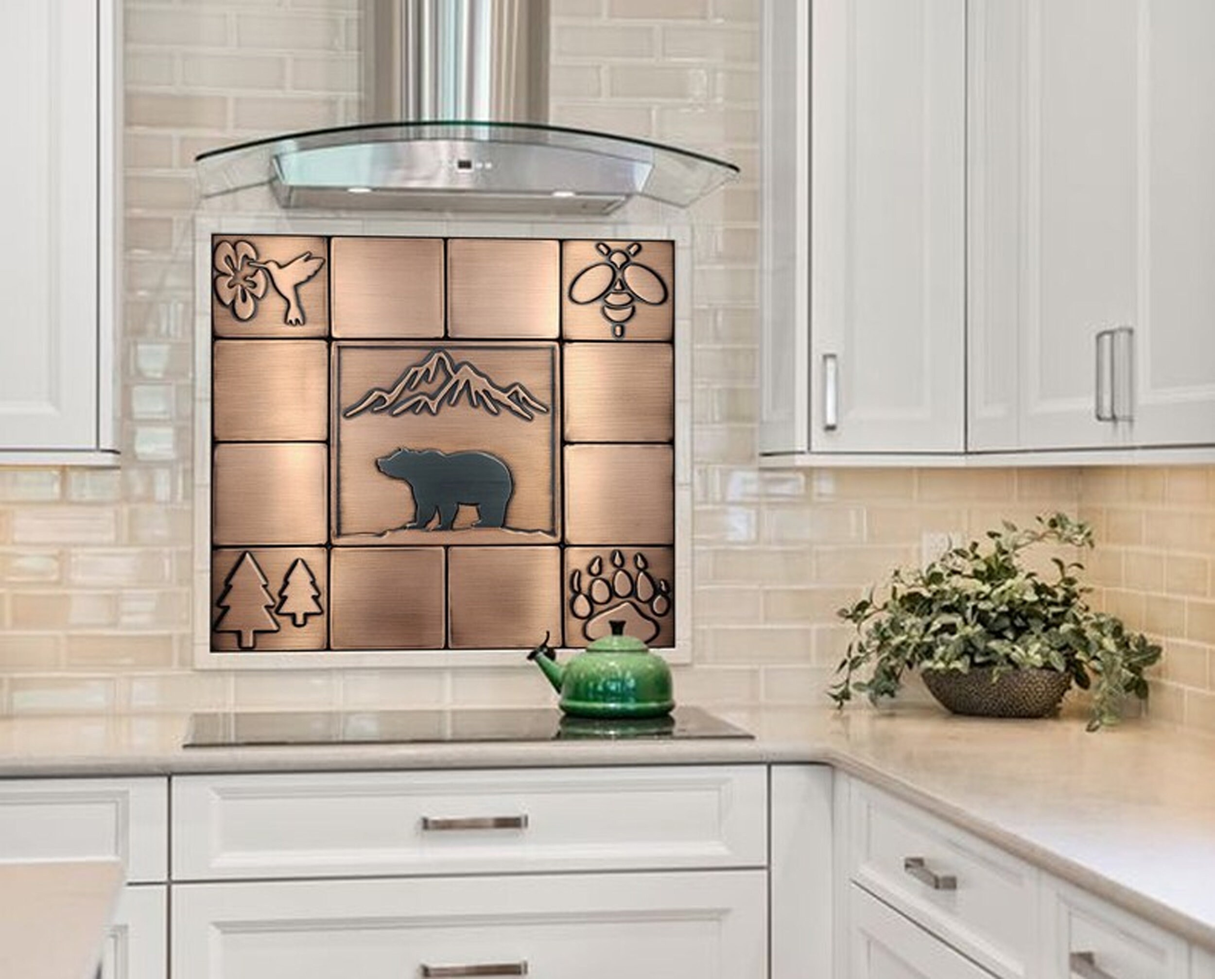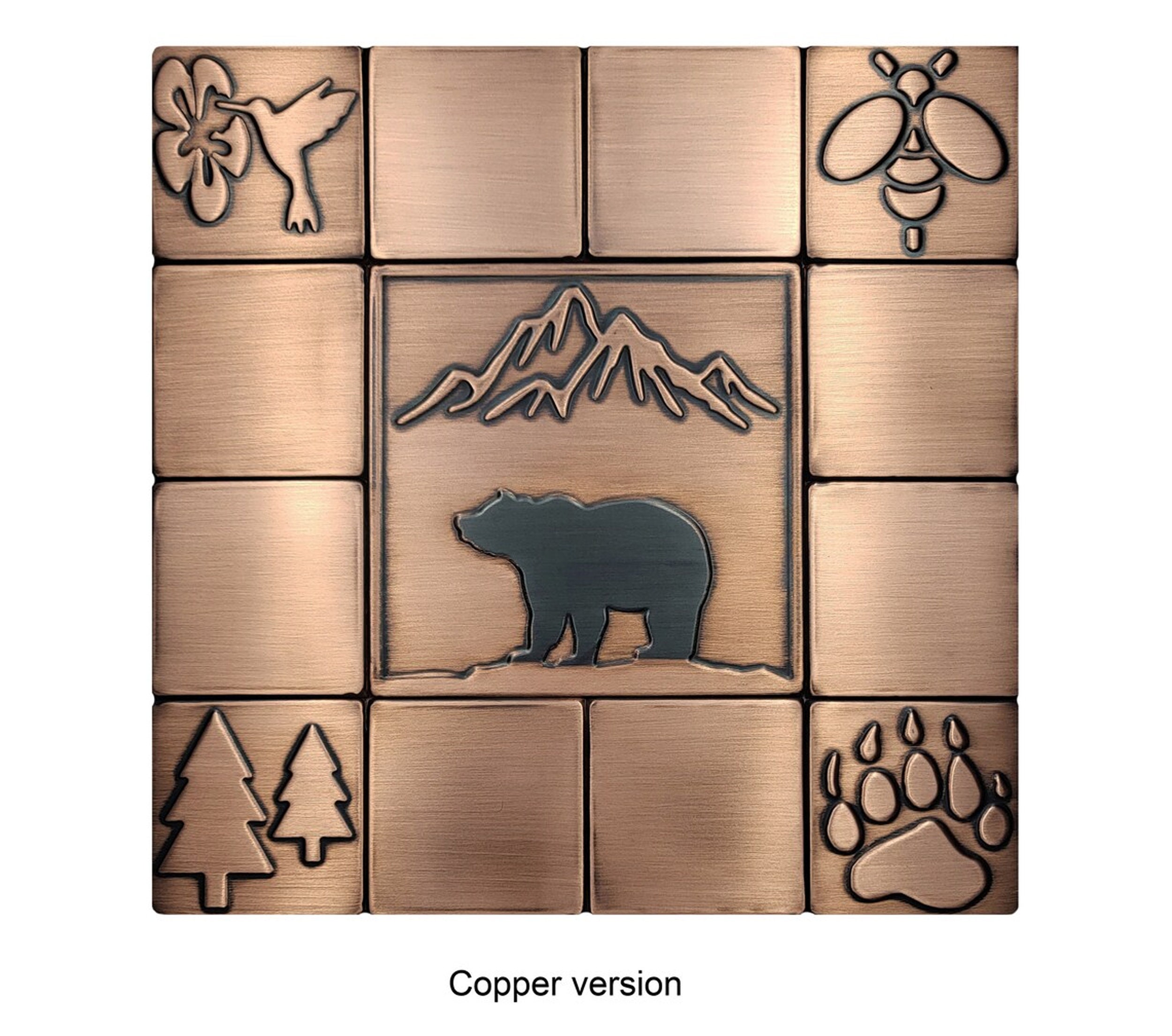 Bear and mountains - - Set of 13 Handmade tiles - 100% Copper, Stainless Steel or Brass. The perfect backsplash for bear lovers.