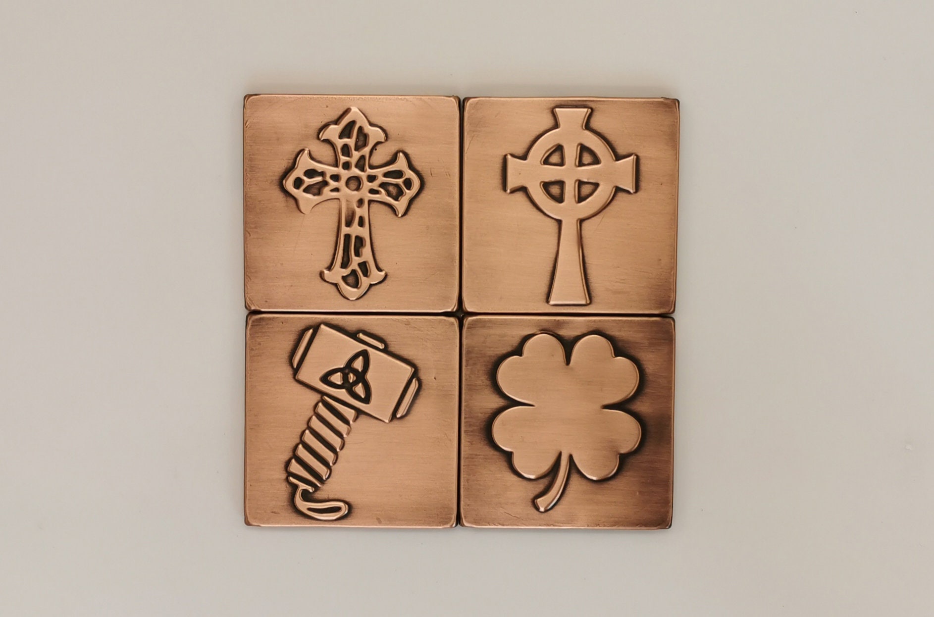 Thor's hammer, celtic cross, cross, clover - set of 4 handmade tiles 100% Copper!