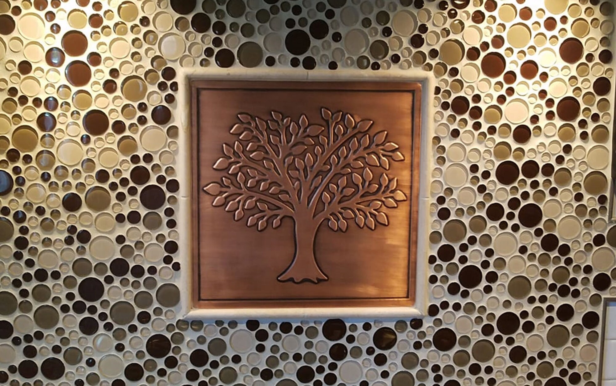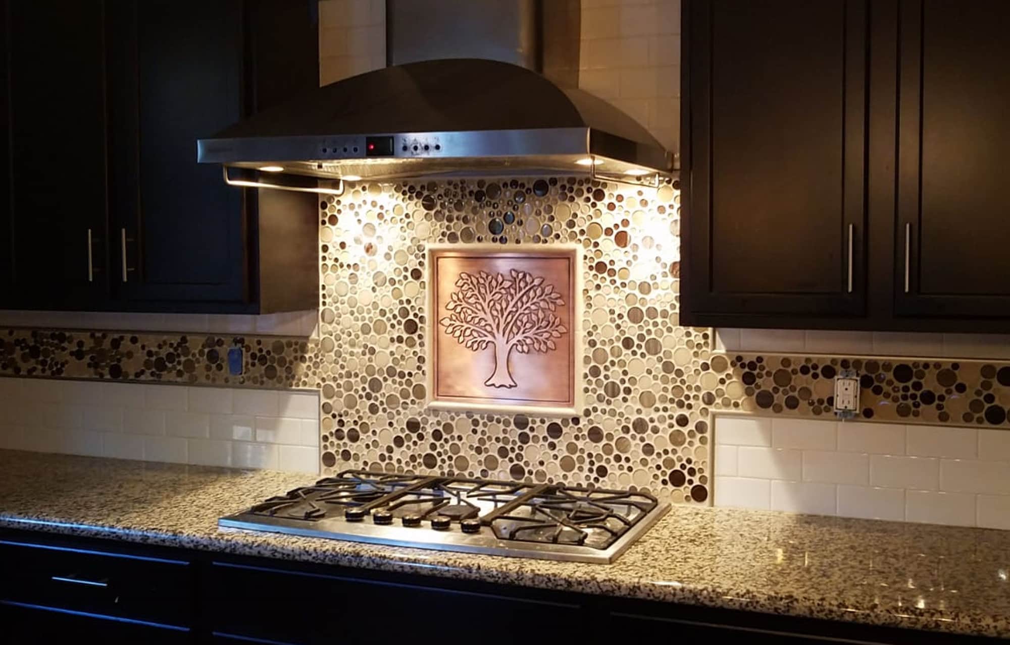 This handmade copper backsplash tile shows a metaphor and a research tool introduced by Darwin in order to visualize his view on relationships between living and extinct creatures, as well as similarities between different species. Since the tree of life raises a timeless question of life and evanescence, it is an extremely popular theme in contemporary art.