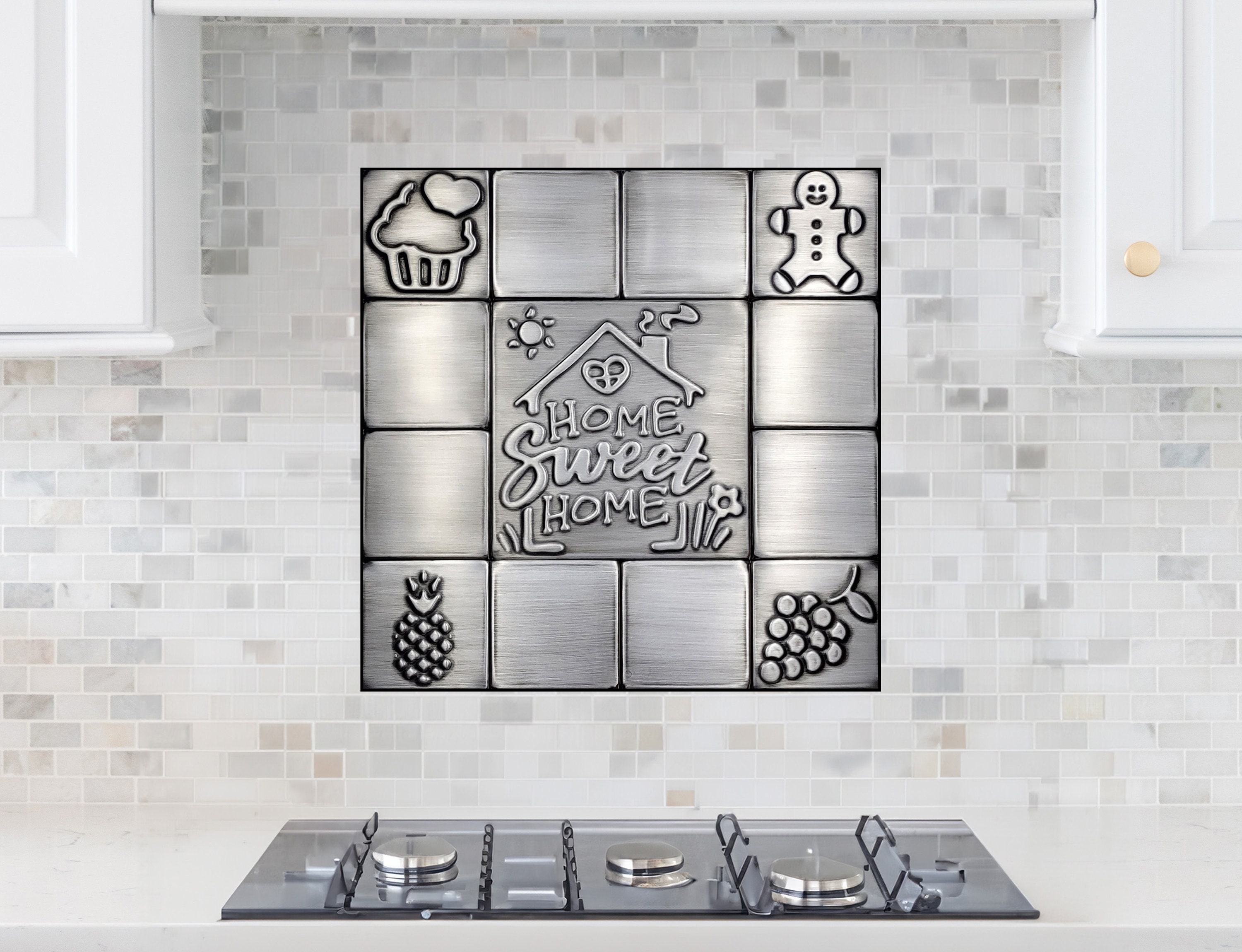 You can divide people into two groups… Those who agree with Roman philosopher, Pliny the Elder and believe that 'home is where the heart is' and - on the contrary - enthusiasts of art, home decor and design who keen on nesting in a stylish way. The second group will find this handmade piece of art enchanting. Having this tile at home, one can express how much having a home means. The main tile is surrounded with all the themes which remind me of a real home - delicious food, happy days and cozy nights we spend there. However, my compositions are 100% custom, therefore the set of the copper tiles shown on the picture is only a sample - you decide what you would like to surround your backsplash tile with.