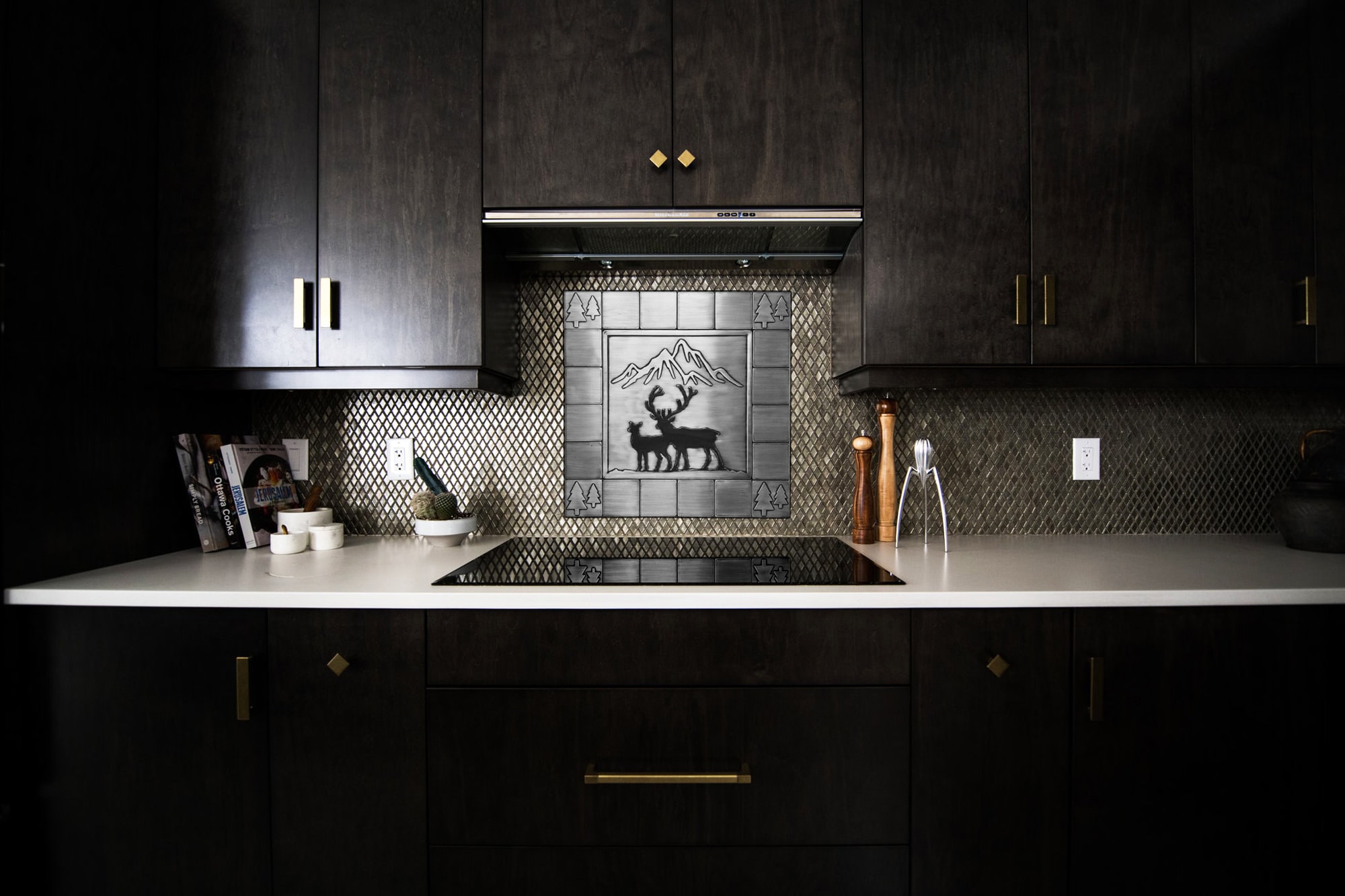 Bring the spirit of the outdoors into your home with this detailed metal backsplash featuring a majestic deer family and towering mountain peaks. A handcrafted piece of functional art, this 21-tile set is perfect for anyone who loves rustic cabins, alpine views, or serene wildlife themes.