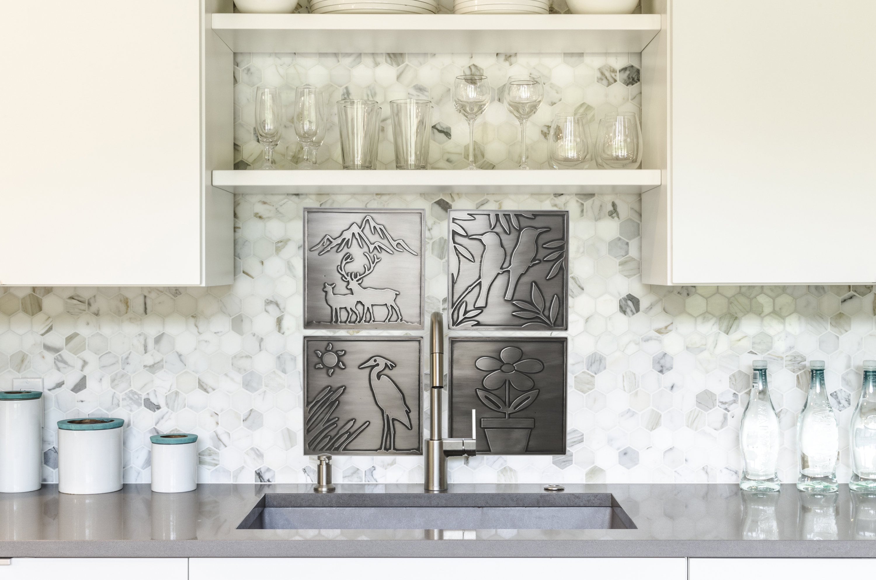 Nature - birds, flower, heron, deer and mountains - Set of 4 Handmade tiles,- Copper, Brass or Stainless Steel