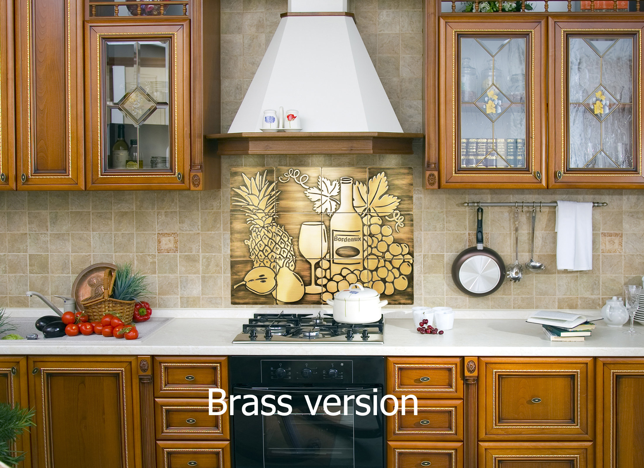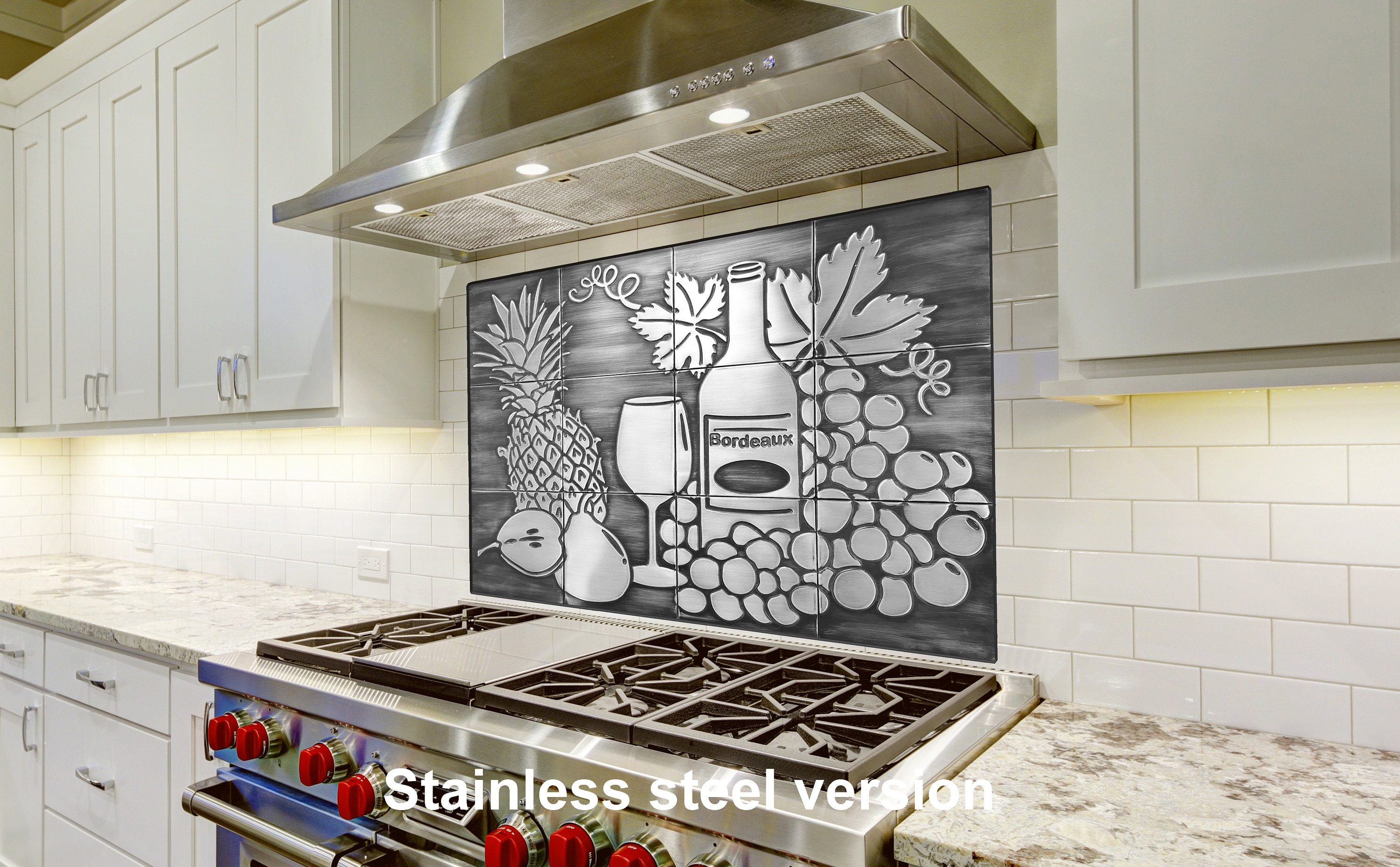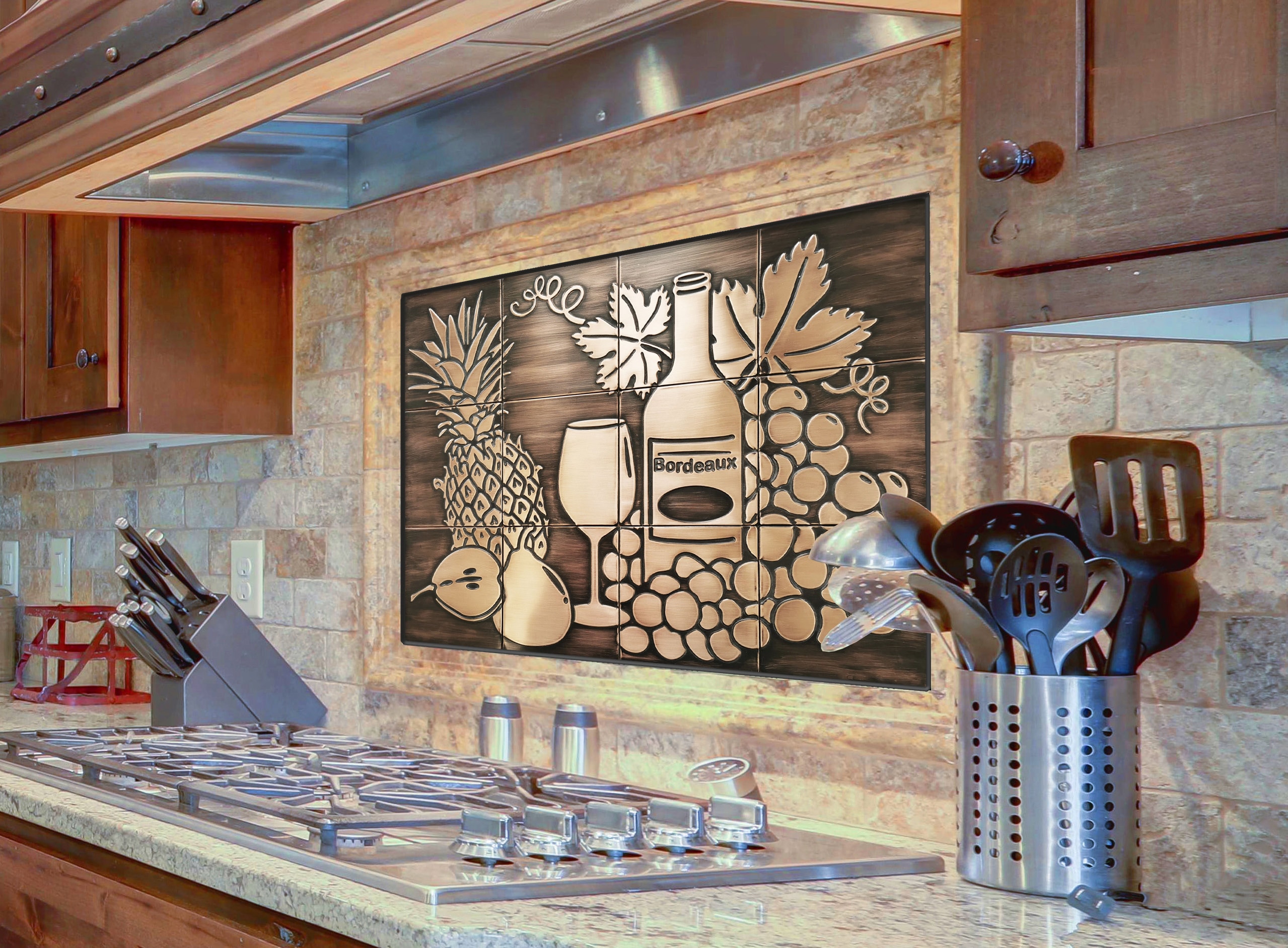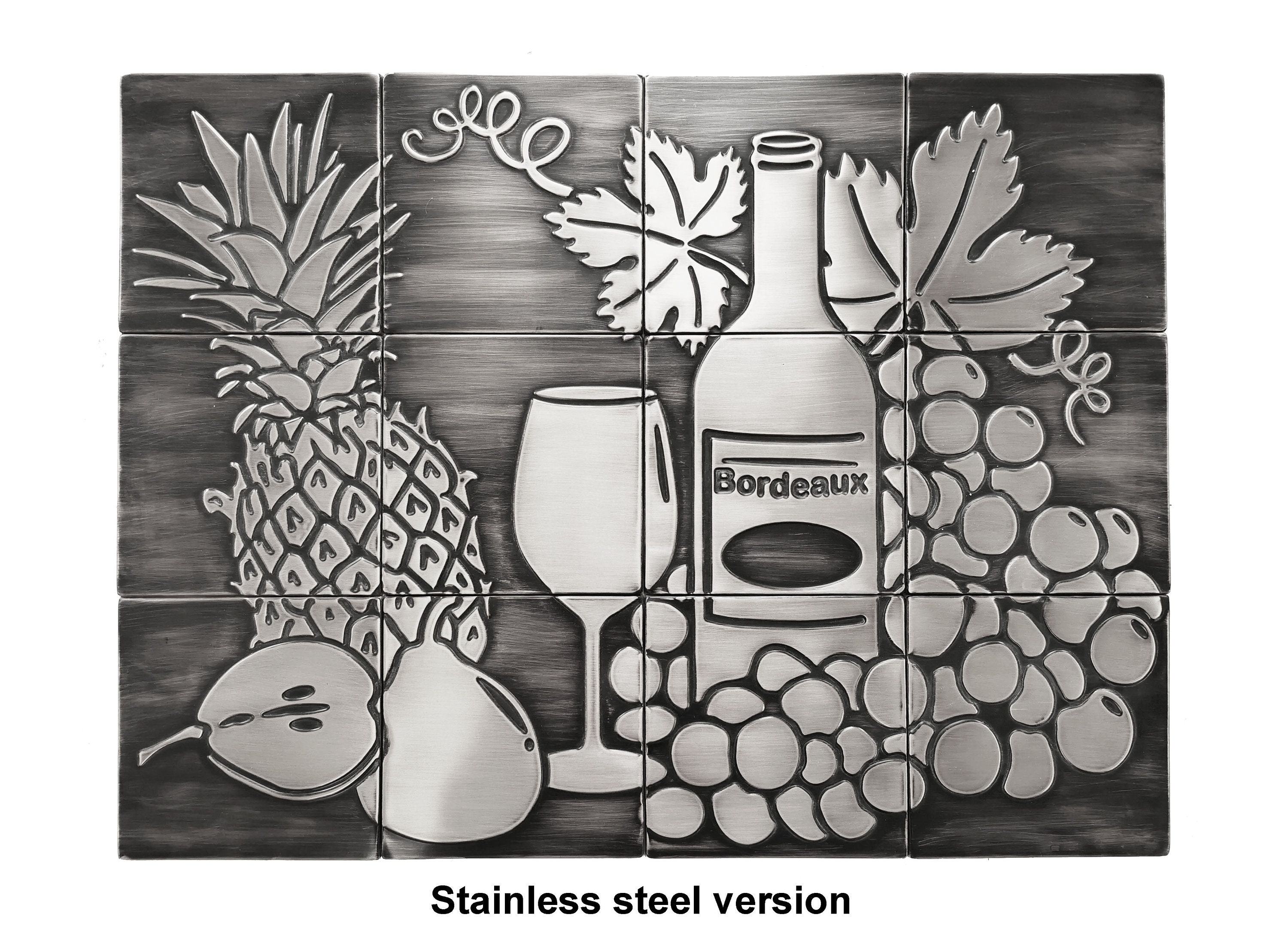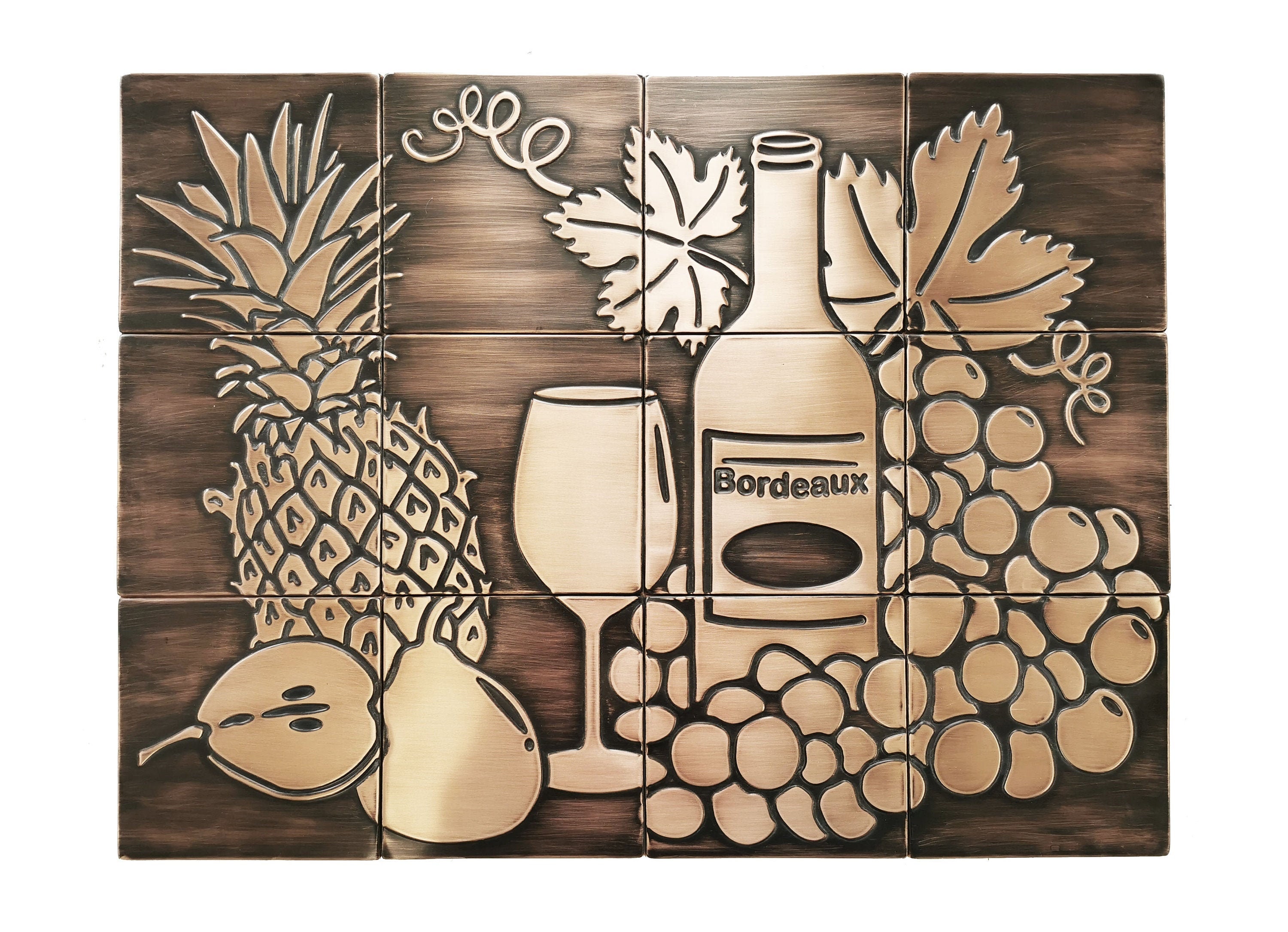 Still life, grapes, pineapples, wine, pear - set of 12 handmade 100% Copper, Stainless Steel or Brass backsplash