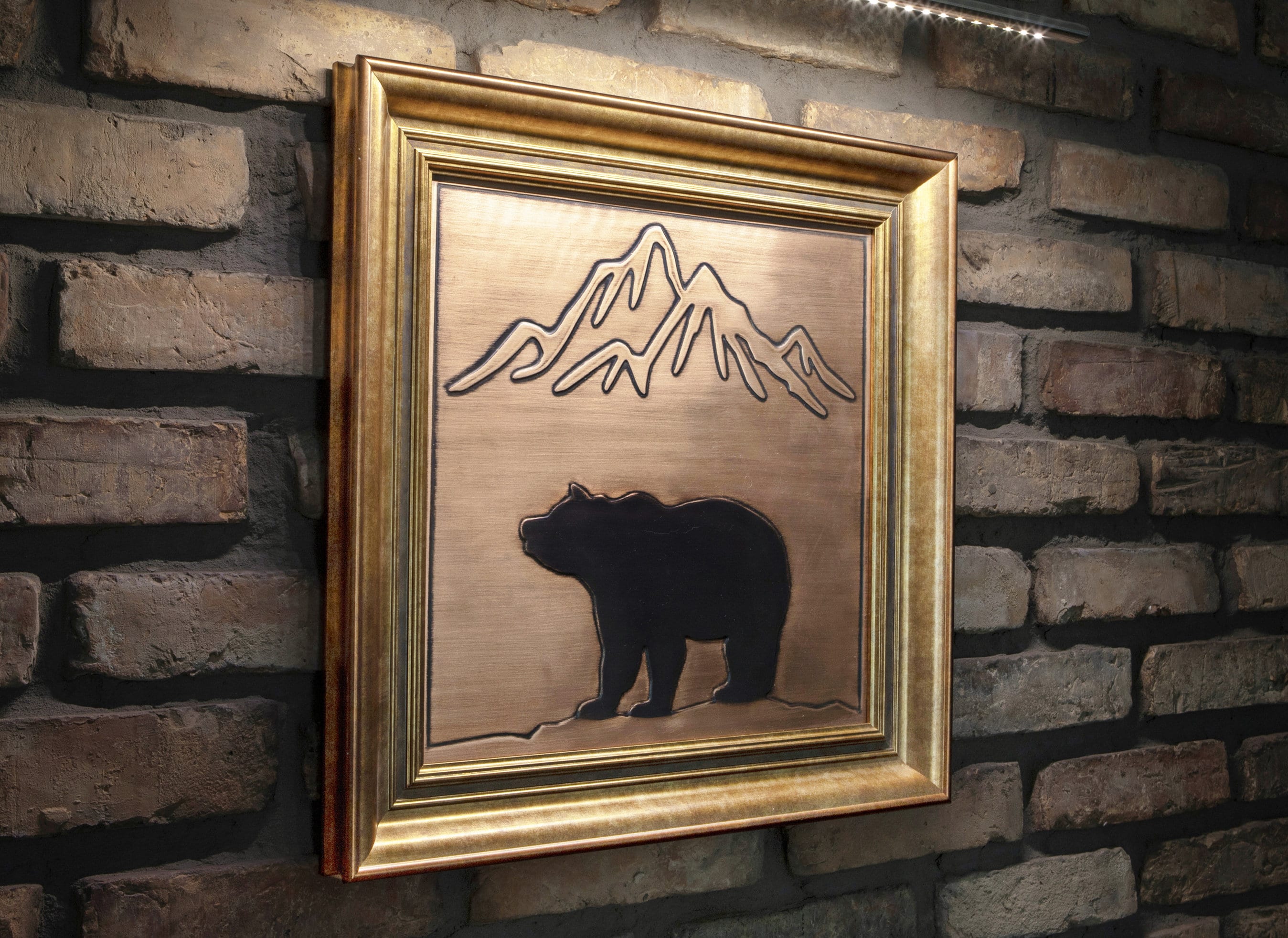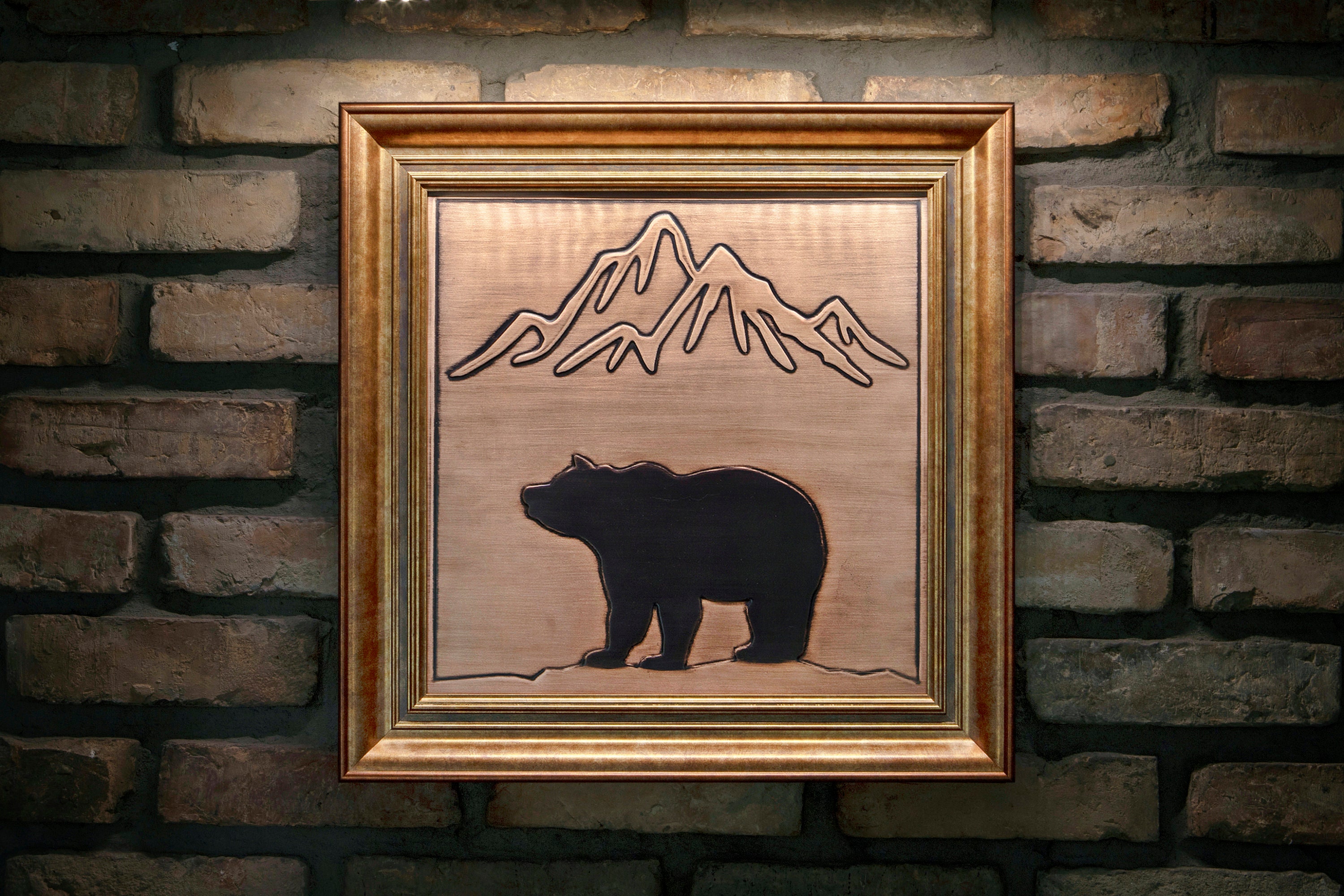 Bear and mountains framed in a beautiful, unique wooden frame. Handmade - 100% Copper and wood