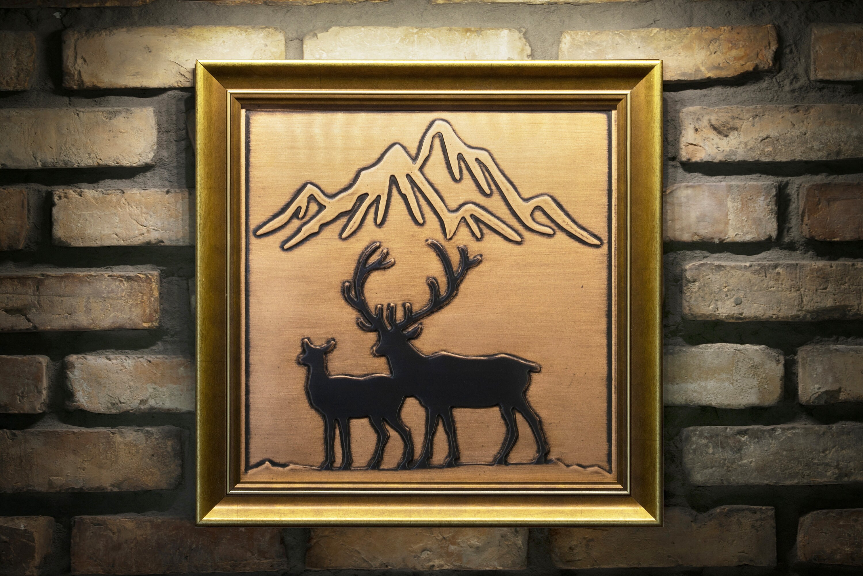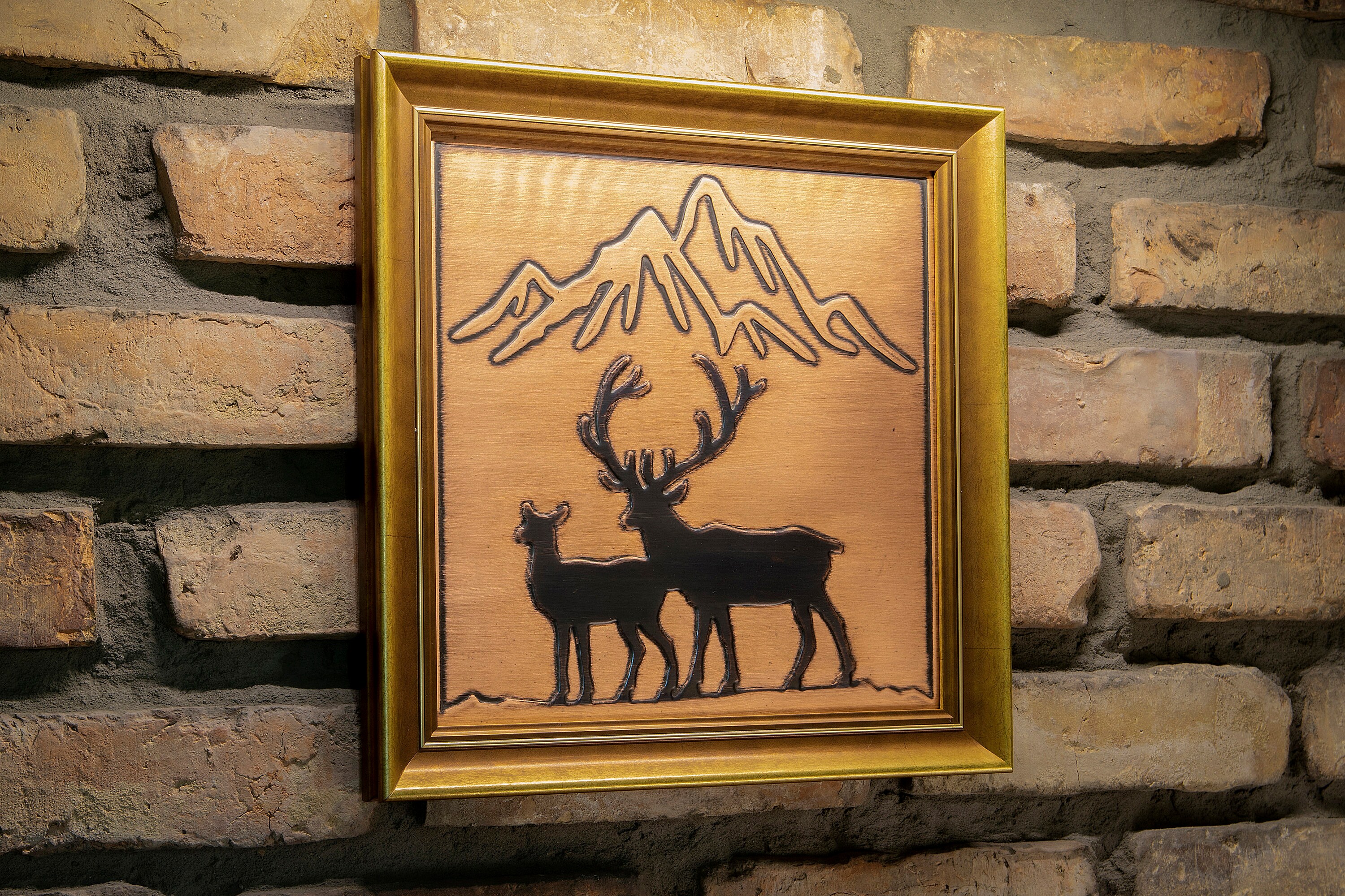 Deer and mountains in a beautiful wooden frame. Handmade, 100% copper and wood