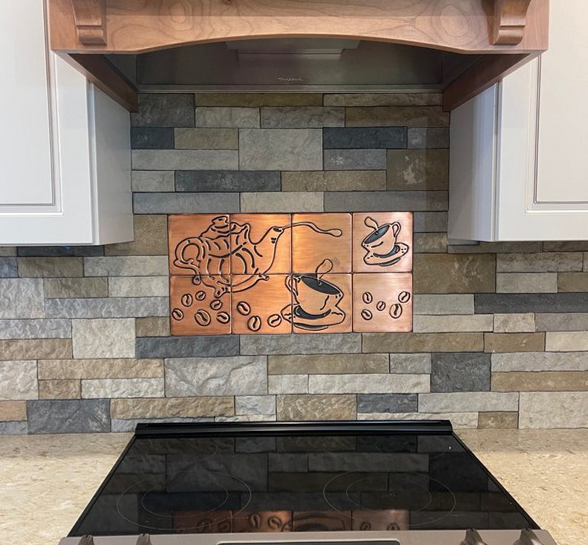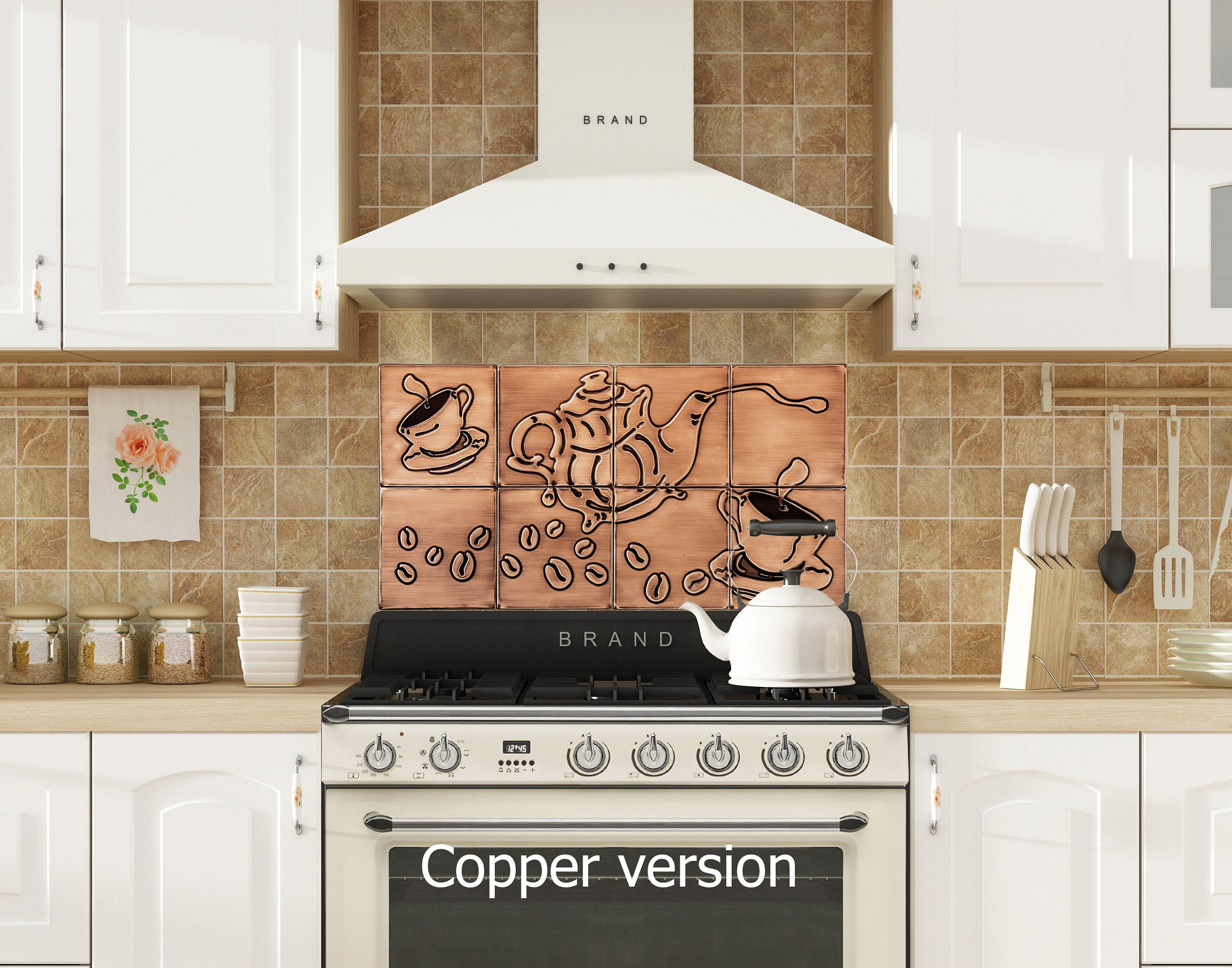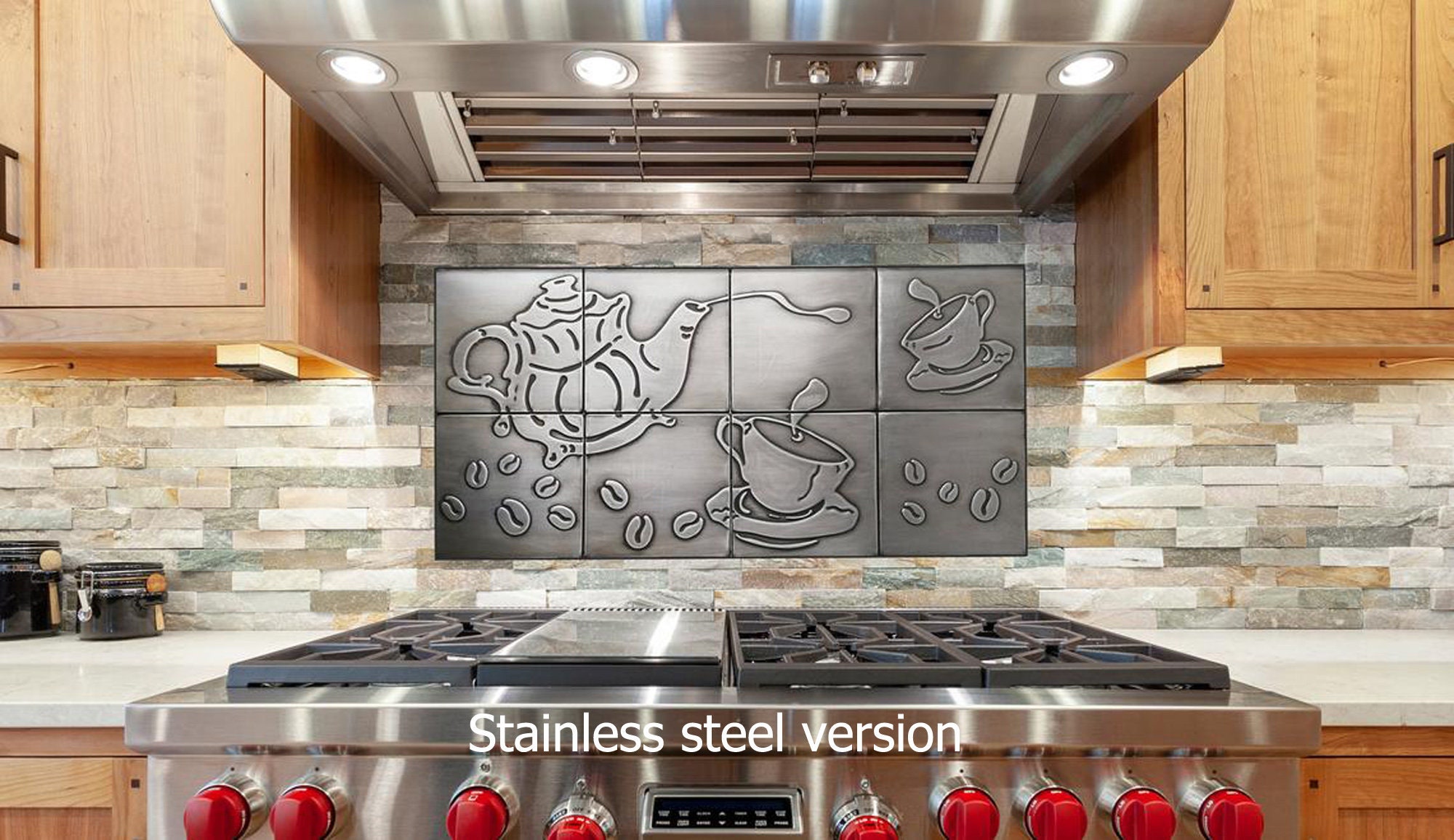 Coffee pot and cups - 8 Handmade 100% Copper, Stainless steel or Brass Tiles. The perfect backsplash for coffee lovers.